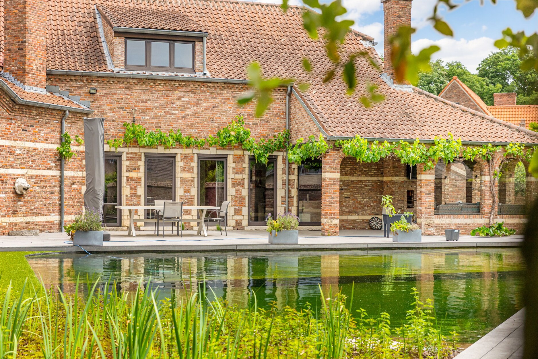 De leefruimtes kijken uit op een prachtig aangelegde tuin met vijver, een oase van rust.