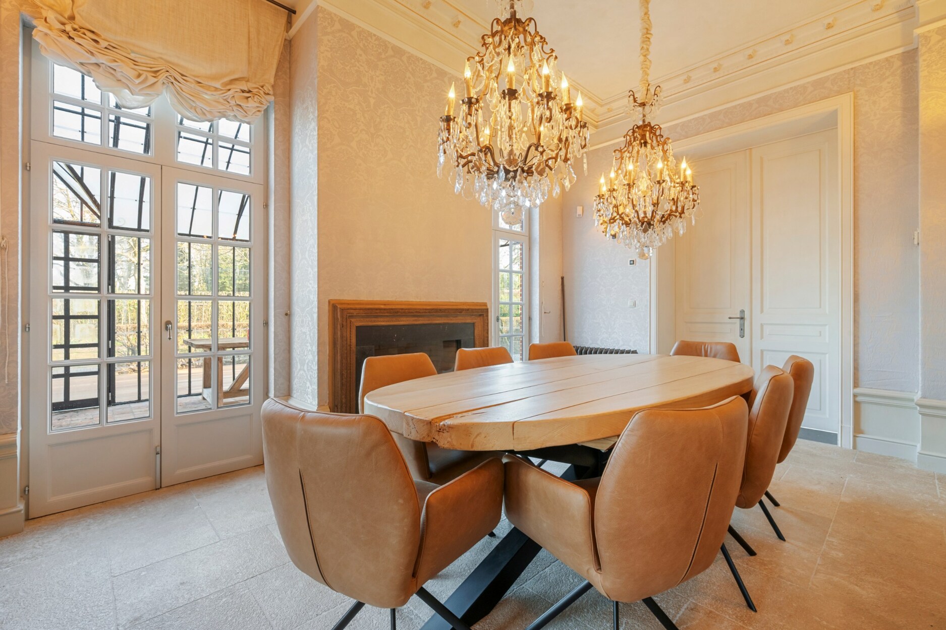 Via de statige inkomhal met indrukwekkend gewelfd plafond betreed je de woning. Deze geeft toegang tot de sfeervolle leefruimtes en de keuken. De woonkamer is opgedeeld in een gezellig salon en een ruime eetkamer, ideaal voor het ontvangen van gasten en het organiseren van diners. Grote openslaande deuren leiden naar de lichtrijke serre, waar je in alle rust kan genieten van het uitzicht op de tuin. Zowel het salon als de eetkamer zijn uitgerust met een gashaard, wat zorgt voor extra warmte en gezelligheid.