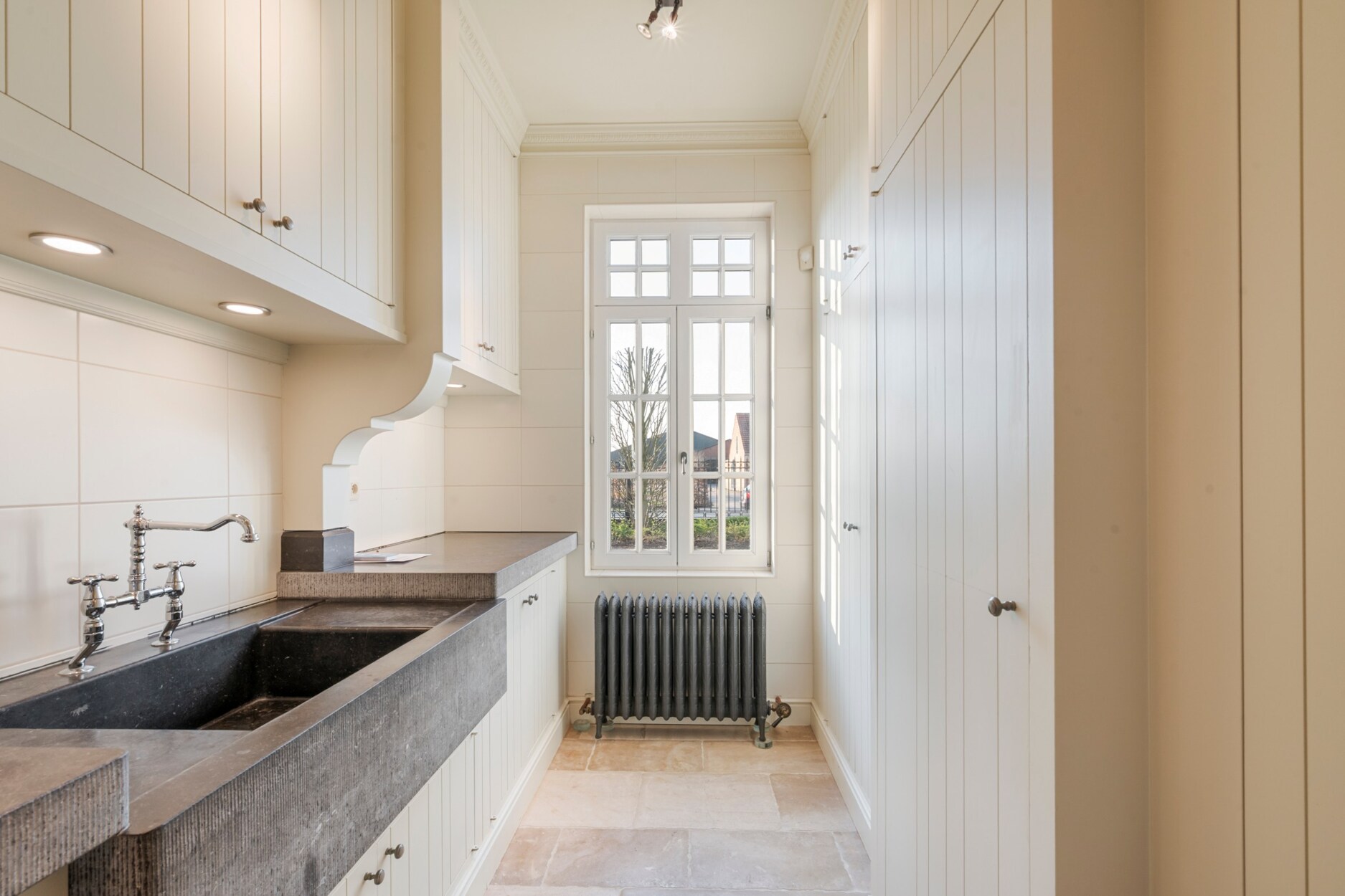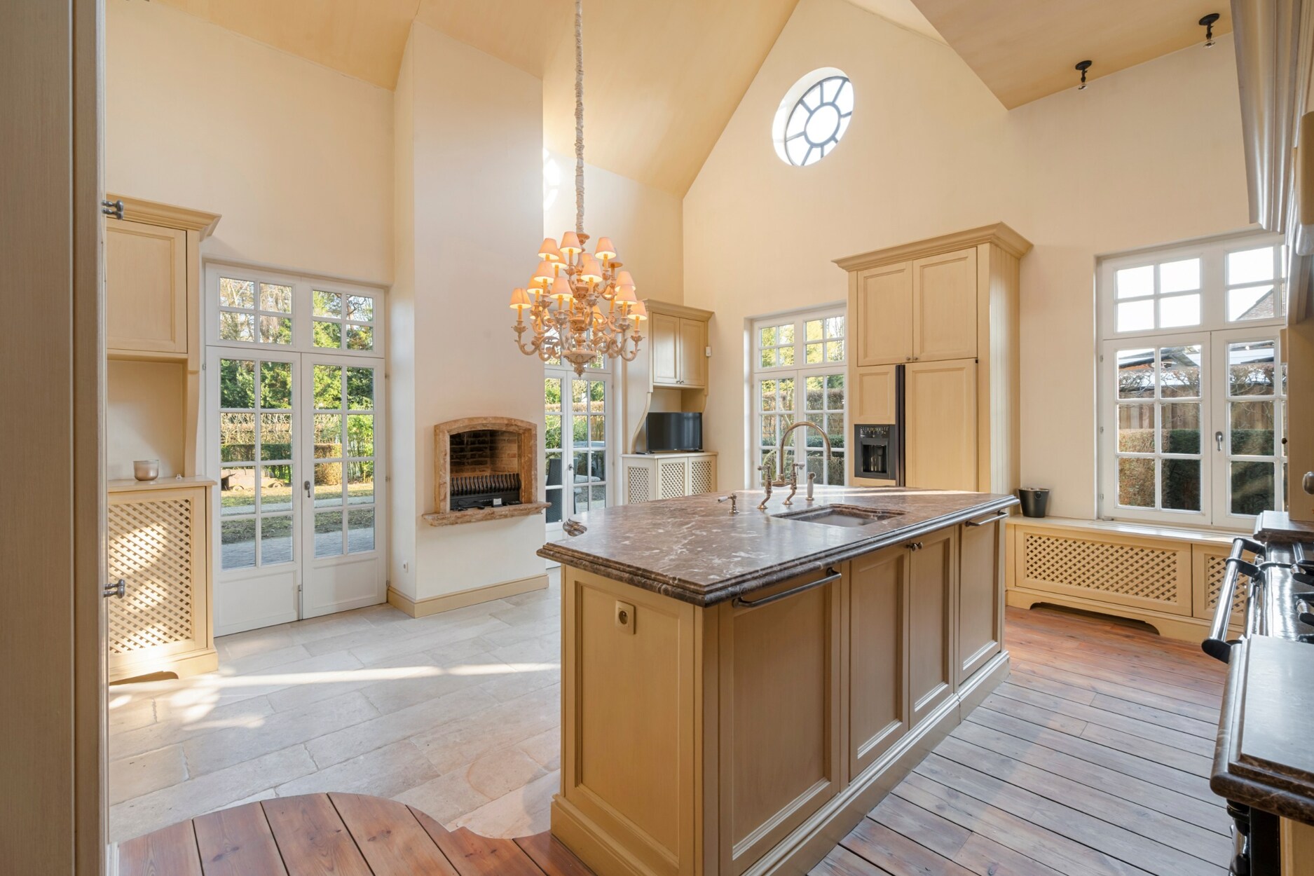 De luxueuze keuken is een echte eyecatcher, met zicht op de tuin en een warme, uitnodigende sfeer dankzij de open haard. Ze beschikt over een royaal kookgedeelte met onder andere een authentiek AGA-gasfornuis met vier ovens. Aansluitend vind je een praktische en volledig ingerichte bijkeuken.