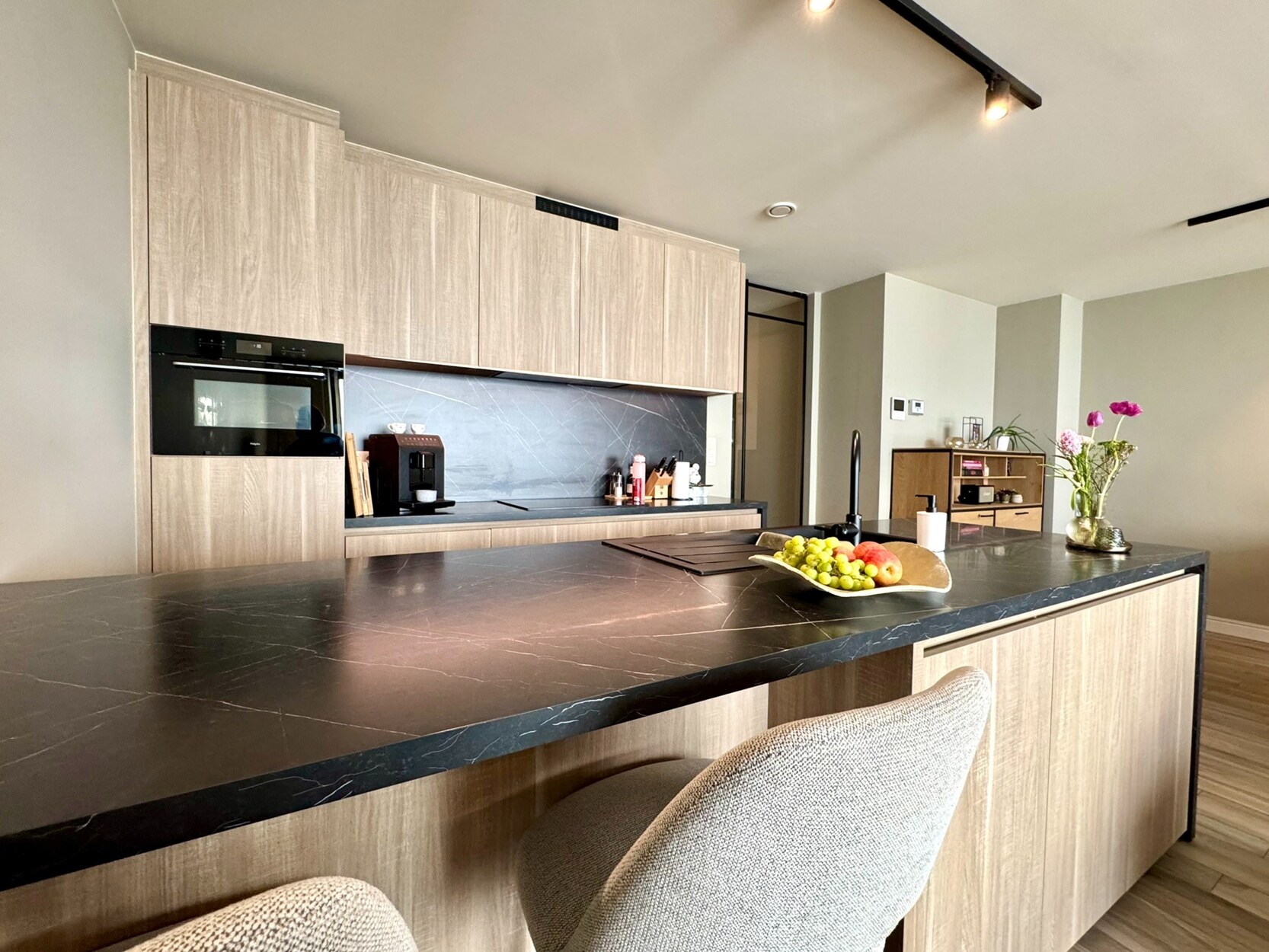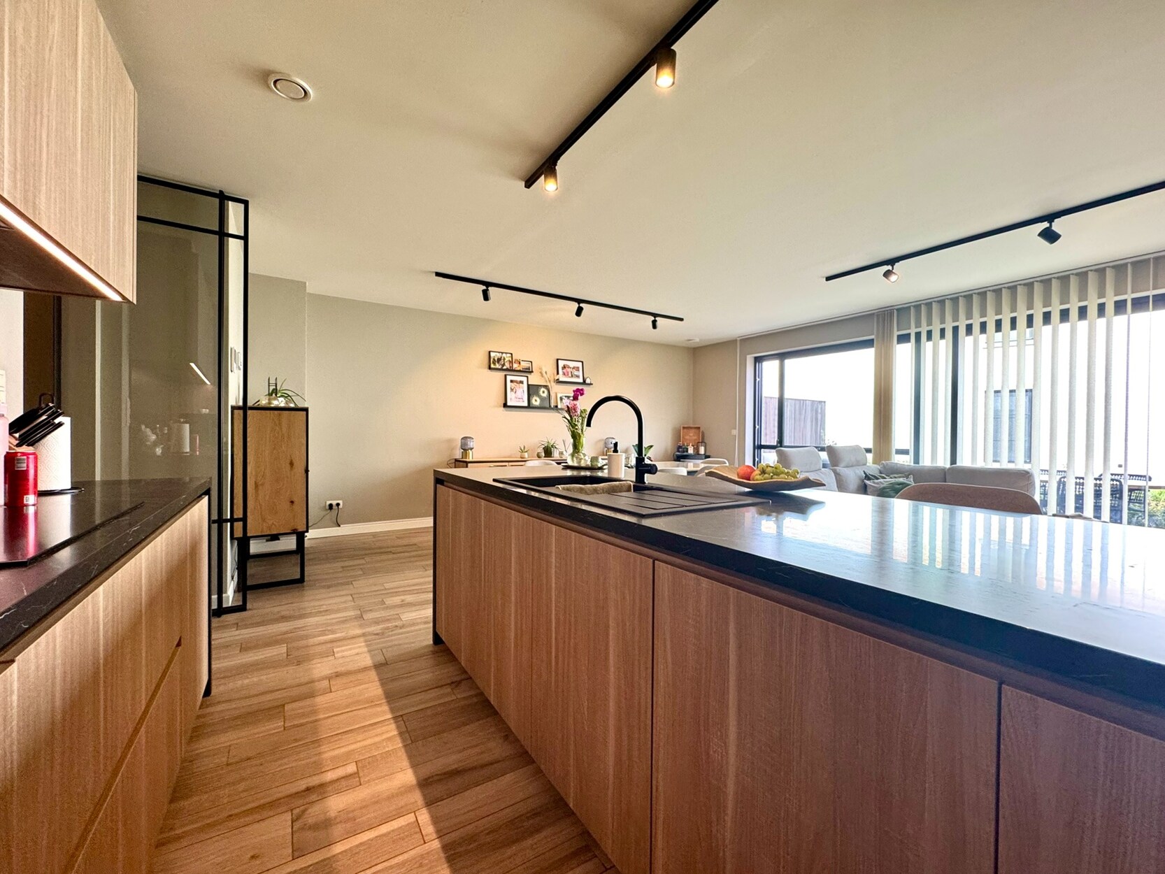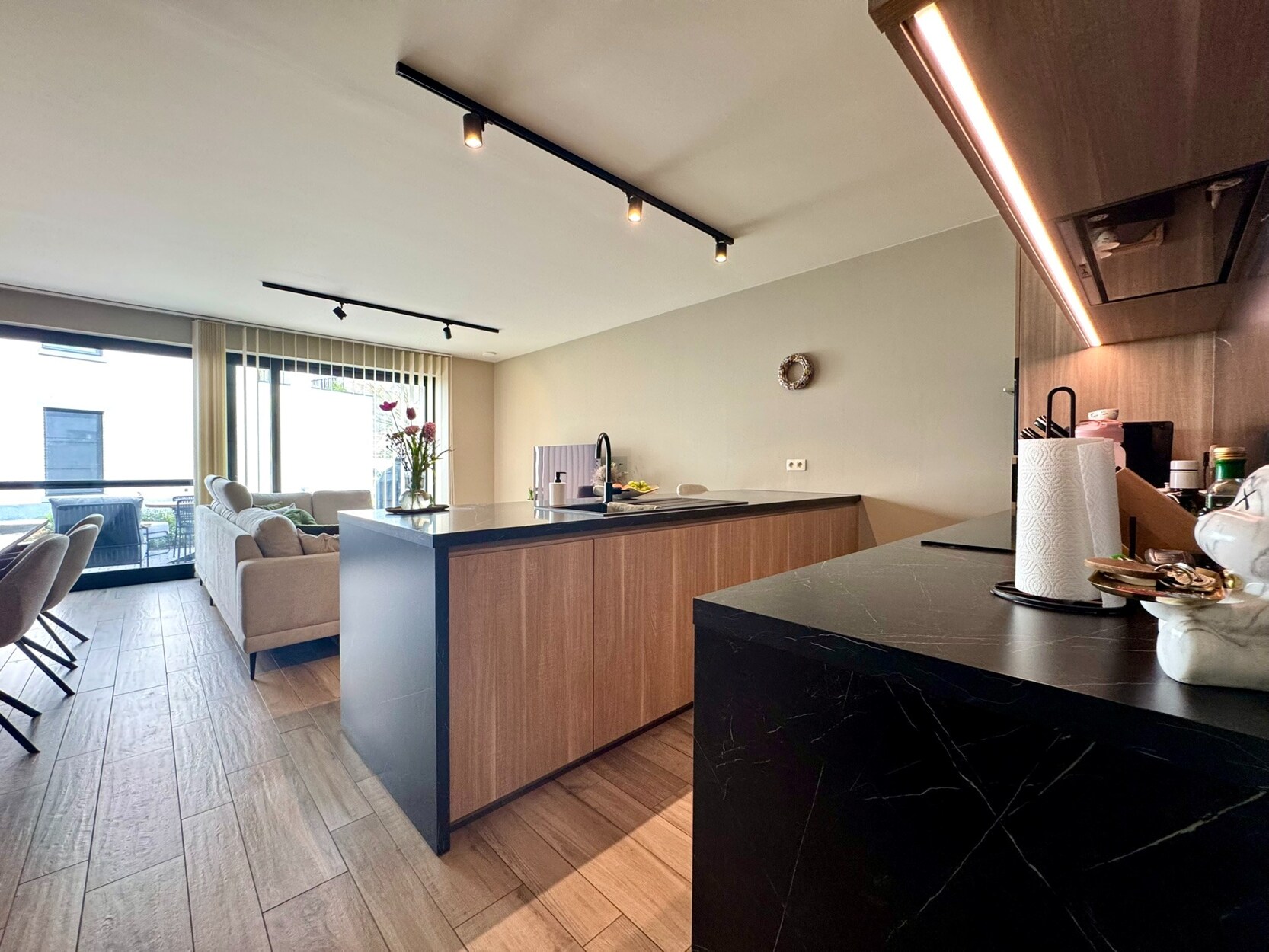 Aan de achterzijde bevindt zich de woonkamer die uiterst licht is door de brede raampartij. Hier is voldoende ruimte om een zithoek te creëren en een eettafel te plaatsen. Van hieruit kan je naar het ruime en uiterst gezellige terras (18m²) in het groen. De open keuken met eiland is toch wel de blikvanger! Prachtig werkblad en voorzien van een inductievuur, vaatwasser, combi-oven en koelkast. De smaakvolle verlichting krijg je er als bonus bij.