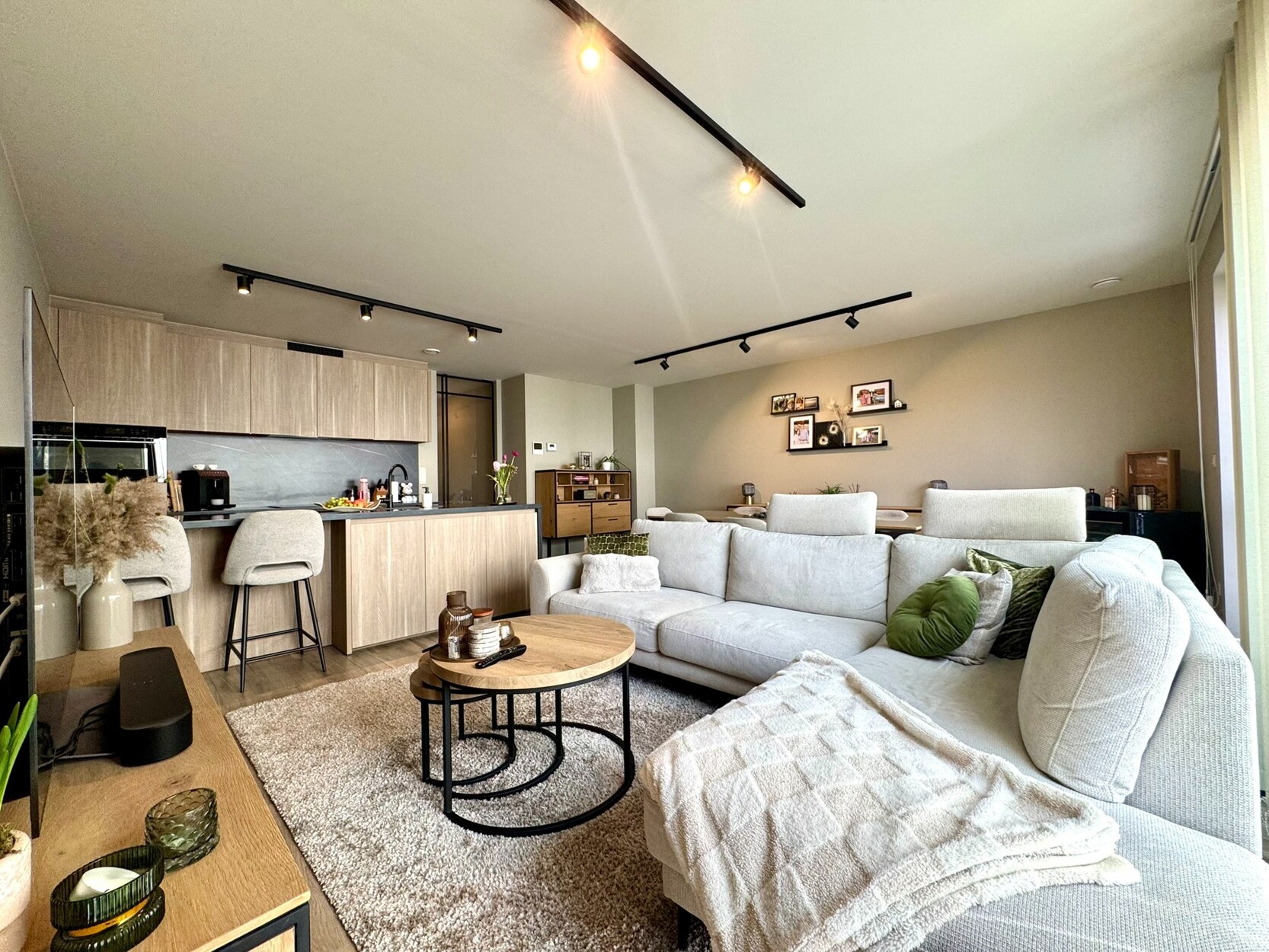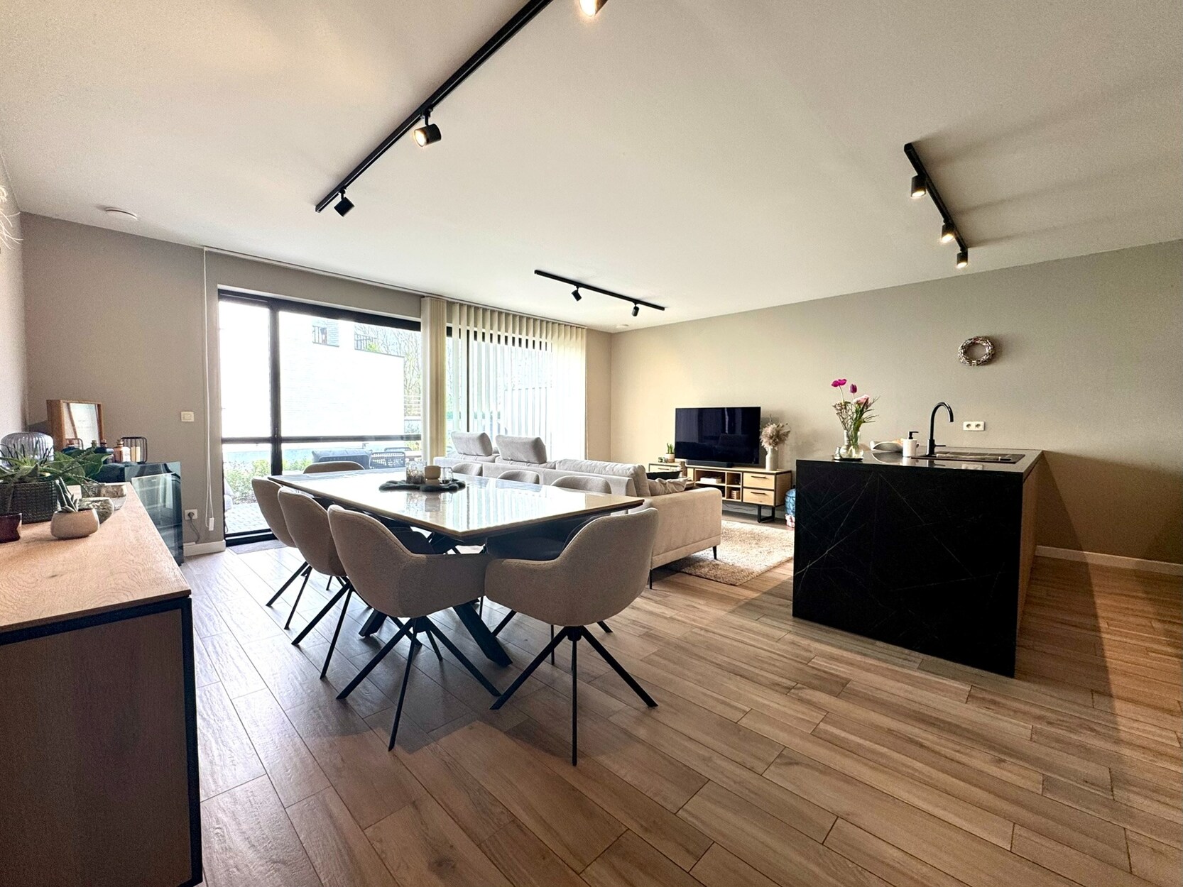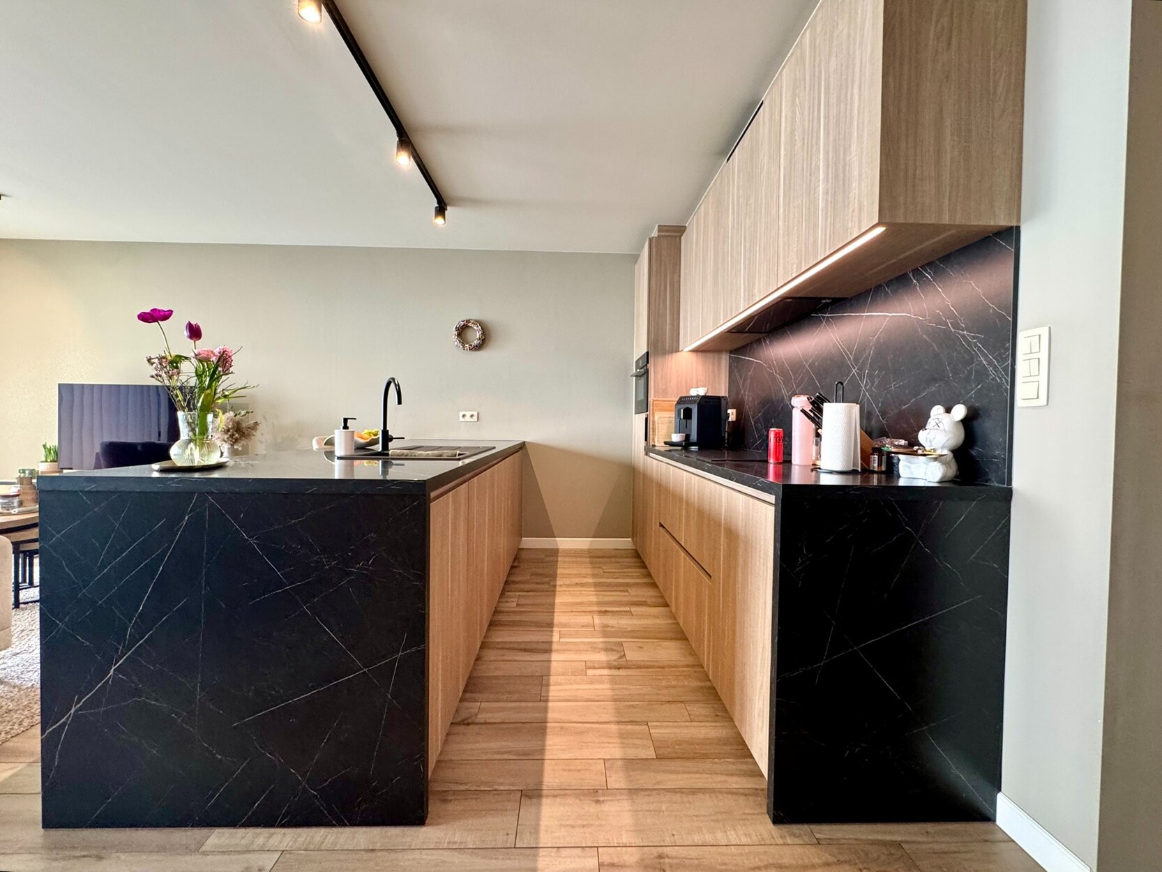 Aan de achterzijde bevindt zich de woonkamer die uiterst licht is door de brede raampartij. Hier is voldoende ruimte om een zithoek te creëren en een eettafel te plaatsen. Van hieruit kan je naar het ruime en uiterst gezellige terras (18m²) in het groen. De open keuken met eiland is toch wel de blikvanger! Prachtig werkblad en voorzien van een inductievuur, vaatwasser, combi-oven en koelkast. De smaakvolle verlichting krijg je er als bonus bij.