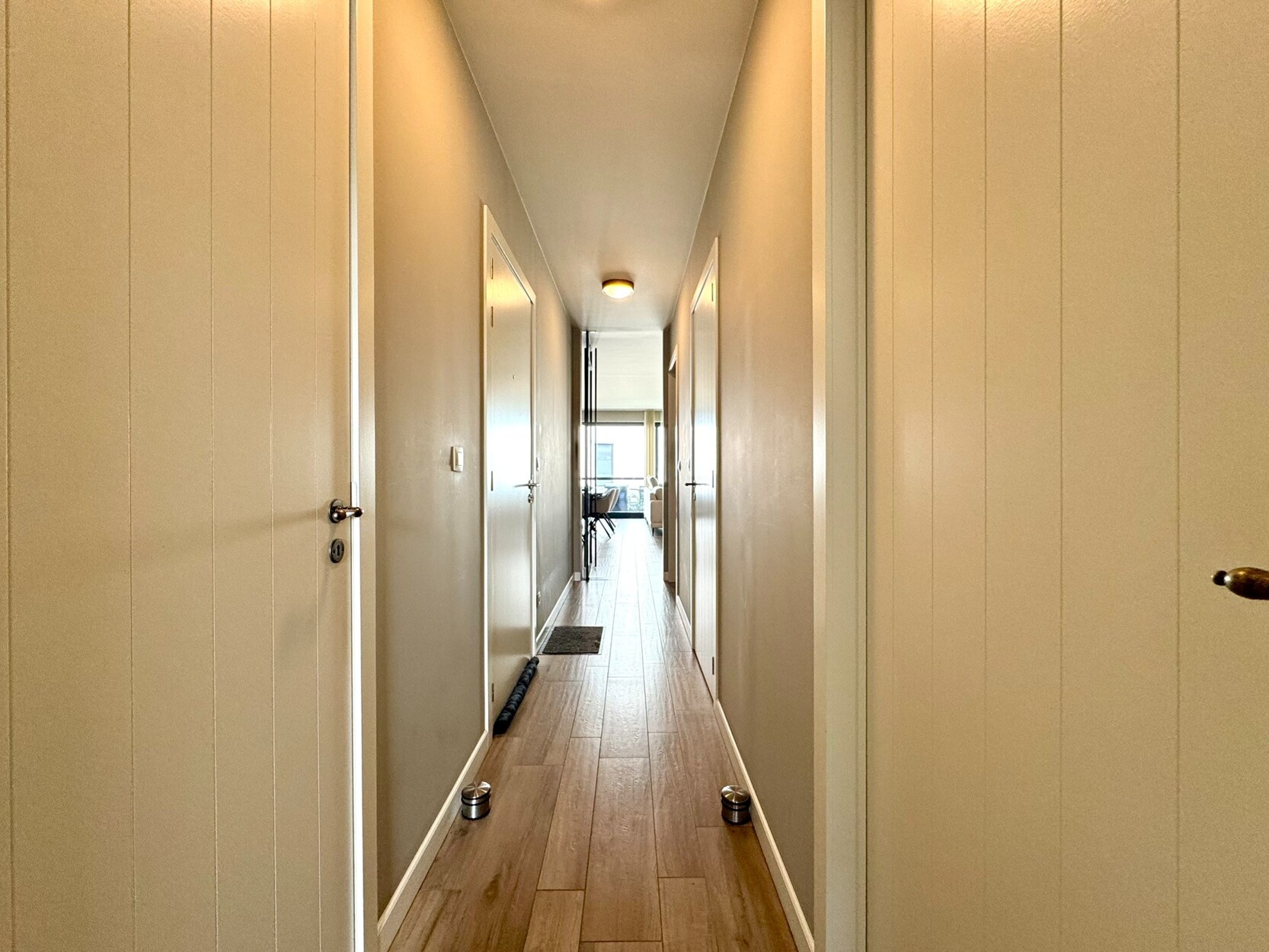Via een zwart stalen glazen deur kom je tot de hal. Hier bevindt zich de badkamer. Deze is ingericht met een wastafel, inloopdouche en praktische ingemaakte kast. De wasplaats heeft voorziening voor wasmachine en droogkast. De leidingen zijn hier netjes weggewerkt achter een wand. Verder is er nog een apart toilet en 2 slaapkamers met elektrische rolluiken.
