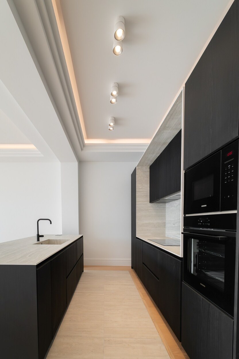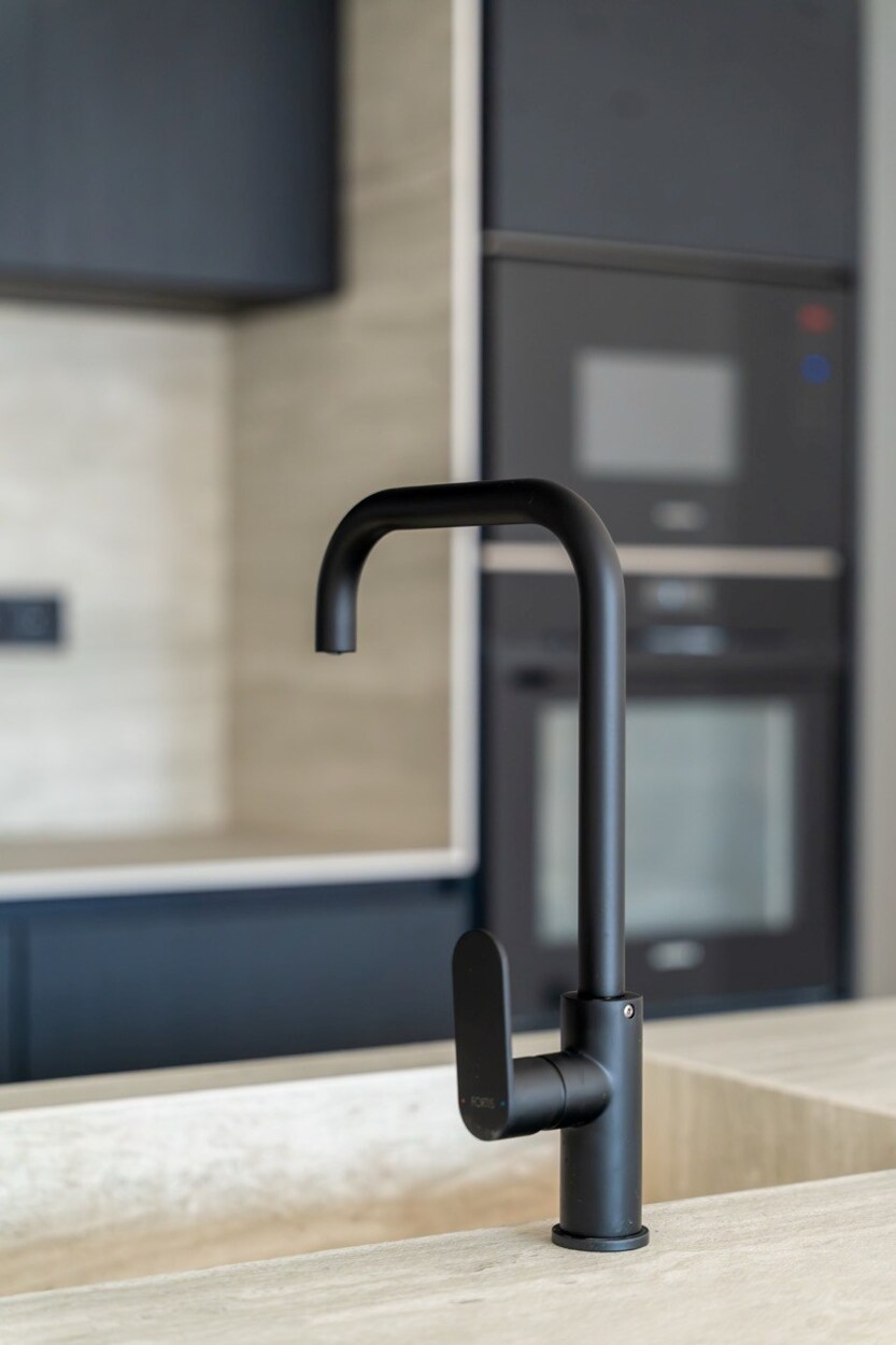 De open keuken sluit aan op de leefruimte en bestaat uit donker houten meubilair, een werkblad en spatwand in natuursteen, een centraal eiland met geïntegreerde spoelbak en zwarte kraan, evenals ingebouwde Siemens-toestellen.