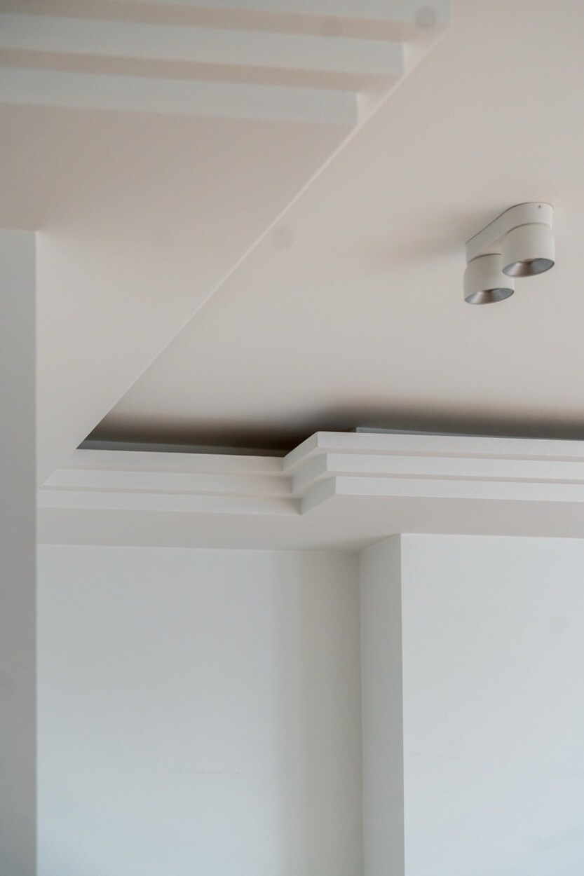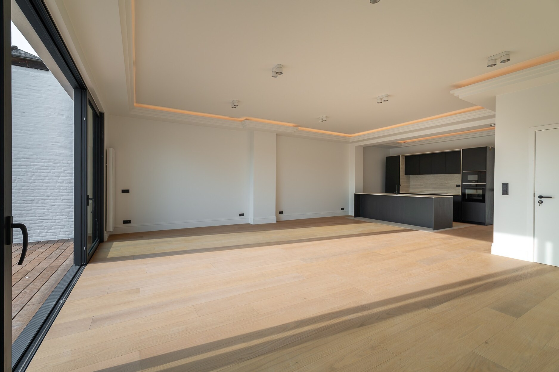 De leefruimte, verlengd door grote raampartijen, biedt toegang tot het zuidgerichte terras. Plafondlijsten structureren de volumes en benadrukken de lijnen van de ruimte. De vloer is afgewerkt met eiken parket.