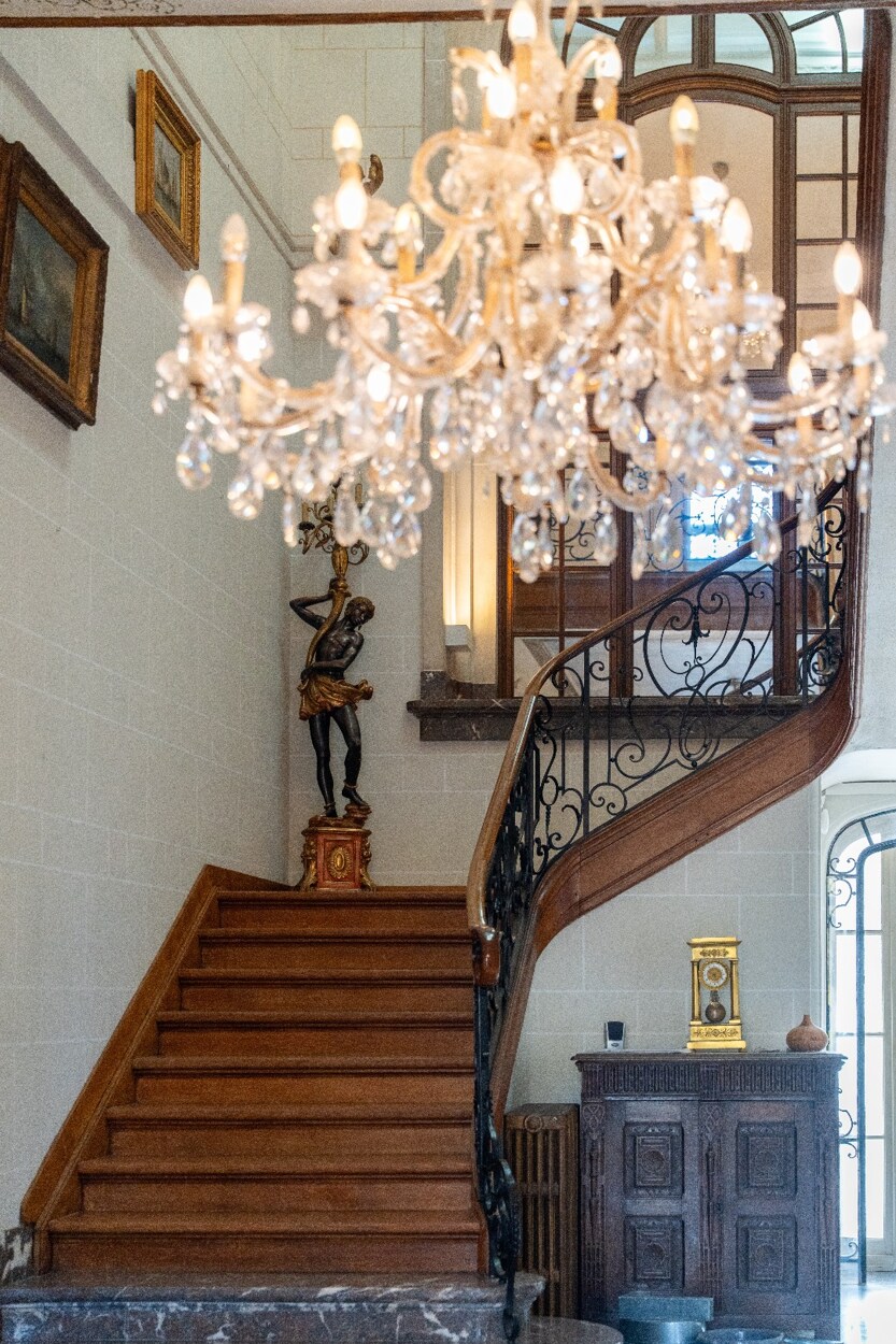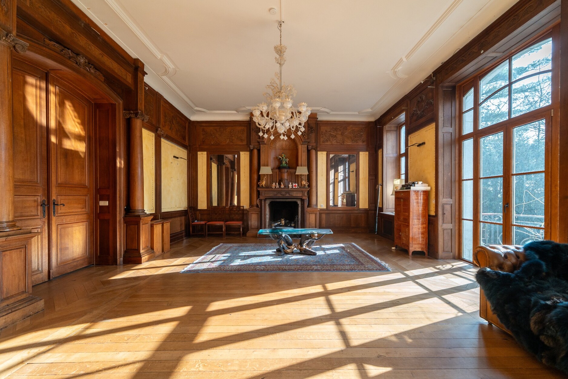 De gelijkvloerse verdieping bestaat uit een ruime inkomhal die leidt naar meerdere ontvangstruimtes en een eetkamer, evenals een hedendaagse keuken. Op de eerste verdieping bevinden zich vier slaapkamers, een salon, een dressing, een badkamer en kantoorruimtes. De tweede verdieping omvat vier bijkomende slaapkamers en een badkamer. Het souterrain op tuinniveau (ca. 374 m²) beschikt over een conciërgewoning met twee slaapkamers, atelier, koelruimte, kelders, stookruimte en sanitaire voorzieningen. Een inrichtbare zolder van ongeveer 200 m² vervolledigt het geheel.