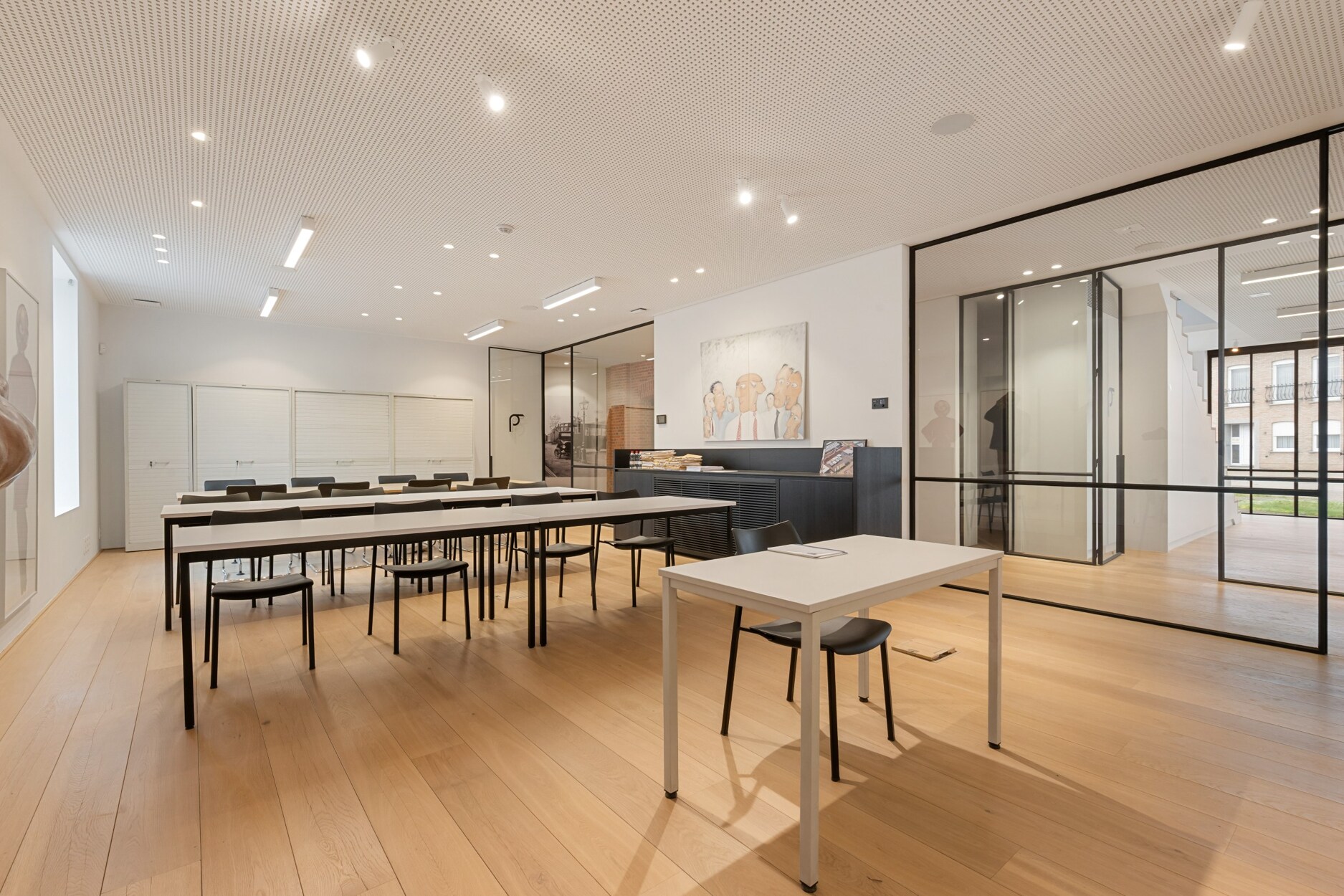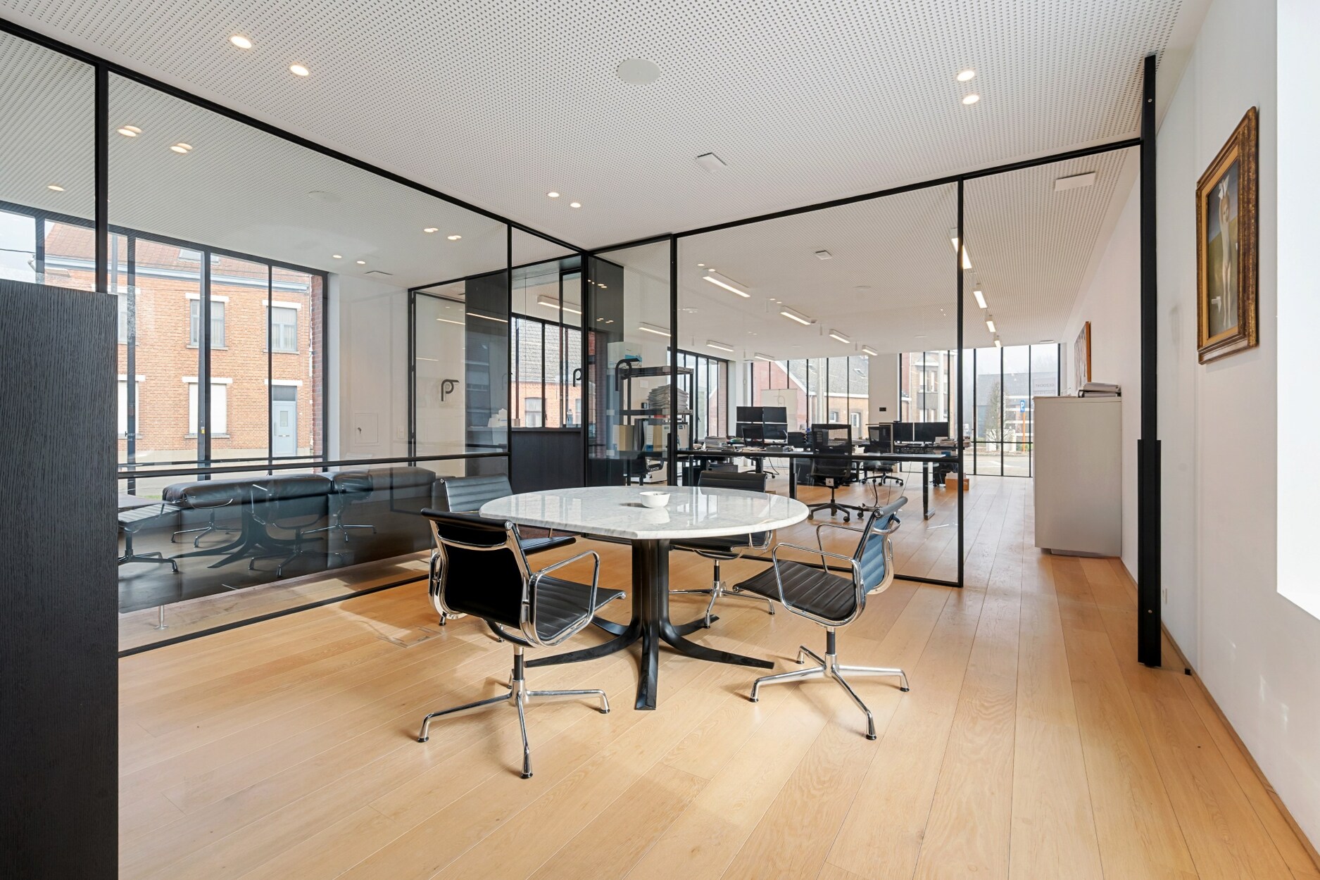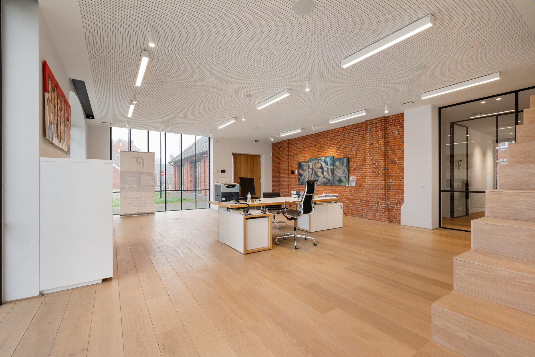 Het gebouw beschikt over 2 volwaardige verdiepingen die waarvan de eerste etage te bereiken is via 2 verschillende trappen of een lift. De gelijkvloerse verdieping bestaat uit verschillende kantoorruimtes, ontvangstruimte, vergaderzaal, luxueuze leefkeuken, gescheiden toiletten voor dames en heren en een technische ruimte.