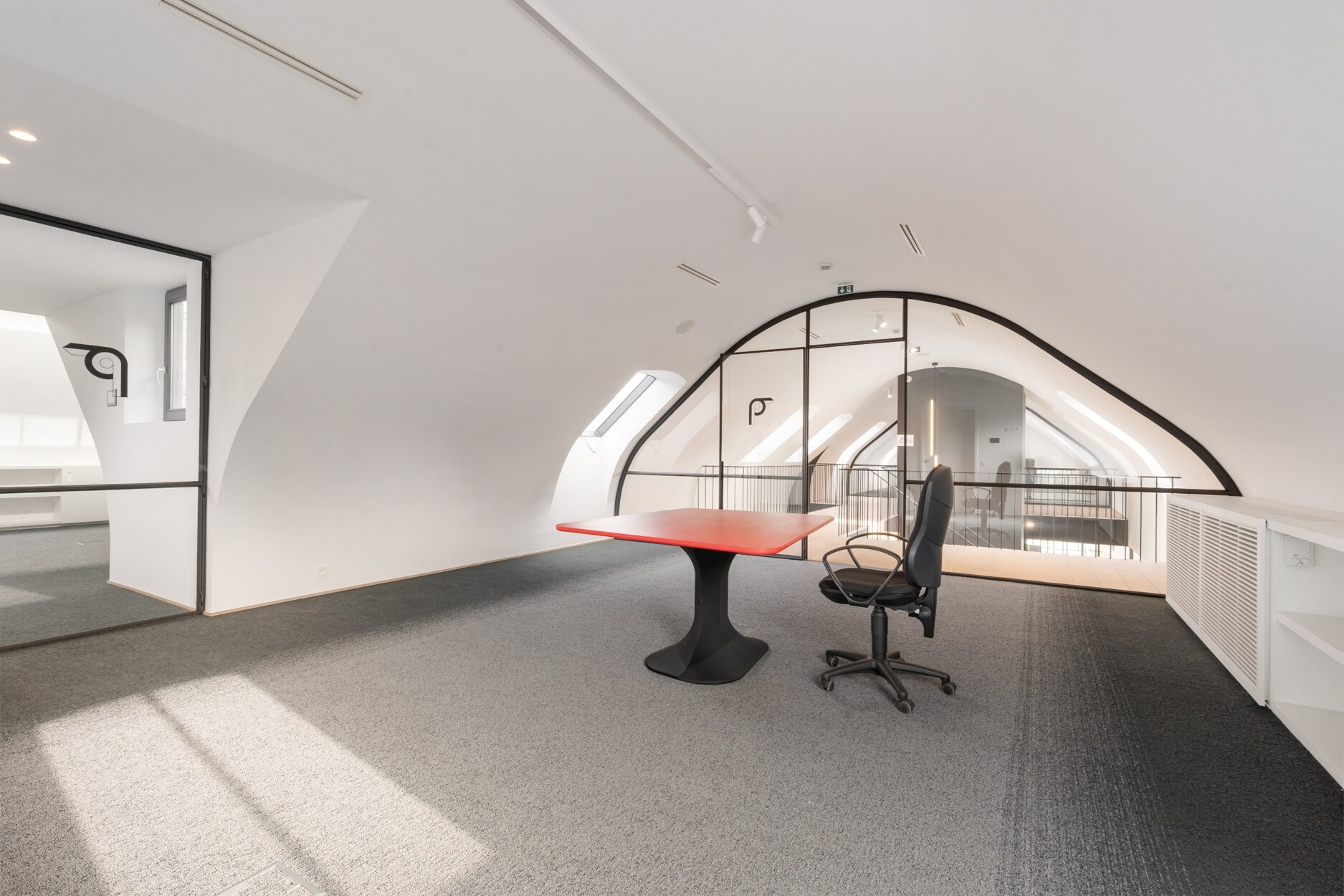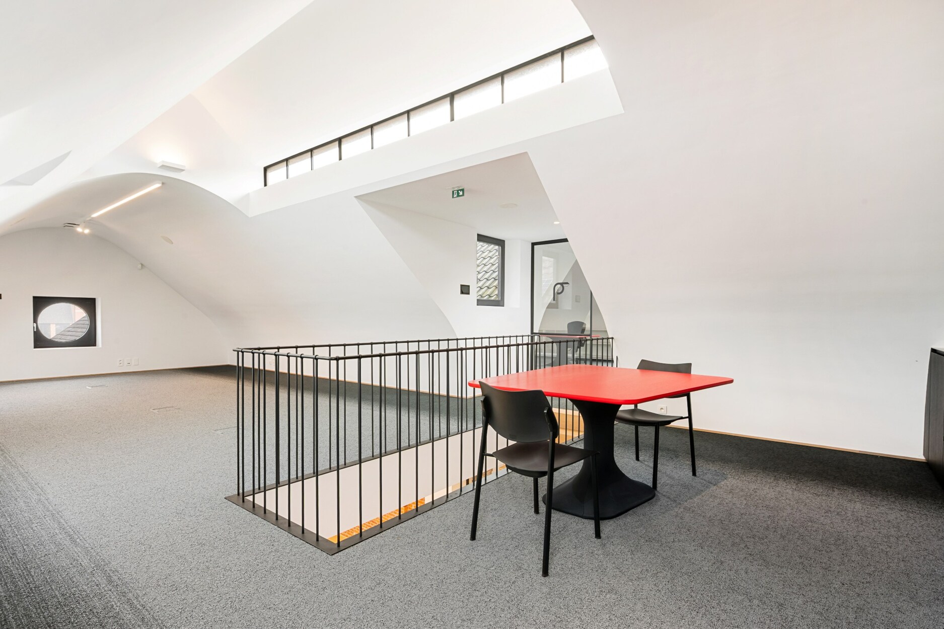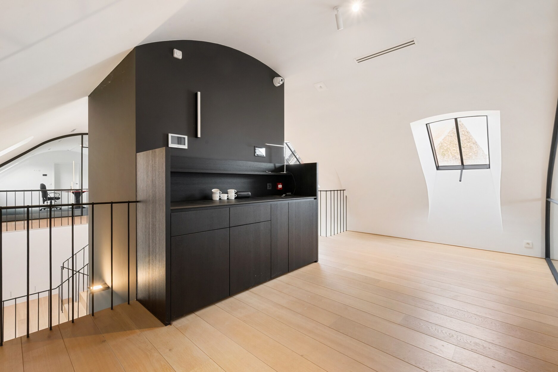 De eerste verdieping omvat een douchekamer, toilet, kitchenette, verschillende kantoorruimtes en een vergaderzaal.