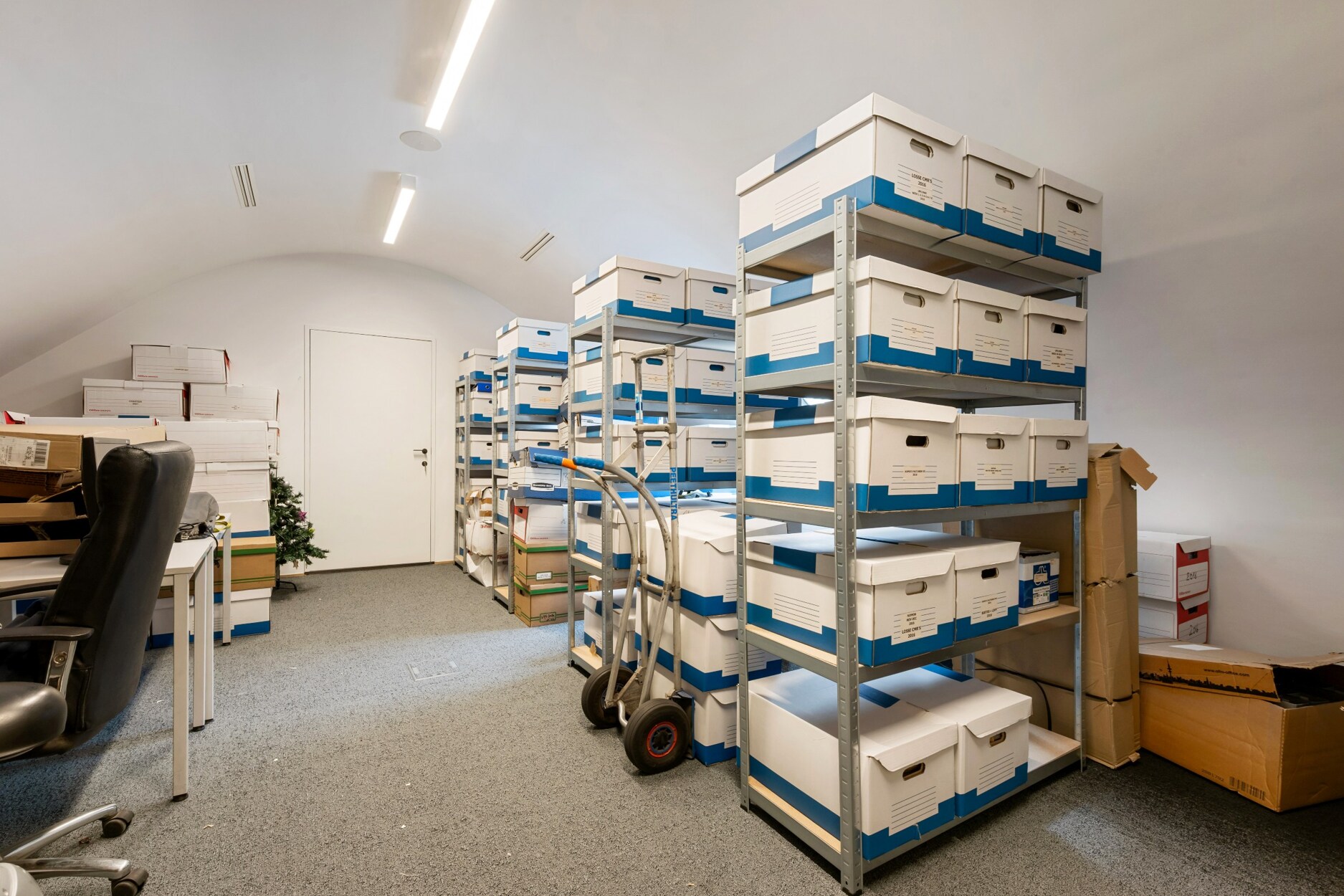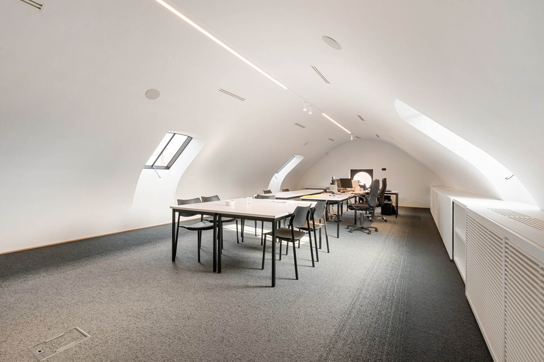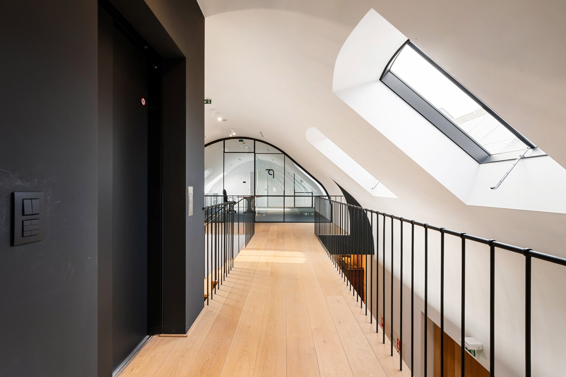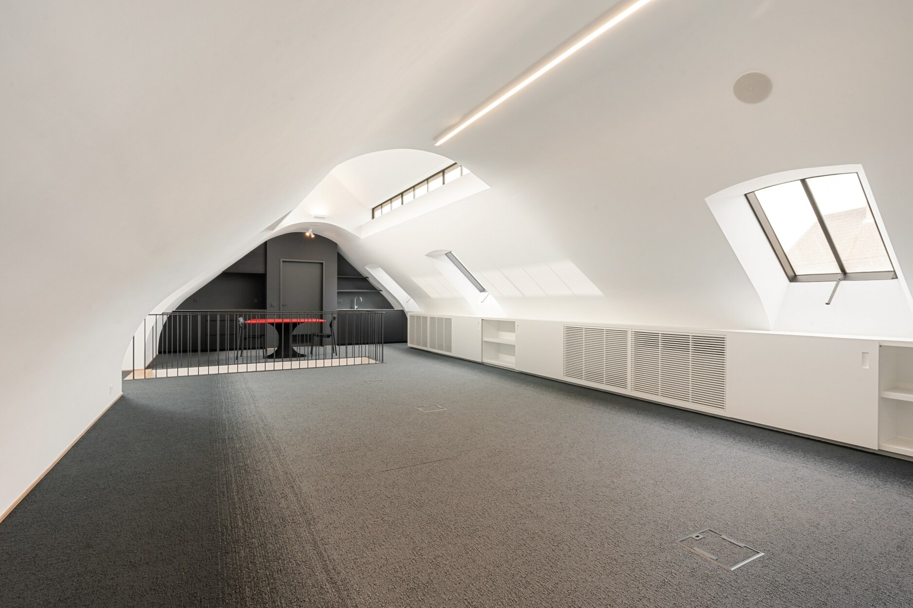 De eerste verdieping omvat een douchekamer, toilet, kitchenette, verschillende kantoorruimtes en een vergaderzaal.