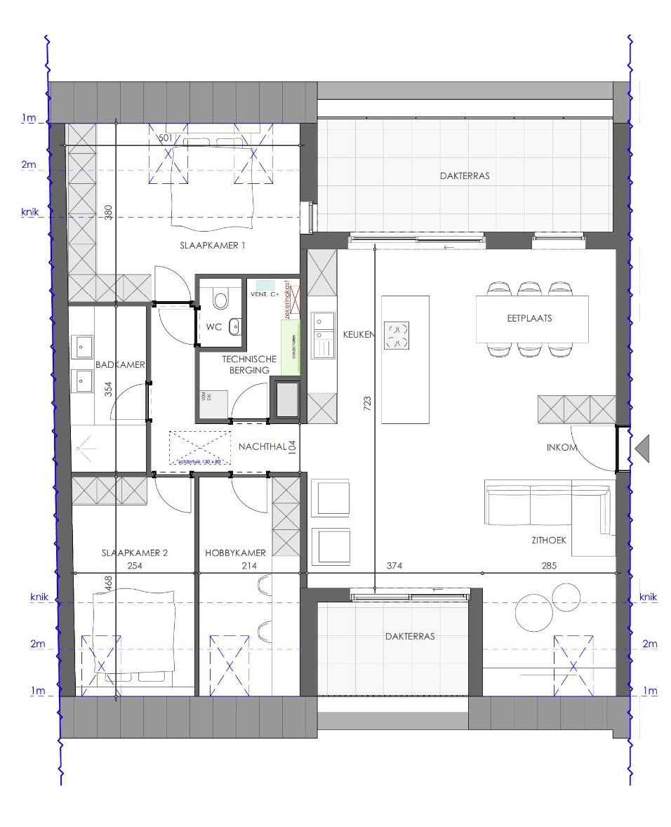 Dit dakappartement beschikt over een lichtrijke leefruimte met open keuken, een aparte berging, 3 slaapkamers, een badkamer met inloopdouche en een apart gastentoilet. Buiten geniet u van een 2 terrassen met een totale oppervlakte van 21,54 m².