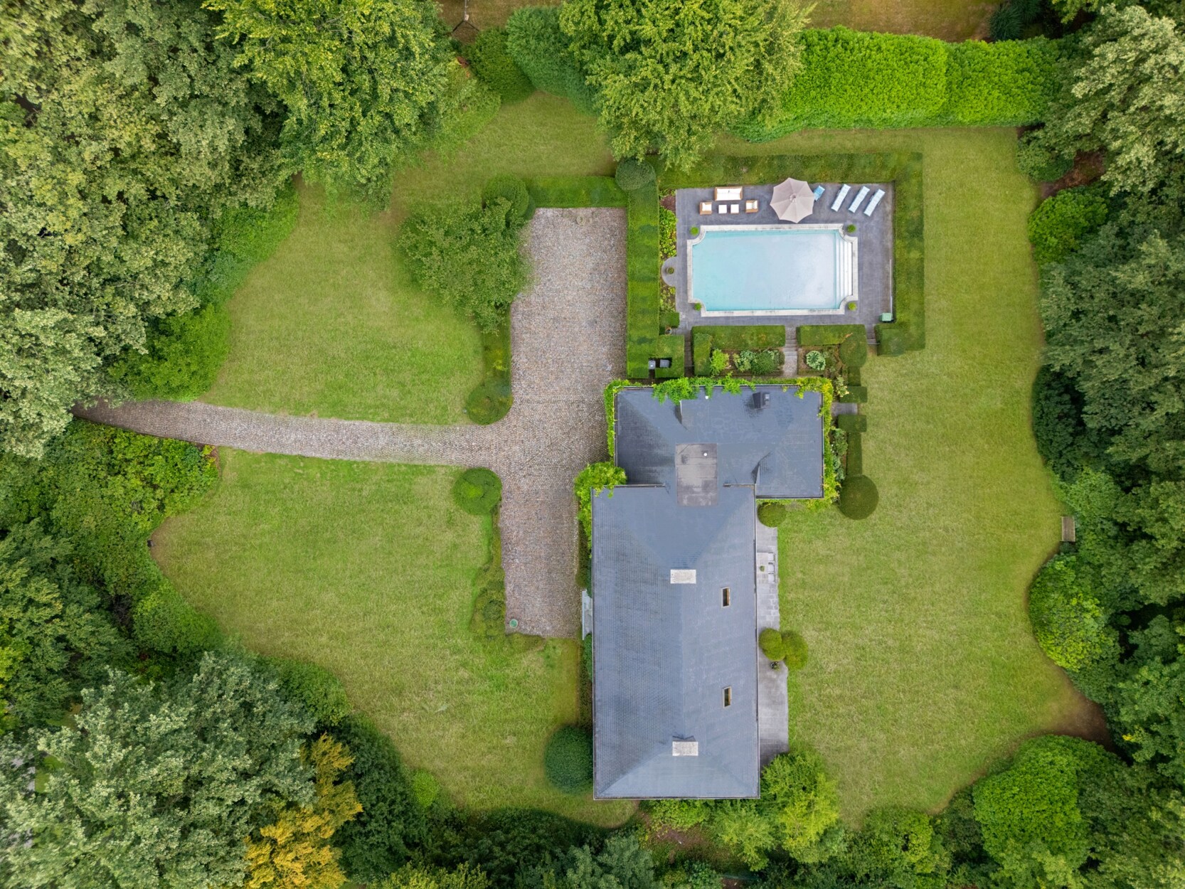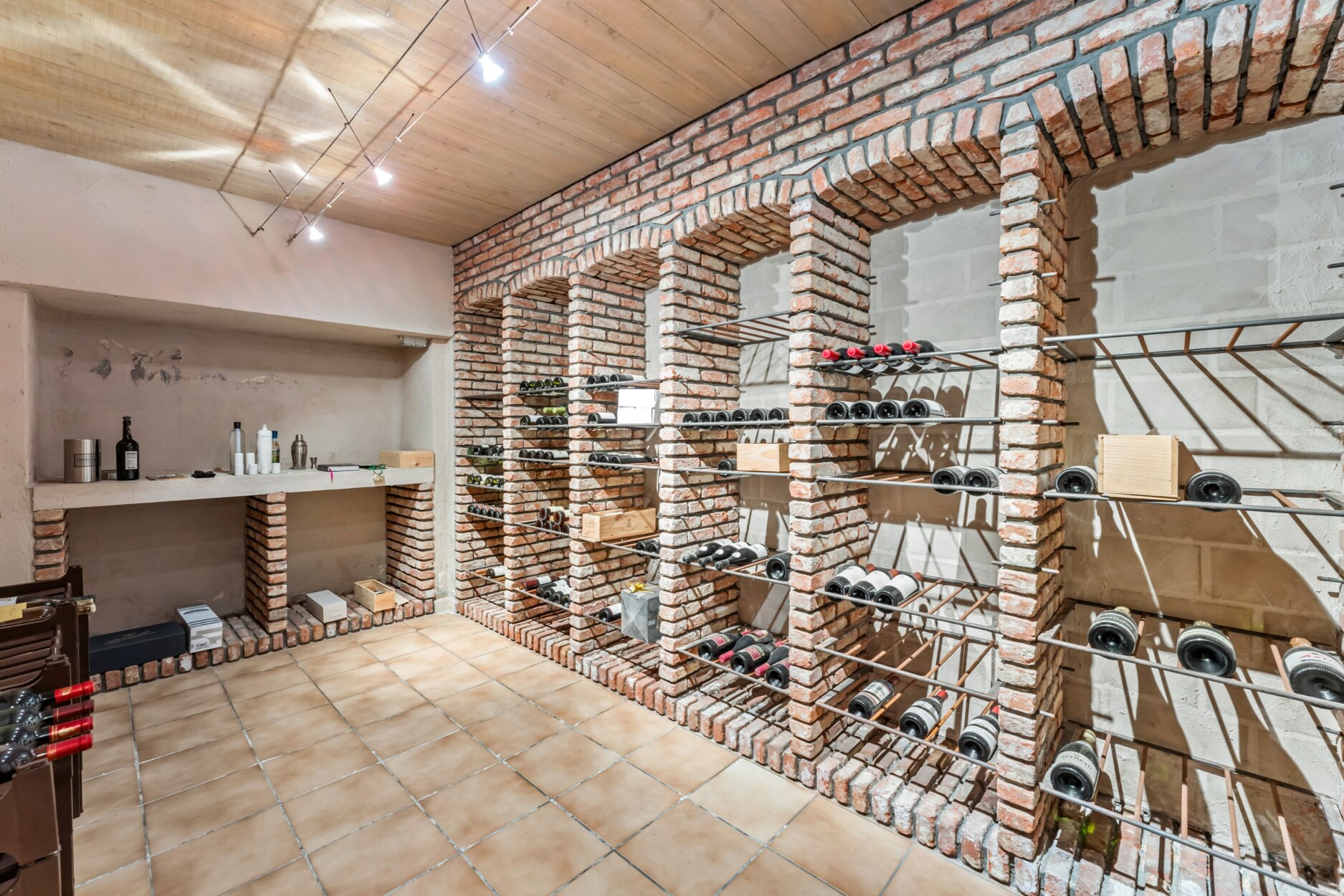 Via de private oprijlaan bereikt u de bezoekersparking en de inkomhal met vestiaire en toilet. Vanuit hier heeft u toegang tot het bureau, de leefruimtes, de keuken en de kelder met wijnkelder, polyvalente ruimte en biljard.
