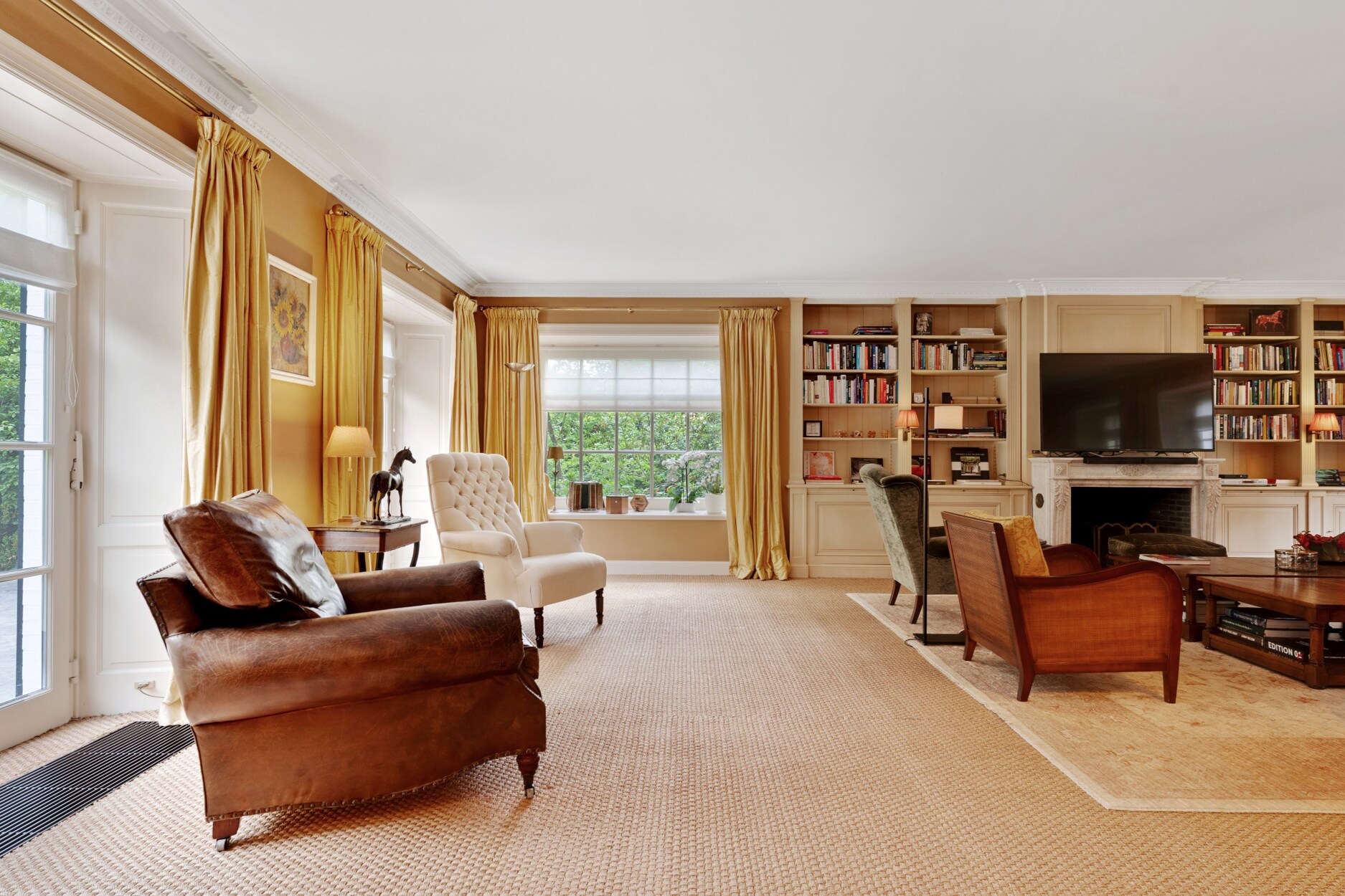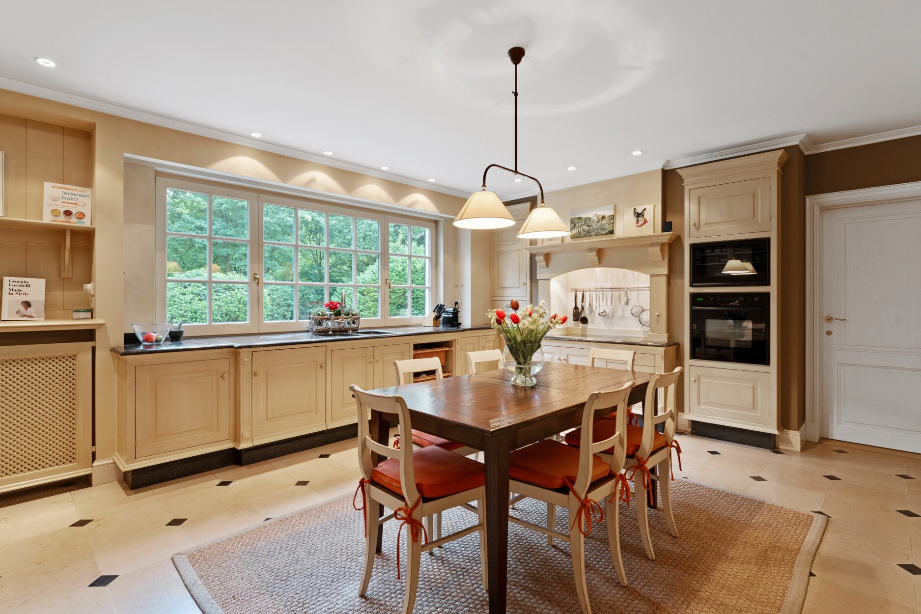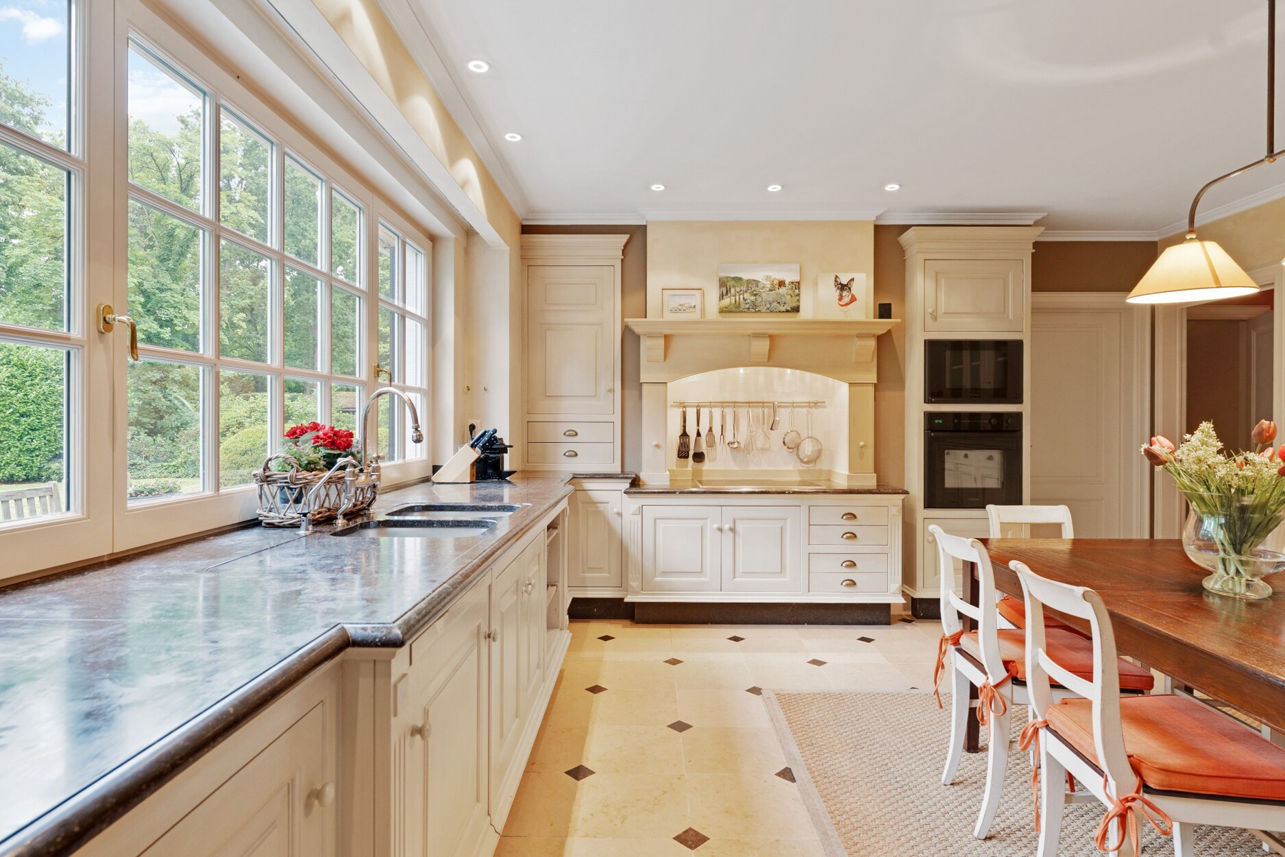 De lichtrijke living met open haard geniet van een prachtig uitzicht op de voor- en achtertuin en sluit naadloos aan bij de eetruimte. De volledig uitgeruste keuken biedt toegang tot zowel een open terras als een overdekt terras met open haard. Dankzij de schuiframen kan deze patio afgesloten of juist volledig opengezet worden, waardoor dit een volwaardige vierseizoensruimte vormt.