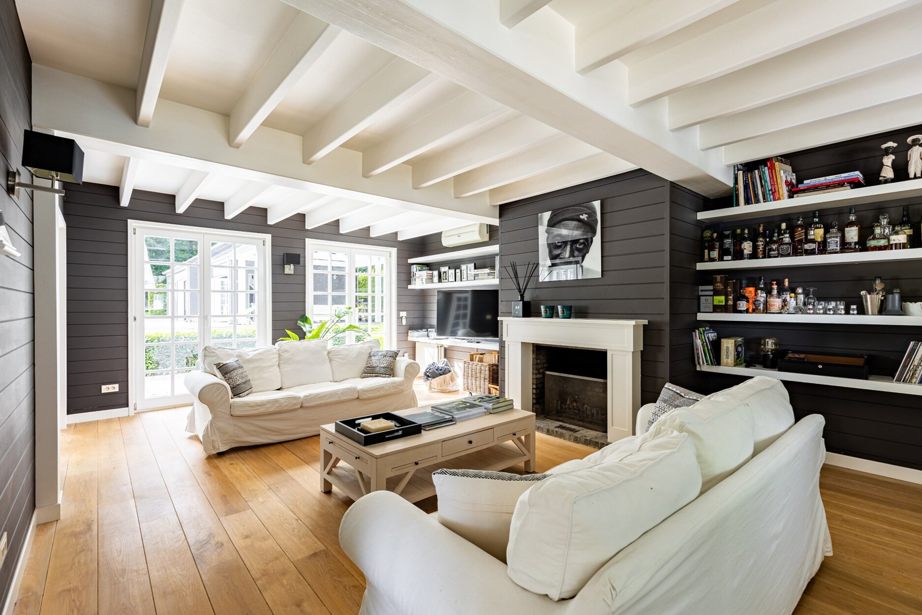 De gelijkvloerse verdieping omvat een inkomhal met vestiaire en gastentoilet, een salon met open haard, een erkerruimte, een volledig uitgeruste open keuken met eetruimte en rechtstreekse toegang tot een verwarmde wintertuin (22m² met schuivende glazen deur), alsook een bijkeuken met wasruimte.