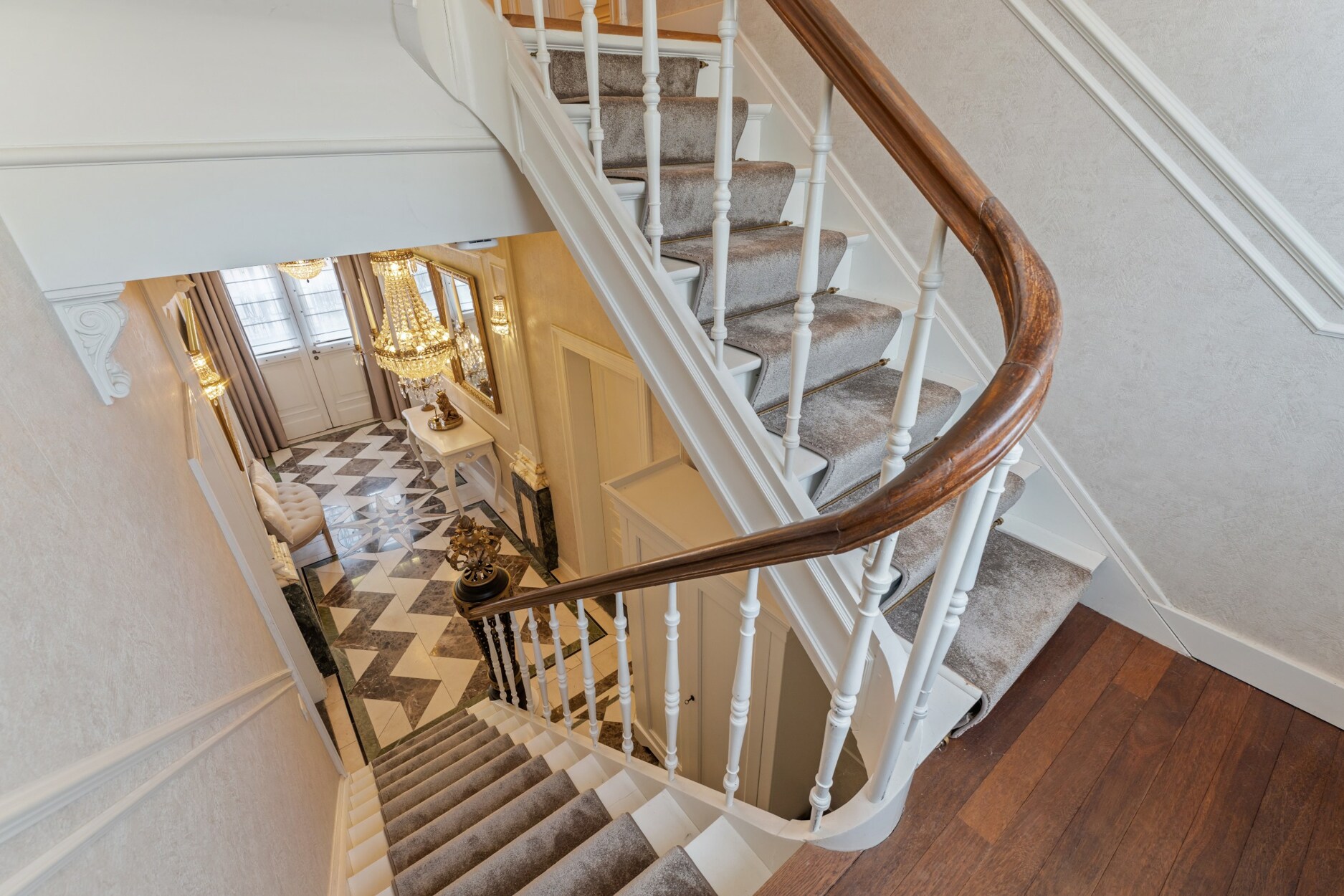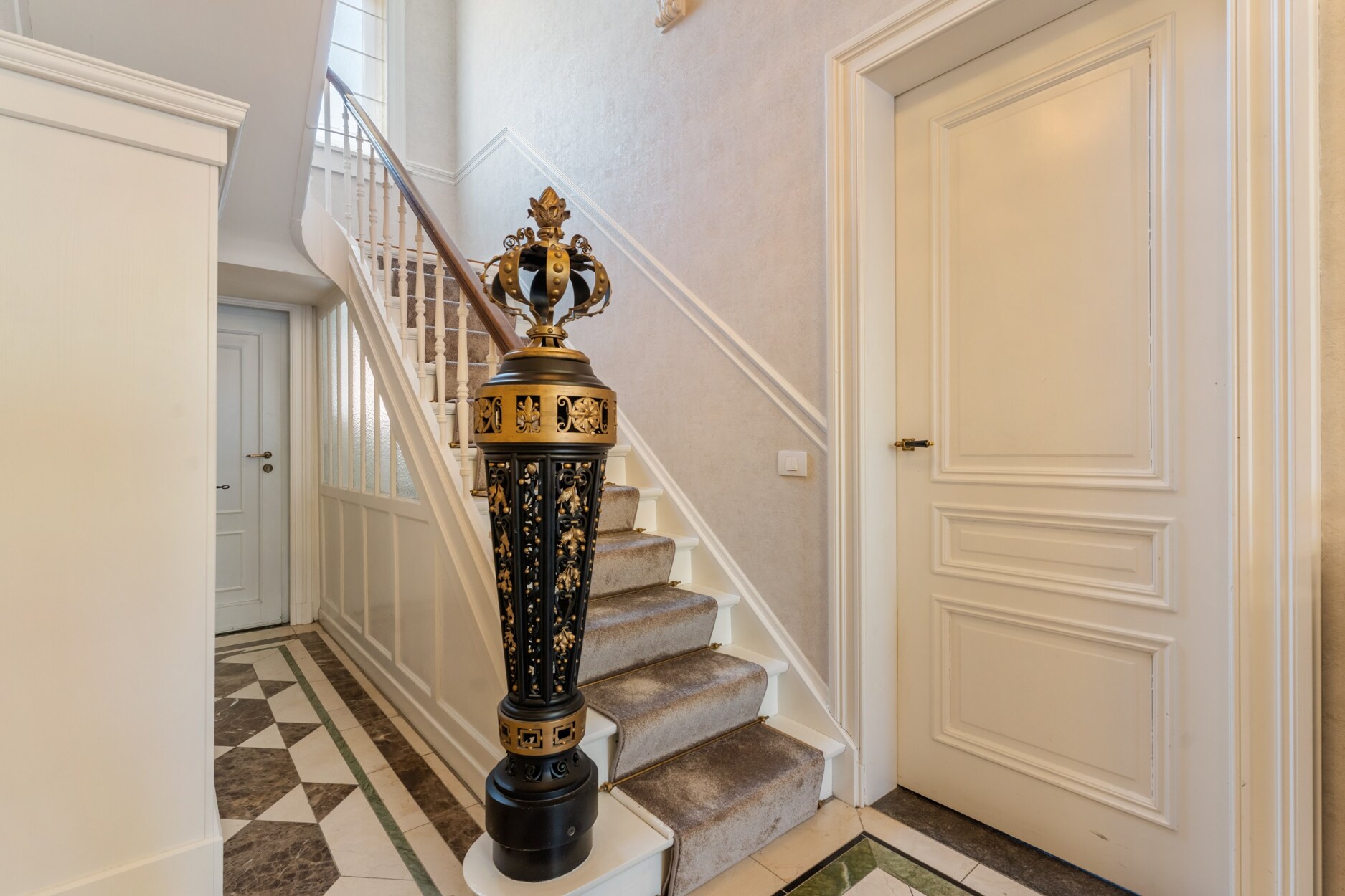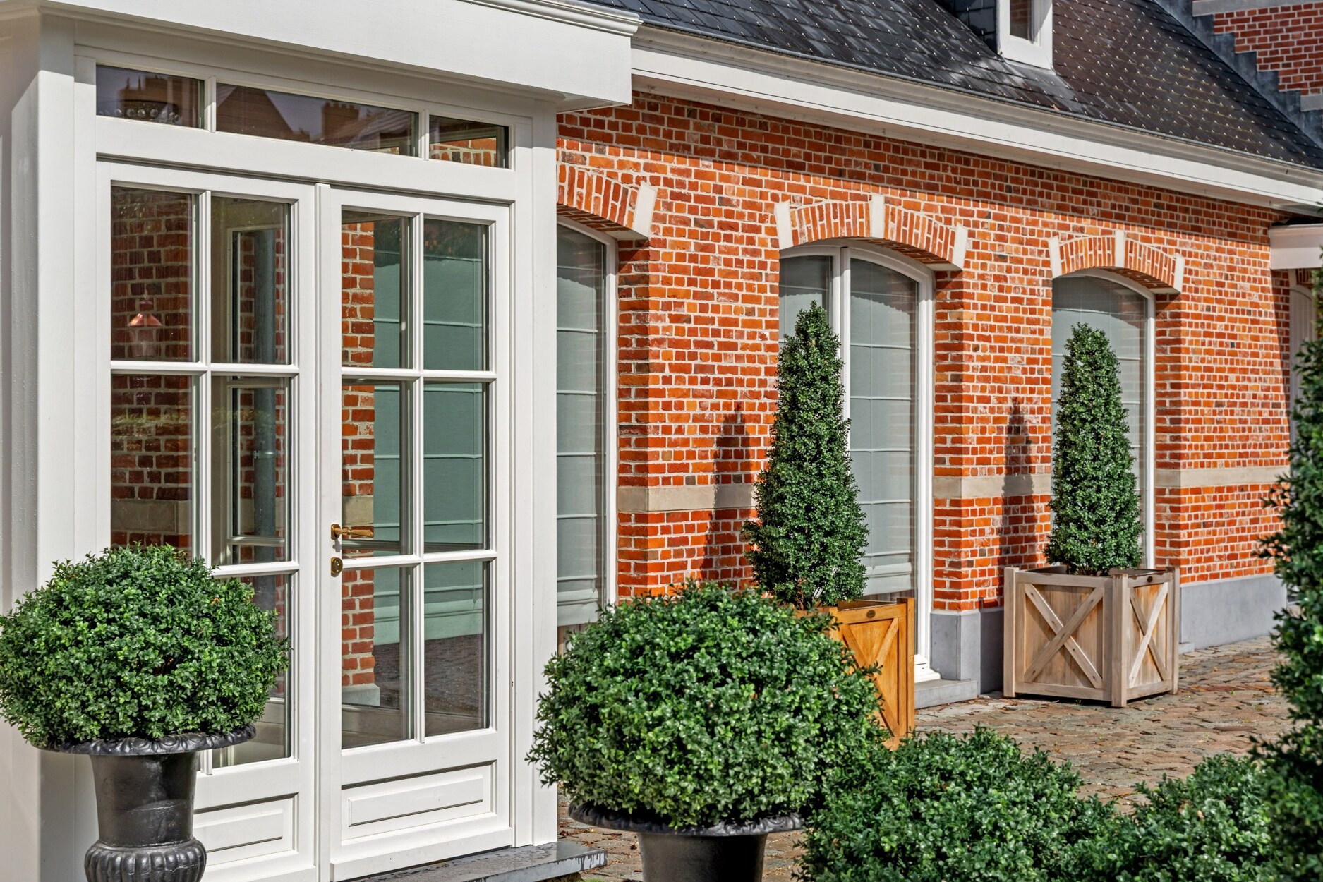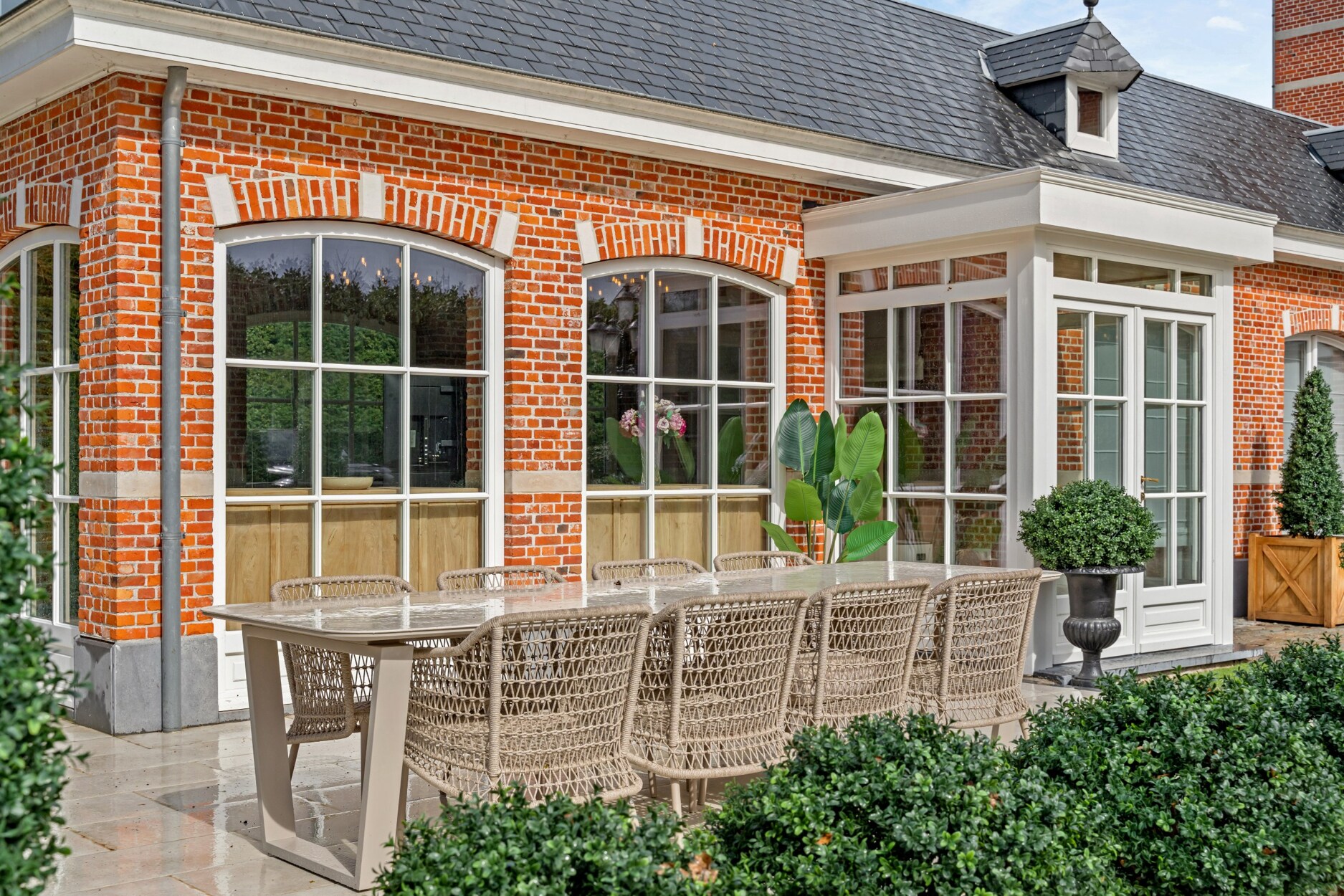 Bij het betreden van de woning wordt u verwelkomd in een majestueuze inkomhal die meteen de toon zet. Van hieruit bereikt u enerzijds de elegante dubbele leefruimte met authentieke ensuite deuren, en anderzijds een ruime kantoorruimte met haard, ideaal voor wie wonen en werken wenst te combineren.