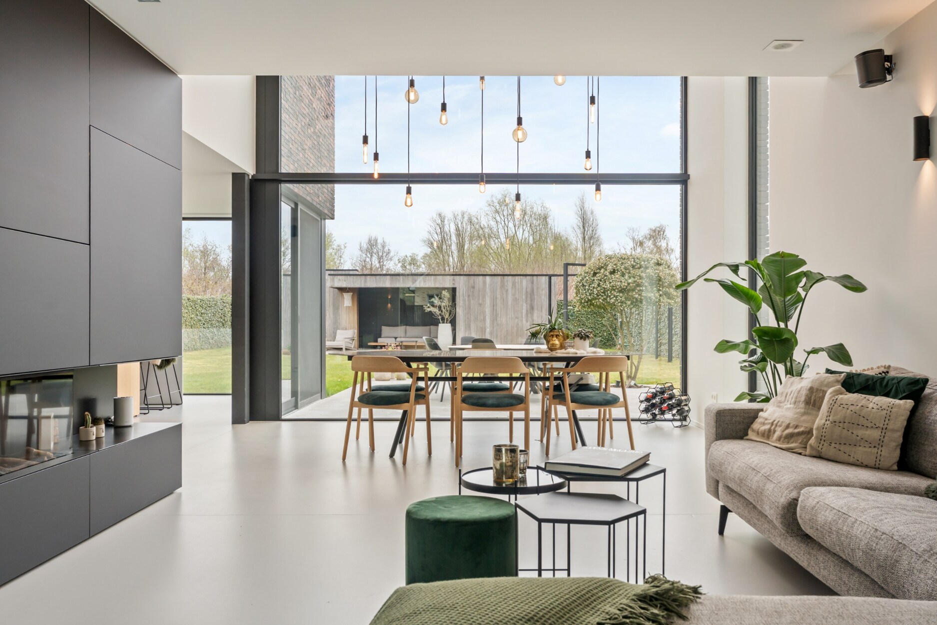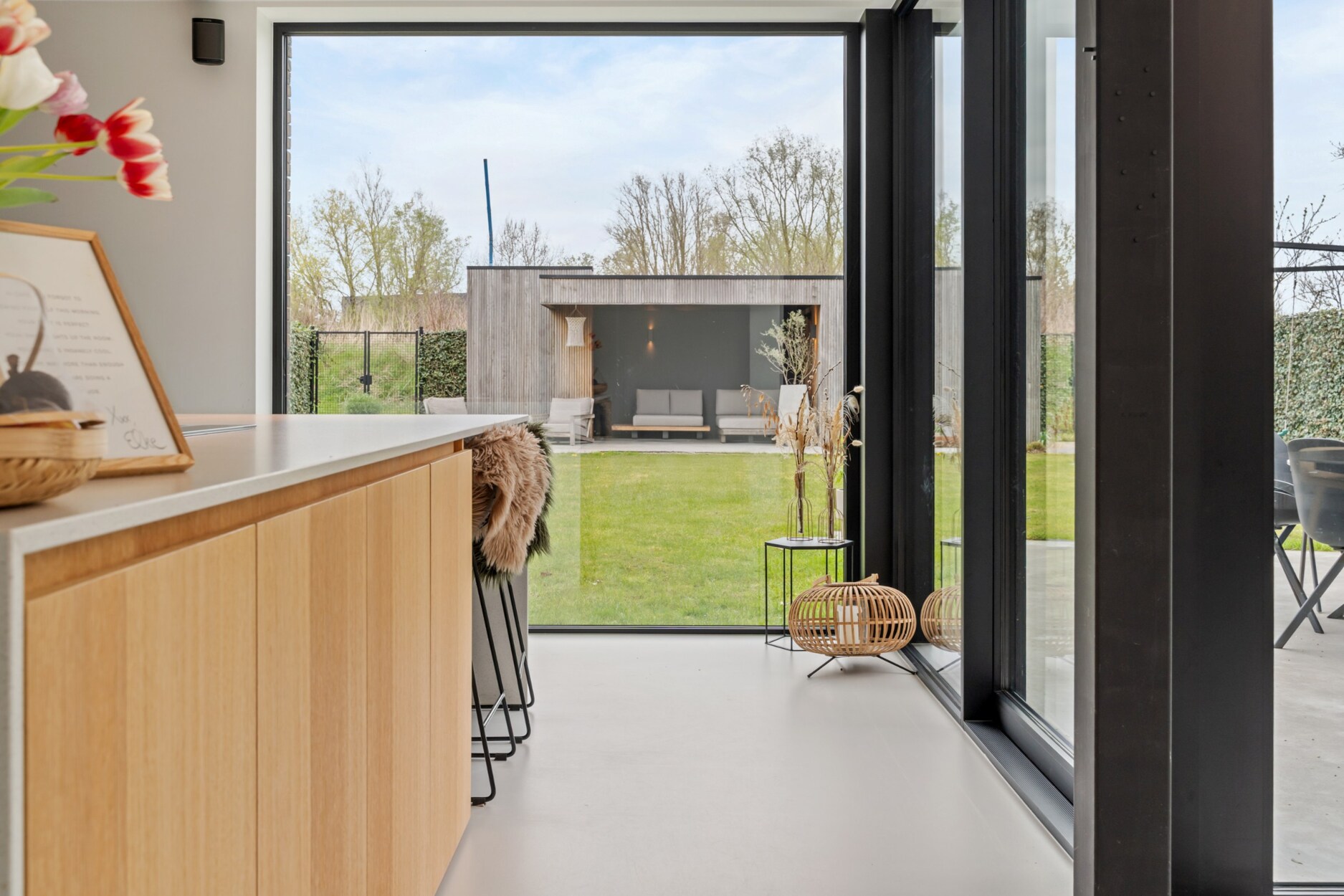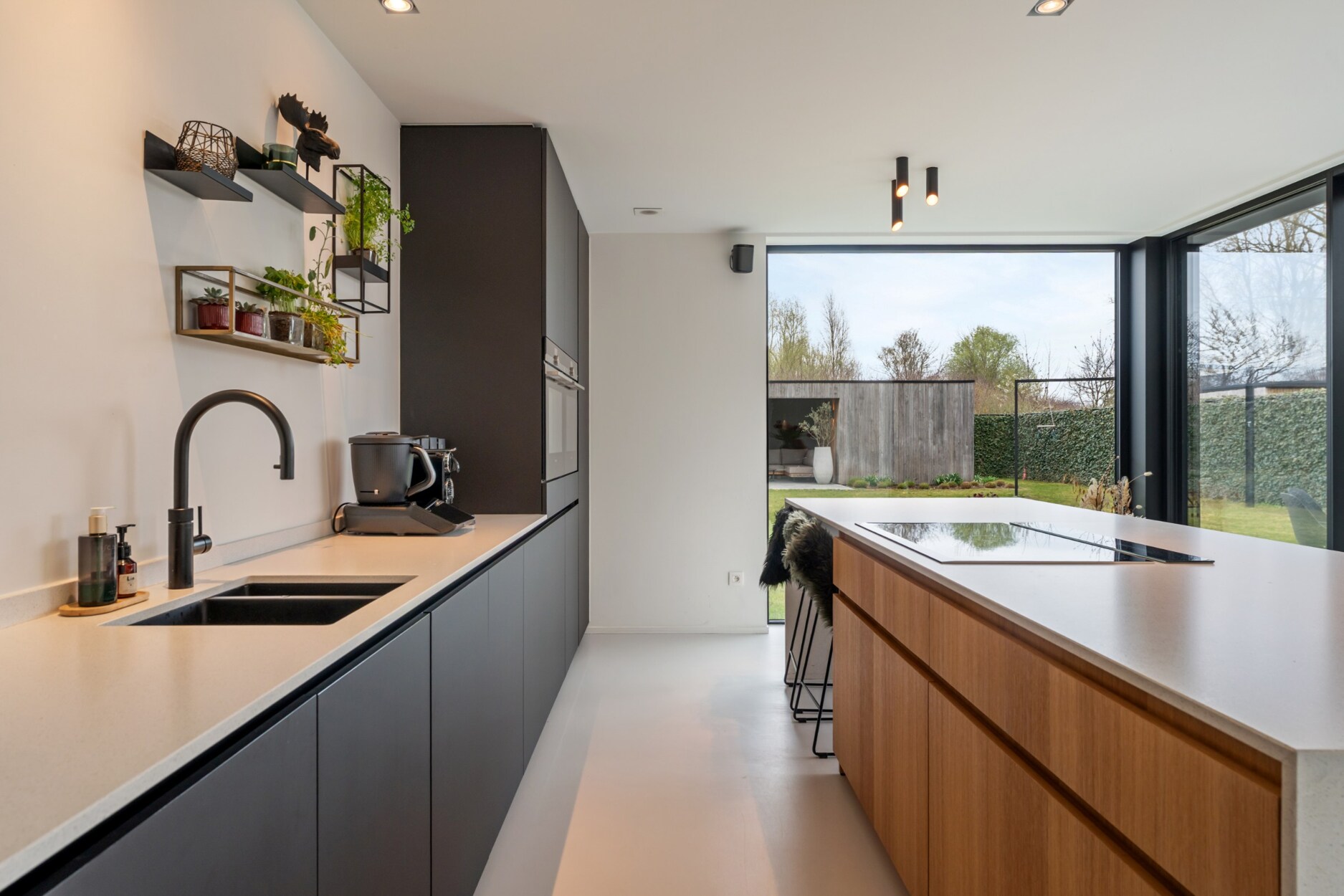De open leefkeuken is een echte blikvanger, met een ruim kookeiland, een gezellige eethoek en een prachtig zicht op de tuin. De keuken is luxueus afgewerkt en uitgerust met alle moderne toestellen van het merk Siemens, waaronder combi stoomoven/oven, combi microgolfoven/oven, een inductiekookplaat met geïntegreerde afzuiging, vaatwasmachine en koelkast. Via de schuifraam heeft u hier toegang tot het aangename terras.