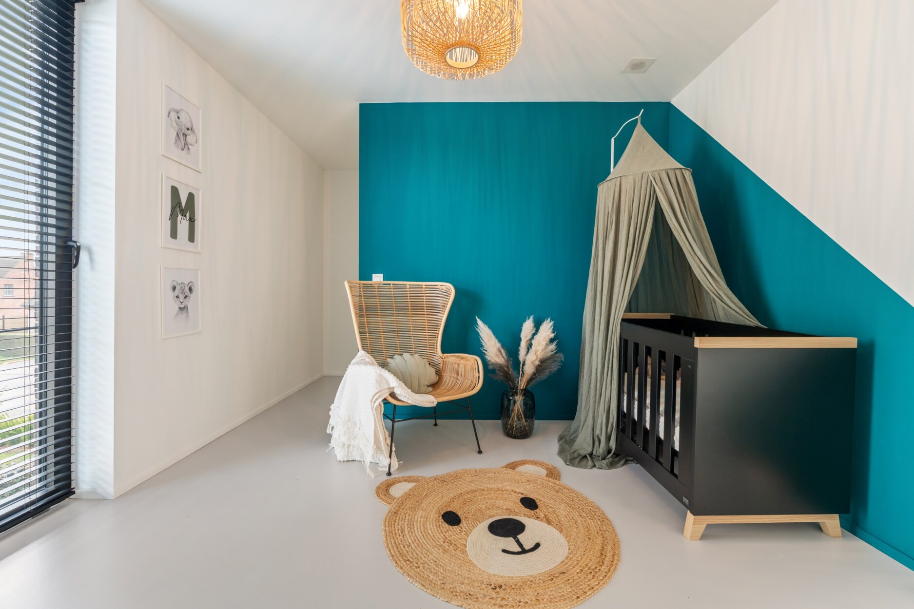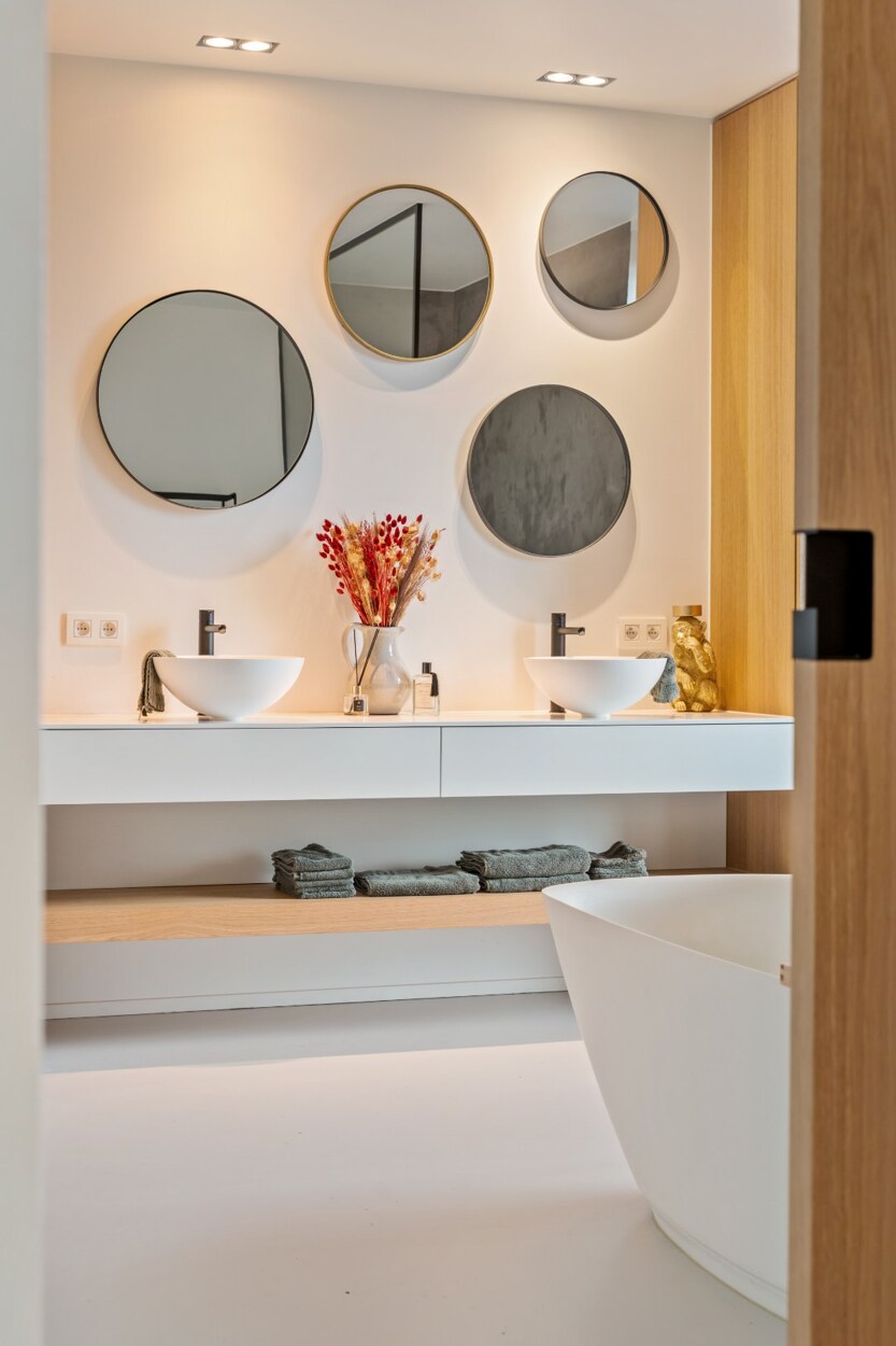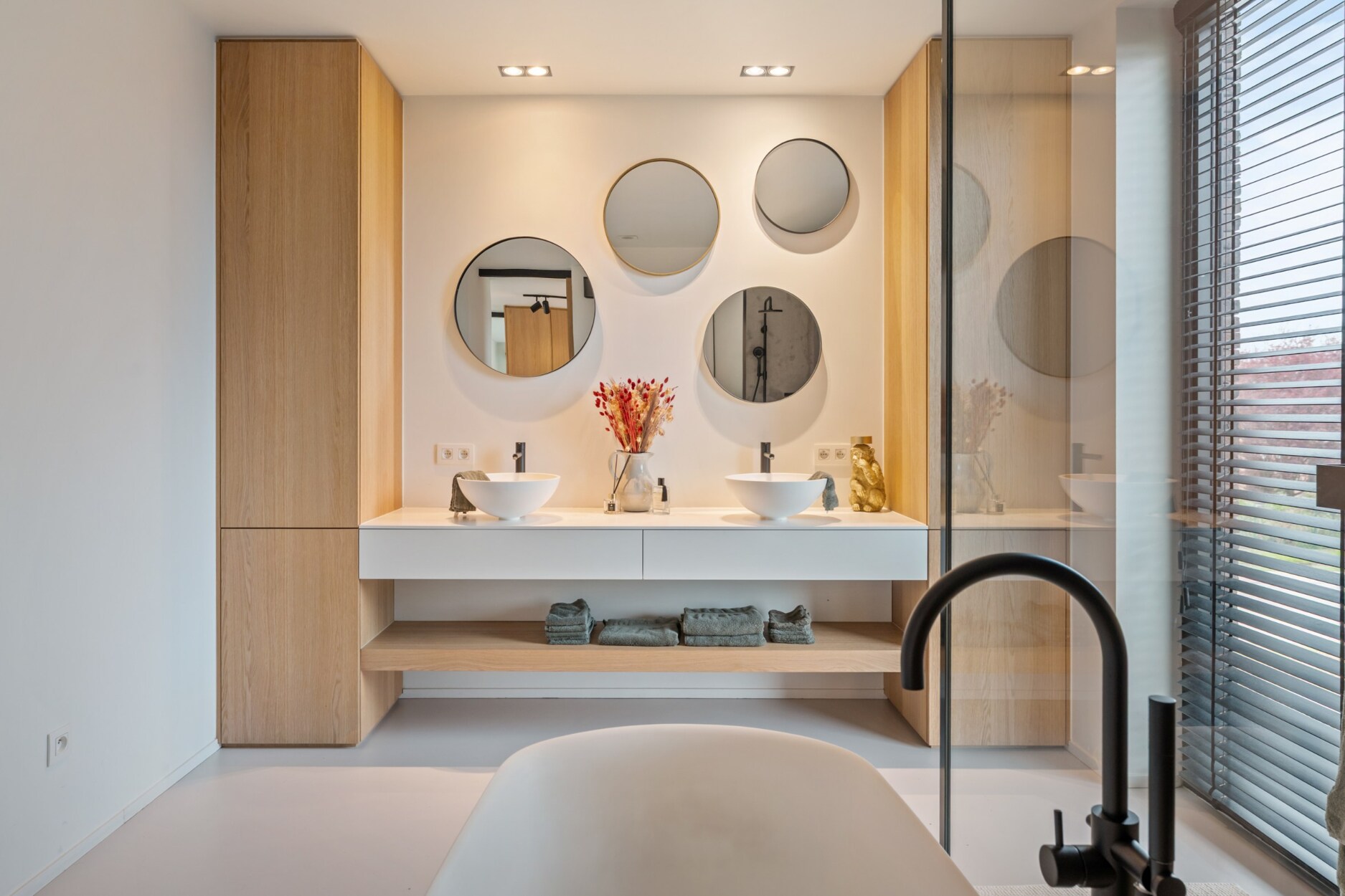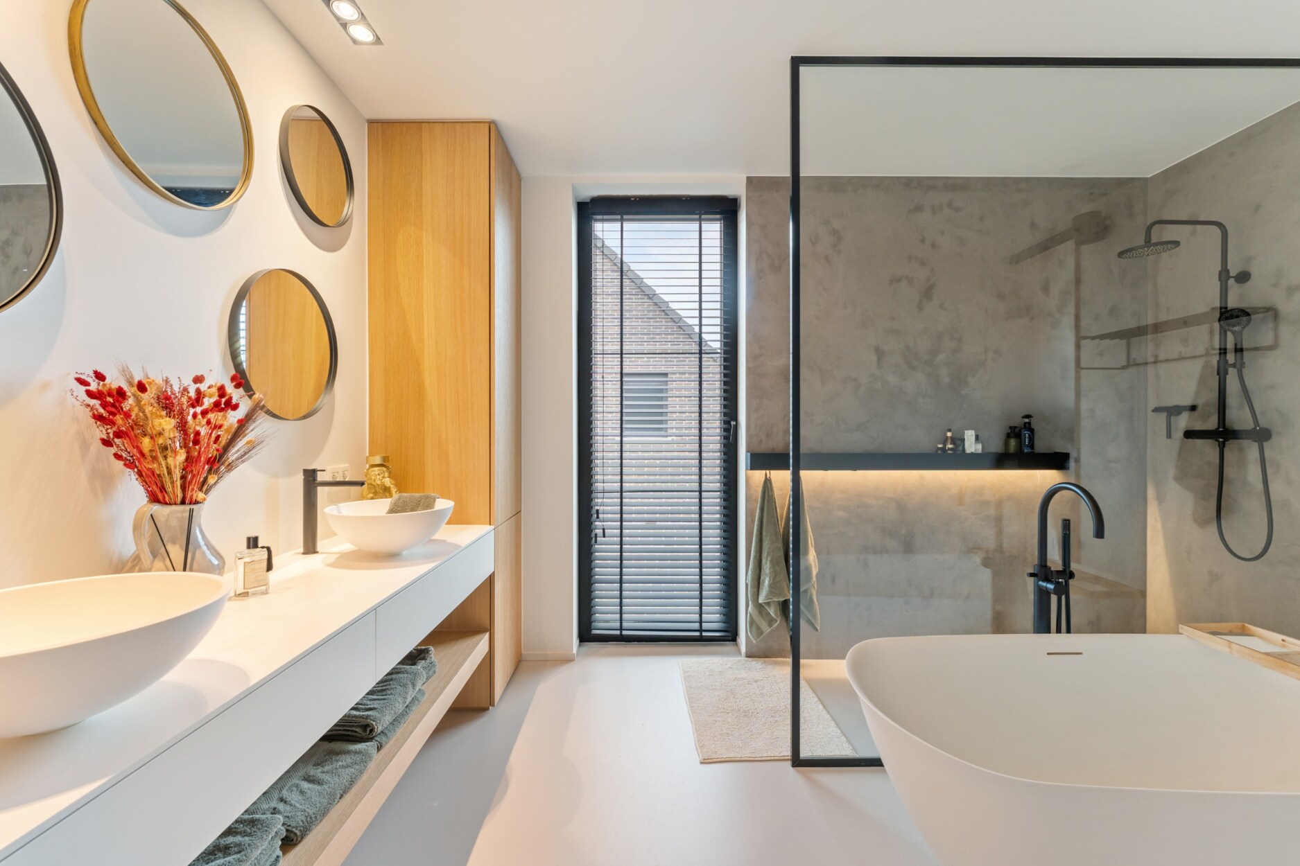 De master bedroom is sfeervol afgewerkt met een zwarte visgraatparket en biedt toegang tot een dressing op maat en een eigen badkamer met inloopdouche afgewerkt met microtopping, losstaand ligbad en dubbel lavabomeubel.