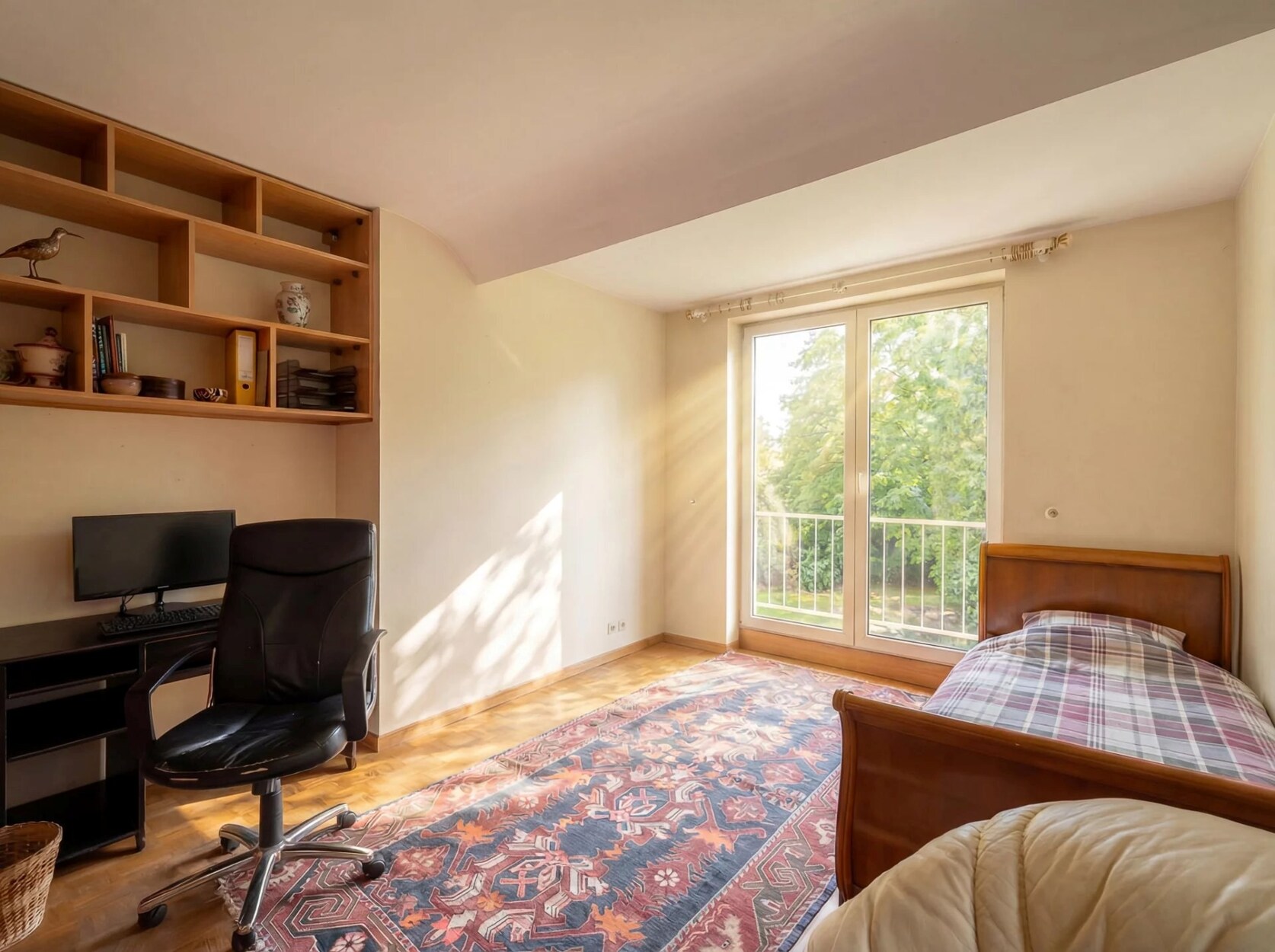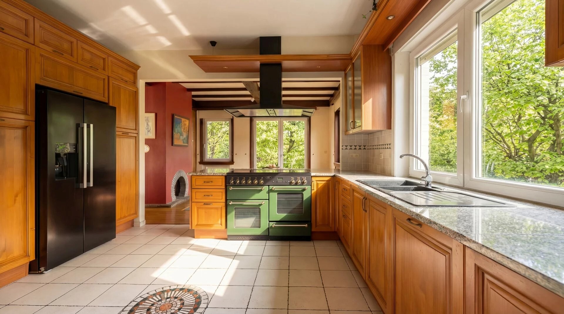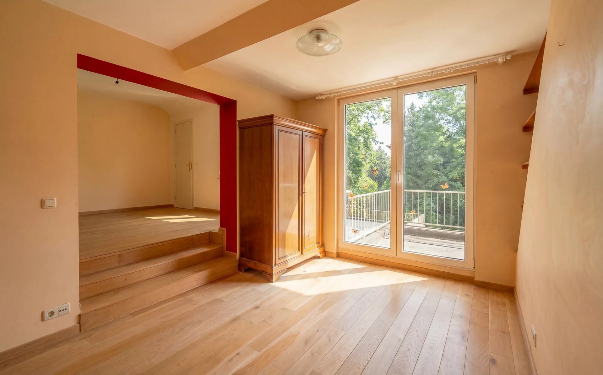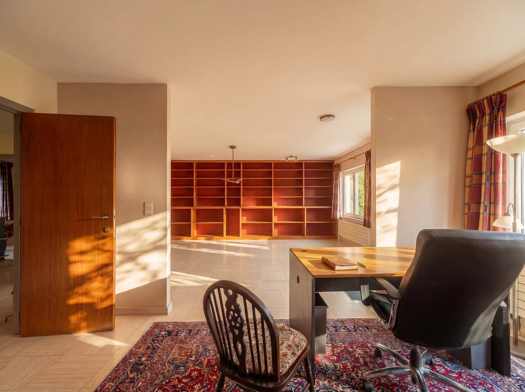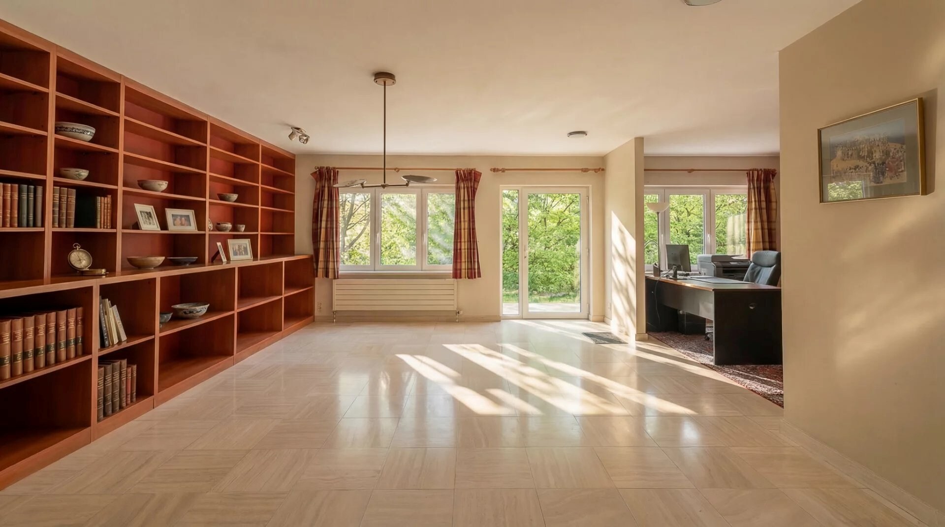 De inkomhal, met vestiaire, leidt naar twee kantoorruimtes, waarvan één van aanzienlijke afmetingen, geschikt voor professionele activiteiten. De ontvangstruimtes omvatten een lichte woonkamer, een keuken en een eetkamer, met een vrij uitzicht op de tuin. Op de bovenverdieping bestaat de slaapruimte uit vier slaapkamers en drie badkamers.
