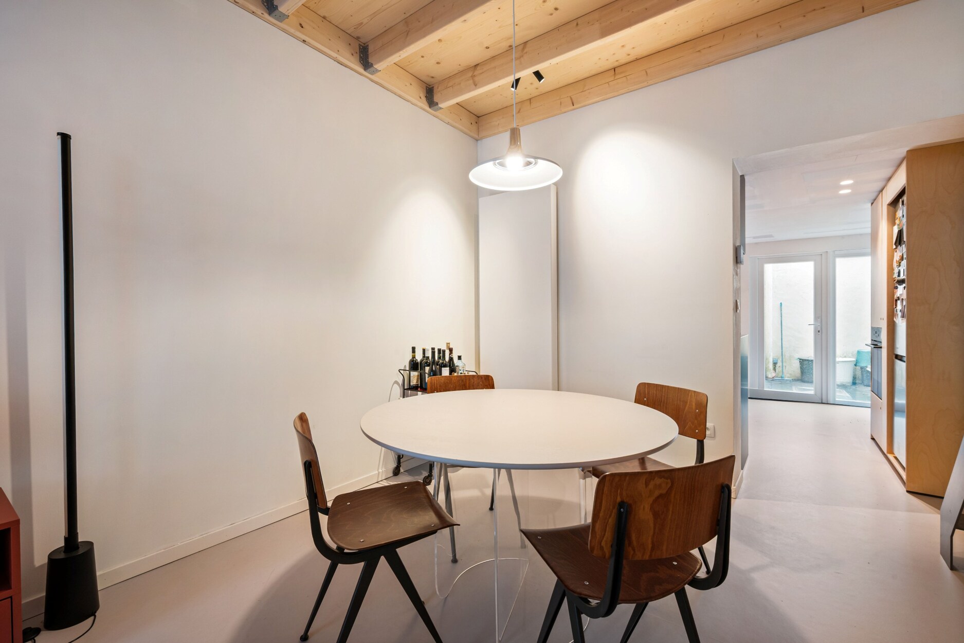 Via de inkomhal kom je in de ruime, lichte woonkamer waar gezelligheid centraal staat. De woonkamer sluit naadloos aan op de open keuken, wat zorgt voor een vlotte circulatie en een aangename leefruimte. Achteraan bevinden zich de badkamer en de toegang tot de gezellige koer.