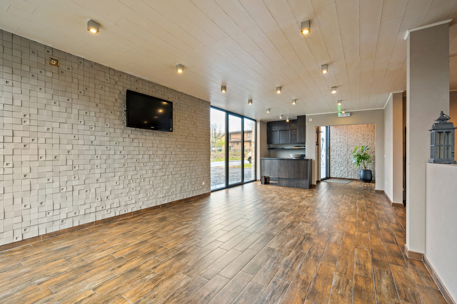 Op het gelijkvloers bevindt zich een ingerichte horecaruimte, gekoppeld aan de professionele roestvrijstalen keuken. Daarnaast is er een aparte, gezellige leefruimte met een mooi zicht op de tuin en toegang tot een indrukwekkend terras van 180 m². De fraai aangelegde tuin biedt maximale privacy en rust.