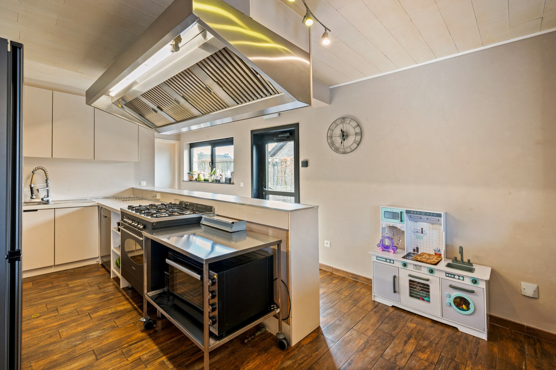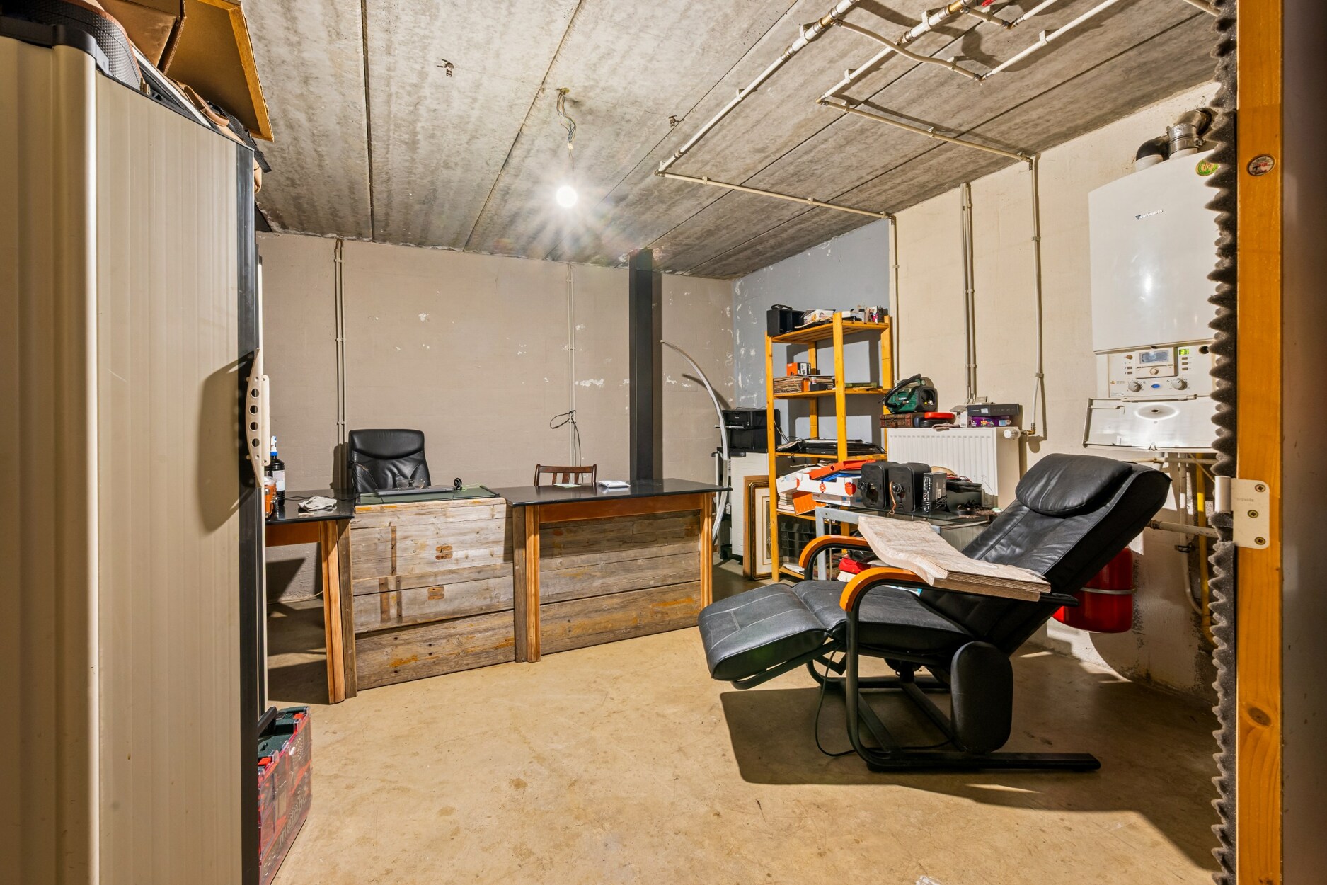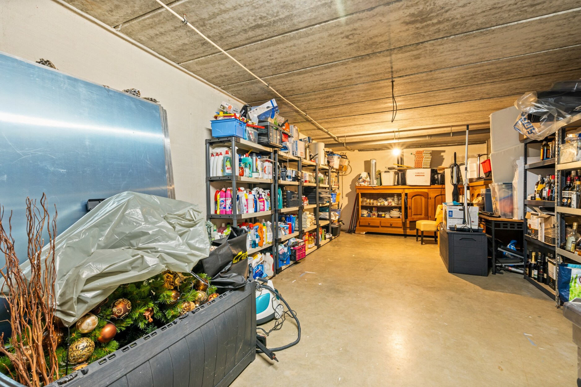 De woning beschikt over een bijzonder grote kelder die zowel van binnenuit als via een aparte buitentoegang bereikbaar is. Hier bevinden zich meerdere opslagruimtes en een volledig geluiddichte muziekkamer, ideaal voor hobby’s of professioneel gebruik. Dankzij de ingebouwde keukenlift is er een rechtstreekse verbinding tussen de kelder en de industriële RVS‑keuken op het gelijkvloers, wat perfect is voor horecadoeleinden.