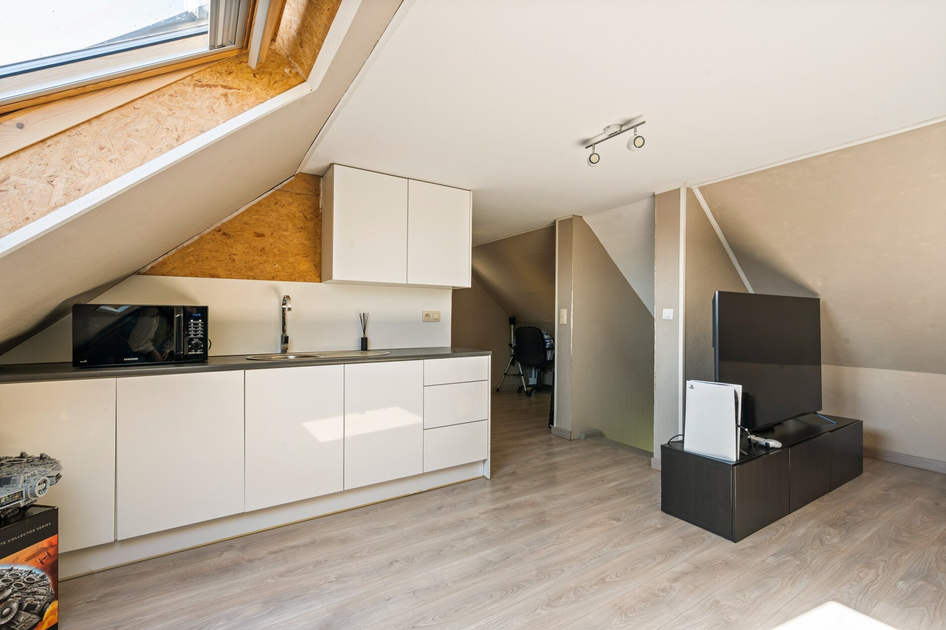 De bovenste verdieping is ingericht als studio met een eigen slaapkamer, woonruimte en douchekamer, ideaal als zelfstandige woonunit, zorgunit of verhuurmogelijkheid.