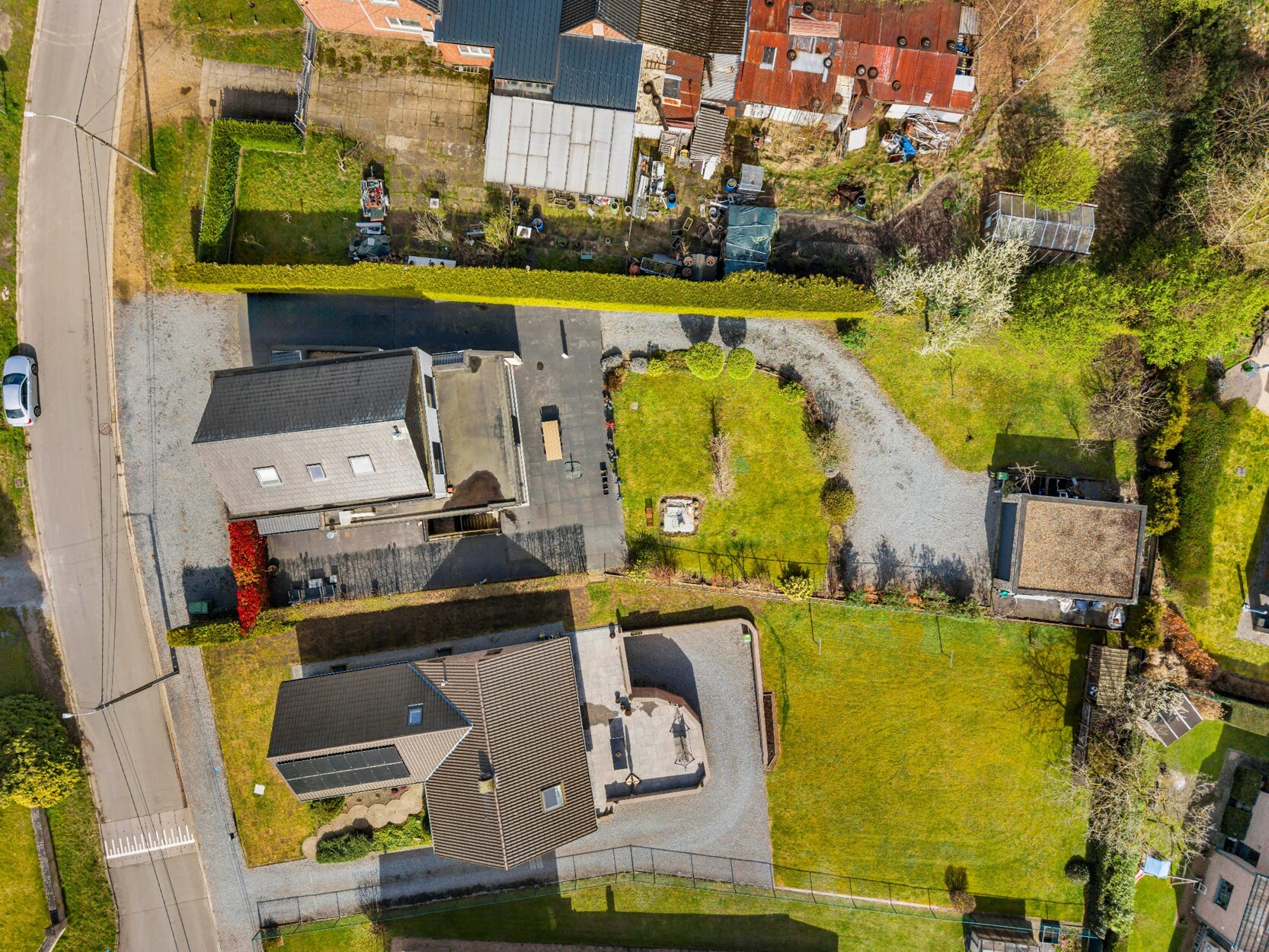 Aan de voorzijde van het perceel is er ruime parkeergelegenheid: 6 tot 8 privé‑parkeerplaatsen op eigen terrein, waarbij manoeuvreren comfortabel blijft. Daarnaast kan er vrij op straat geparkeerd worden, waardoor klanten of bezoekers eenvoudig 3 à 4 extra parkeerplekken vinden vlak voor de woning. Er is bovendien een aparte inrit links, plus bijkomende toegang langs de voor- en zijkant van het gebouw. Achteraan op het perceel bevindt zich een vrijstaande garage, die gemakkelijk bereikbaar is via de private oprit en eveneens dienst kan doen als opslag- of werkruimte.
