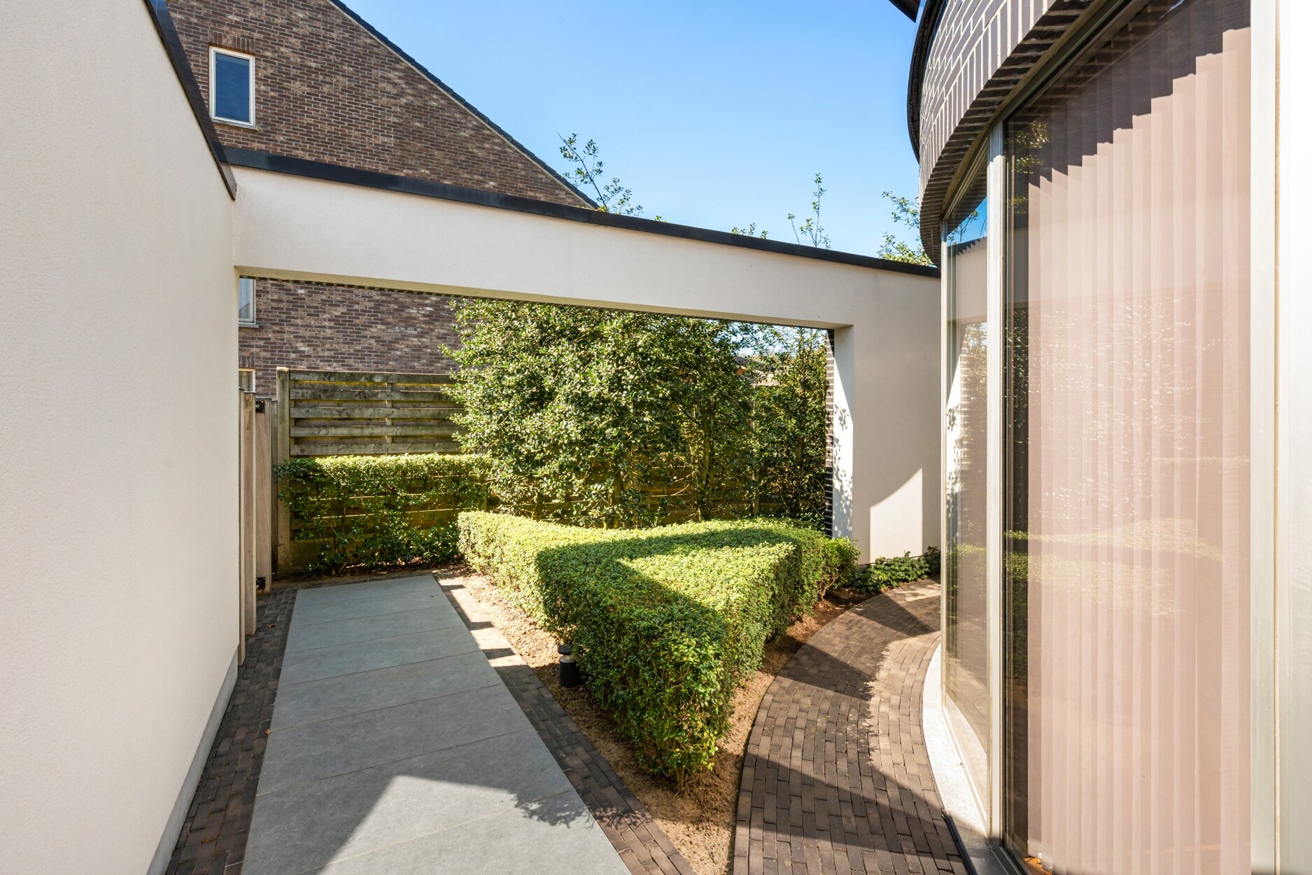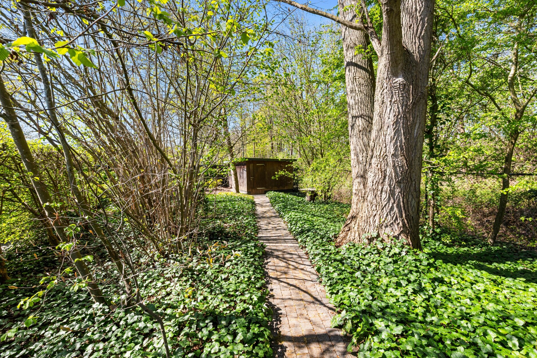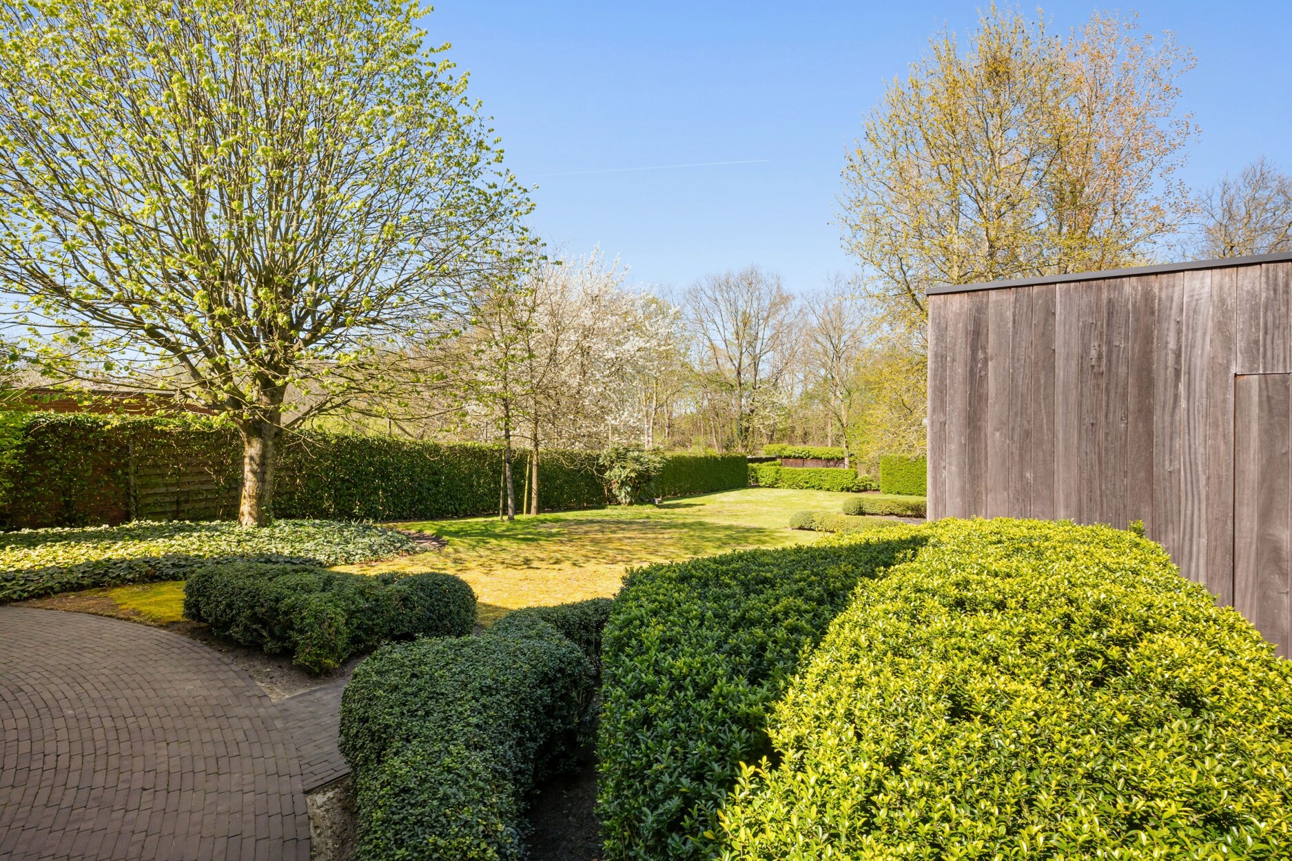 De tuin biedt een oase van rust door zijn fraaie beplanting en uitzicht op het achterliggende natuurgebied. De tuin is volledig omheind en uitgerust met robotmaaier. Op het perceel bevindt er zich een aparte garage, alsook een multifunctioneel bijgebouw met kitchenette wat ideaal is als gastenverblijf of tuinbureau. Dit bijgebouw is bijkomstig voorzien van een overdekt terras waardoor het hier in ieder seizoen zalig vertoeven is.