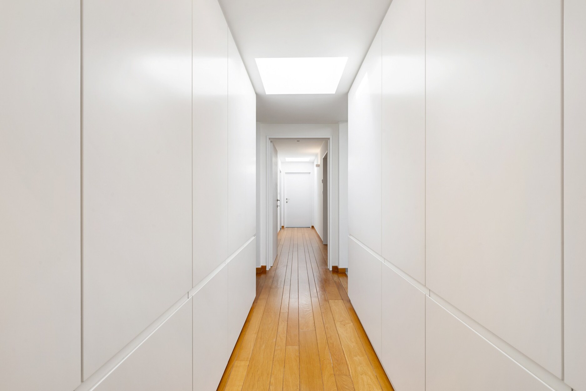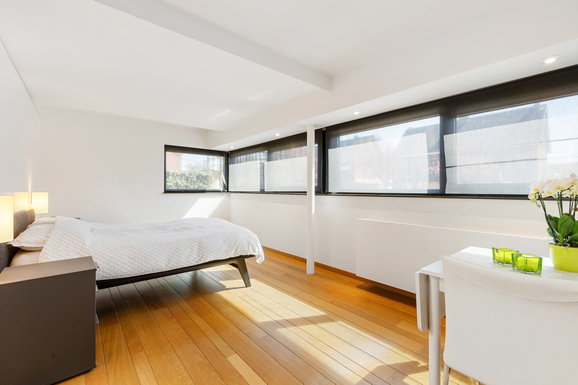 Oorspronkelijk beschikte de woning over drie slaapkamers, waarvan er momenteel twee samengevoegd zijn tot een royale masterbedroom. Deze slaapkamer beschikt over een eigen dressing met op maat gemaakte kasten en een prachtige badkamer met ligbad, inloopdouche en hoogwaardig afgewerkt badkamermeubel.