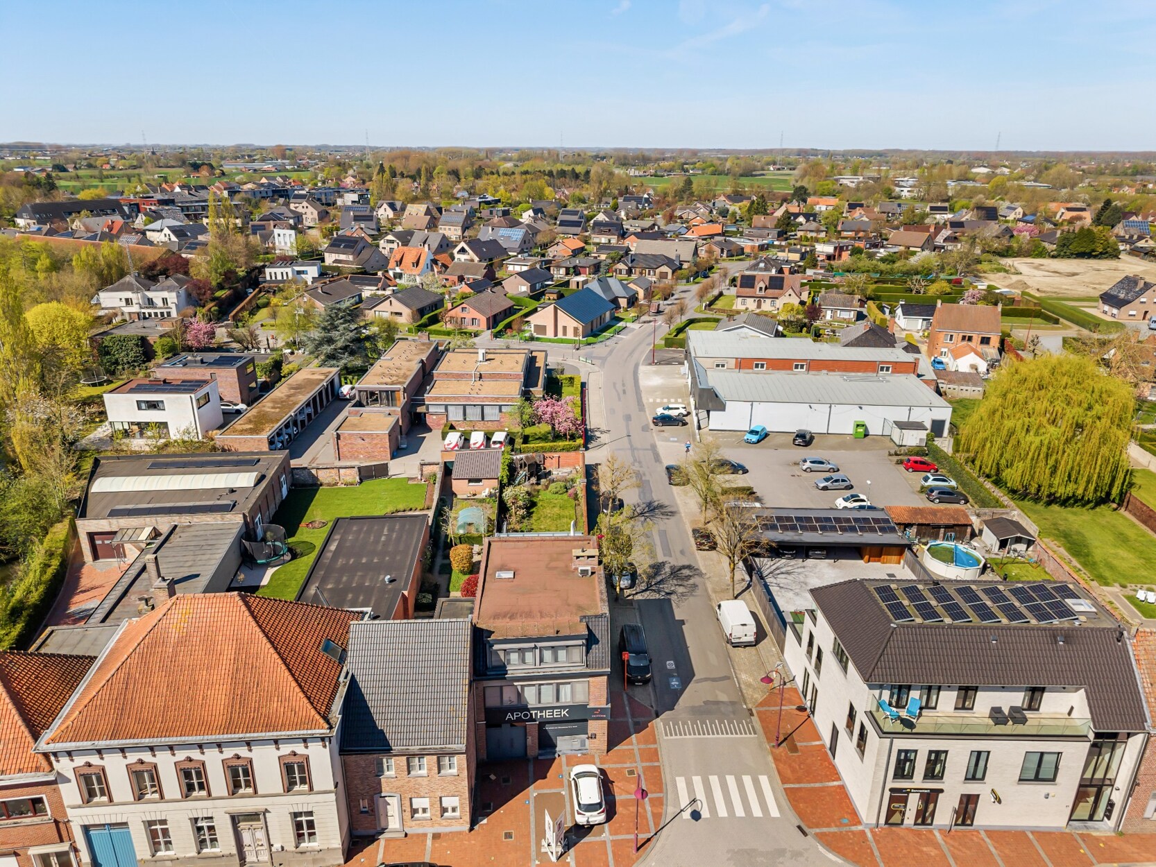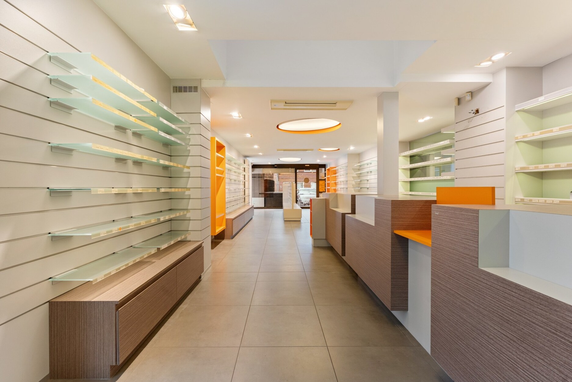 Het gelijkvloers, momenteel ingericht als apotheek, kan volledig of gedeeltelijk als commerciële ruimte worden gebruikt.