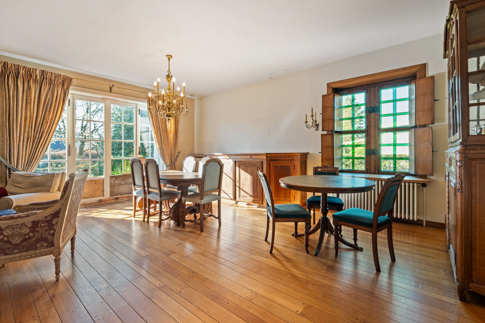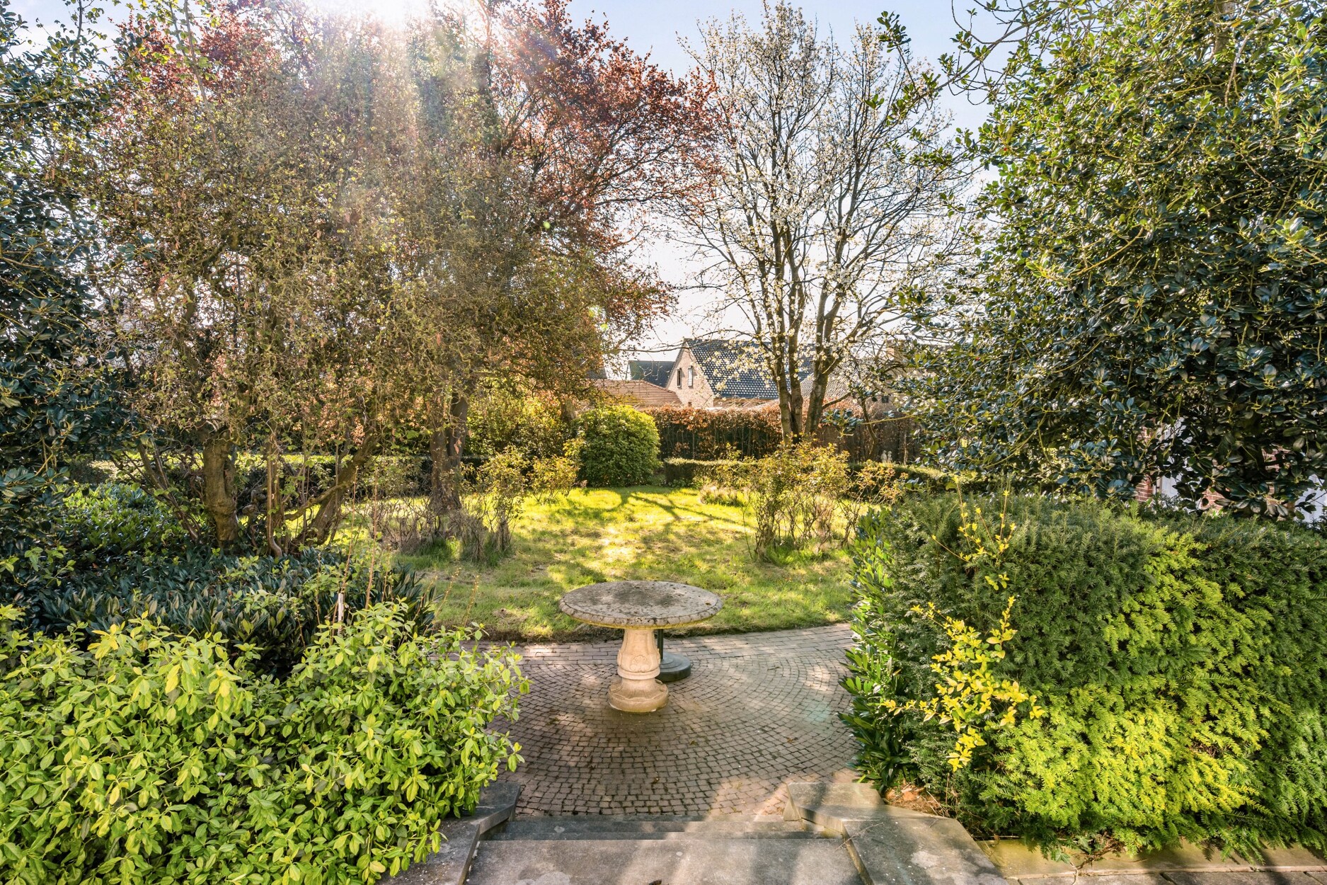 We betreden de woning via de imposante traphal, deze benadrukt het tijdloze karakter van de woning. Via de inkomhal met gastentoilet is er mogelijkheid om naar de woonkamer, eetkamer, keuken of bureau te gaan. De keuken heeft een prachtige verbinding met de veranda, die uitzicht geeft over de tuin. Achteraan geniet u van een uitzonderlijk mooi zicht op de diepe, groene tuin – een rustige en private plek.