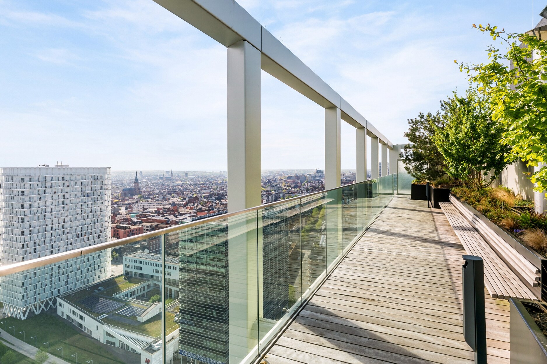 Extra troef: op de 23ste verdieping bevindt zich een gemeenschappelijk dakterras van zo’n 100m² met zicht over Antwerpen en de dokken.