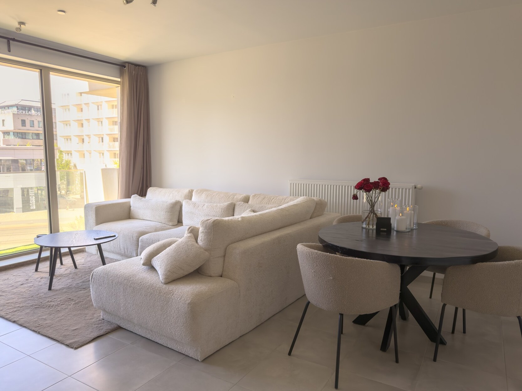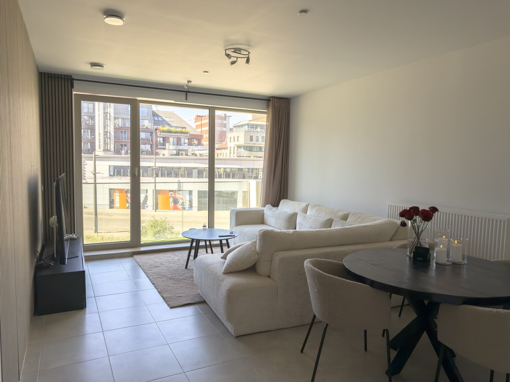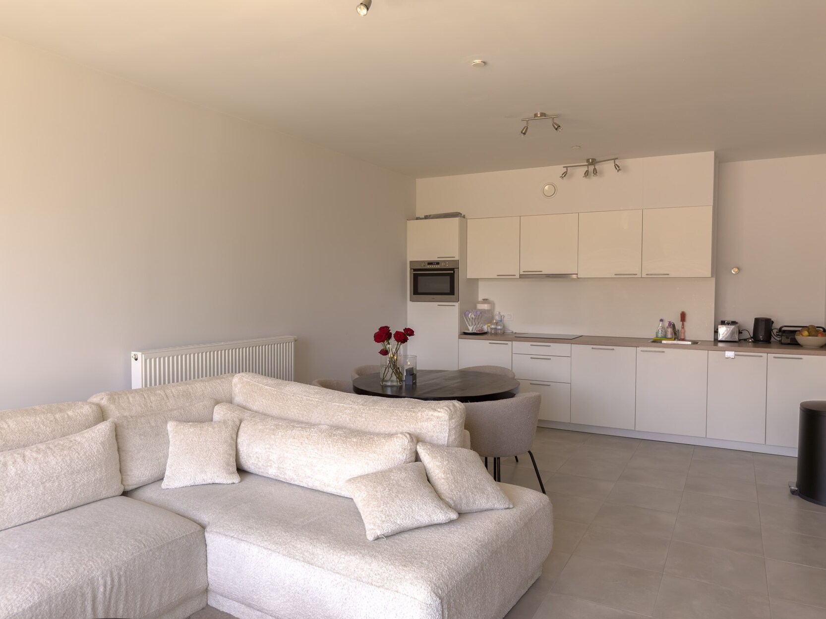 De lichtrijke leefruimte geeft uit op het west-georiënteerd terras, waar je vanaf de middag kan genieten van de zon. De open keuken is volledig uitgerust met een inductiekookplaat, combi-oven, ingebouwde vaatwasser en spoelbak.