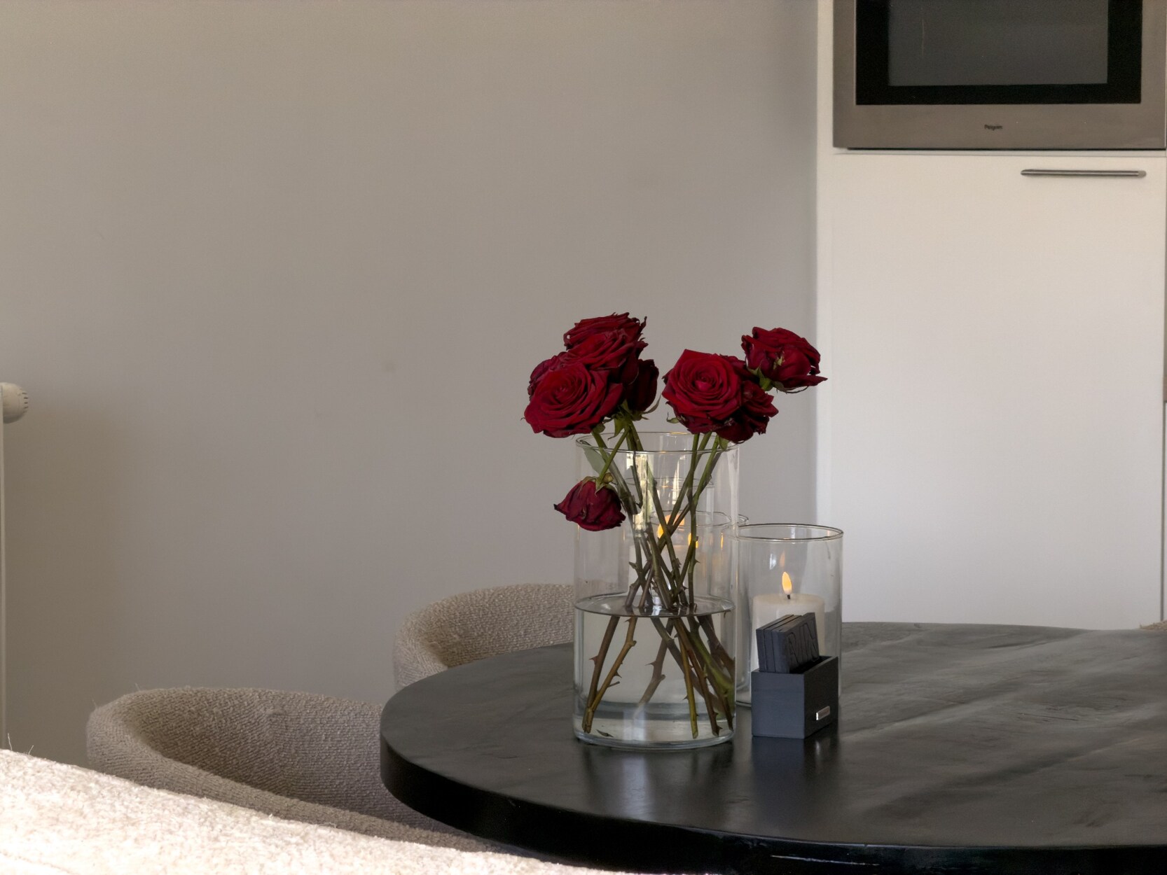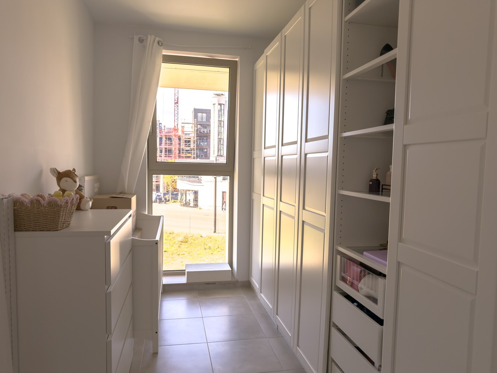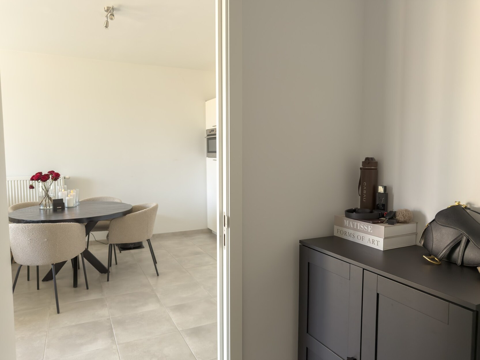 De lichtrijke leefruimte geeft uit op het west-georiënteerd terras, waar je vanaf de middag kan genieten van de zon. De open keuken is volledig uitgerust met een inductiekookplaat, combi-oven, ingebouwde vaatwasser en spoelbak.
