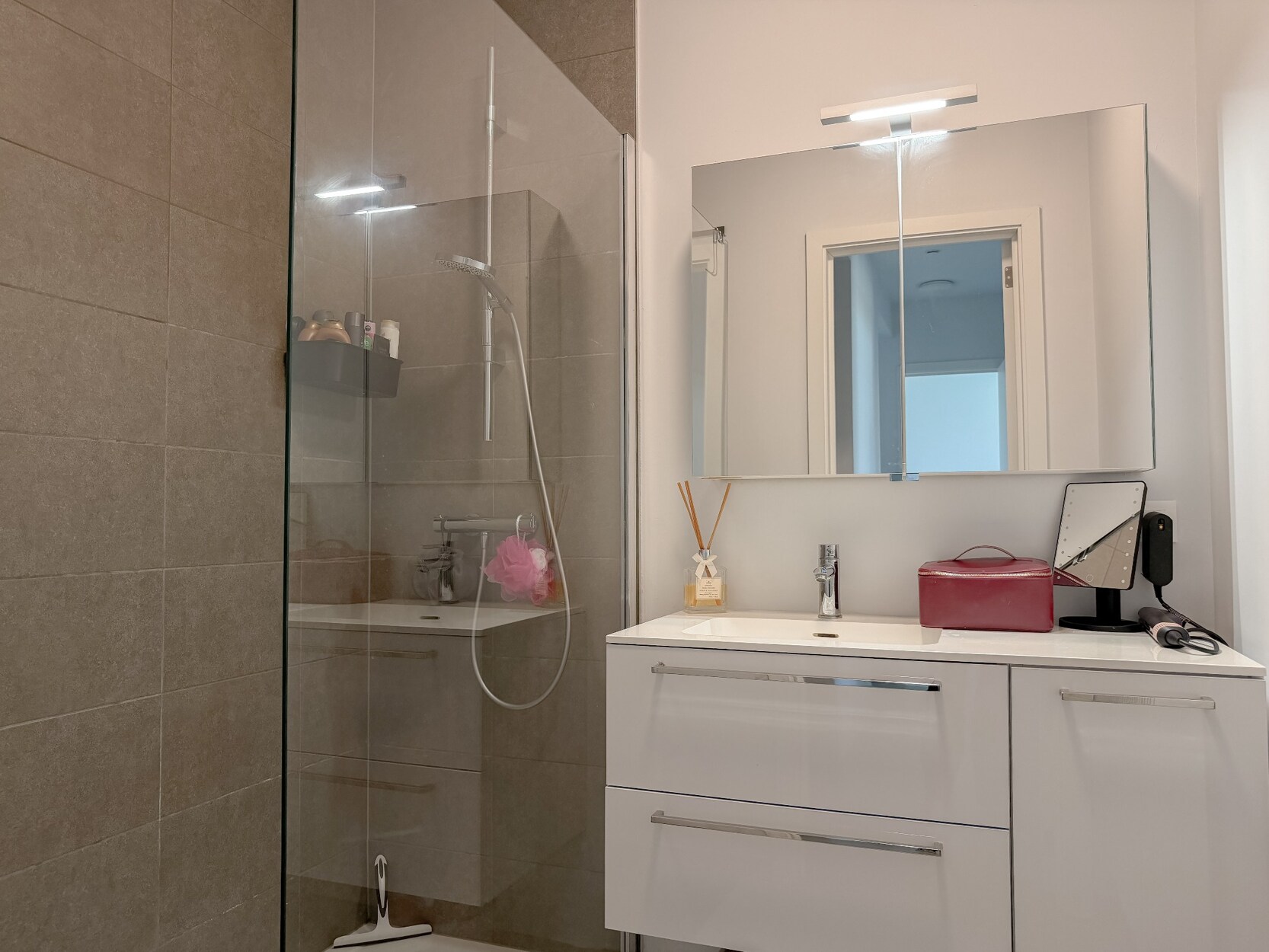 Het appartement beschikt over 2 slaapkamers van 14m² en 9m². De badkamer is ingericht met een inloopdouche en een lavabomeubel.