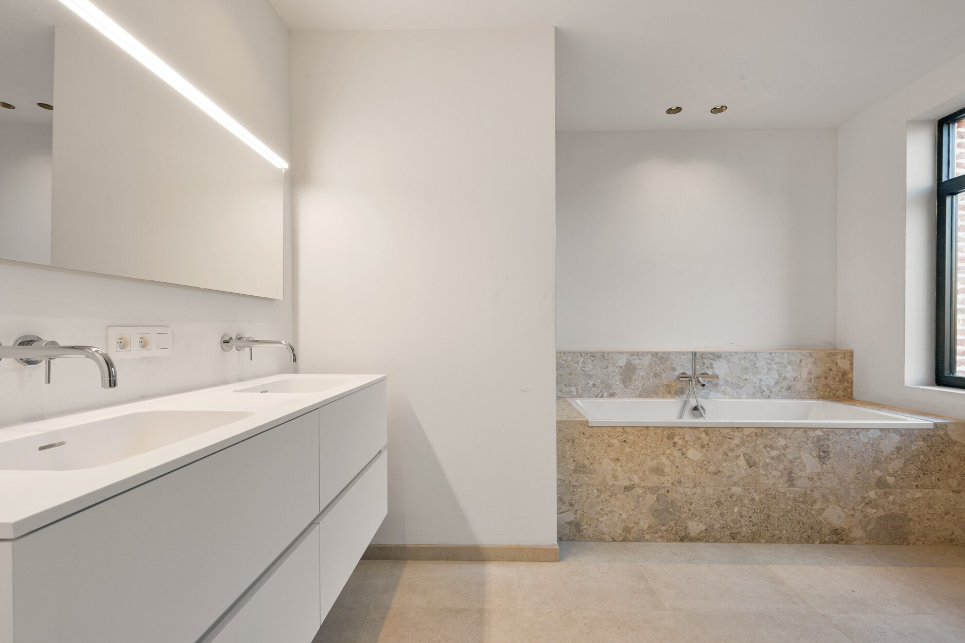 Op de eerste verdieping bevinden zich drie volwaardige slaapkamers, waaronder een ruime masterbedroom met dressing. De moderne badkamer is uitgerust met een ligbad, inloopdouche en dubbele wastafel in meubel. Daarnaast vindt u op deze verdieping een apart tweede toilet en een ruime nachthal, waar u indien gewenst ingemaakte kasten kan voorzien.