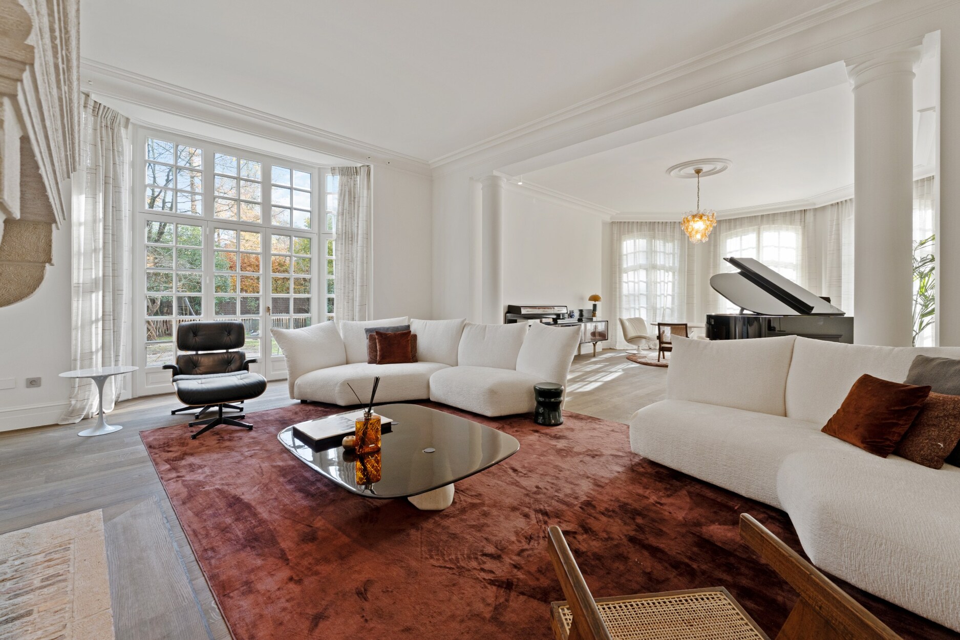 De formele eetkamer straalt grandeur uit met haar hoge plafonds, moulures, dubbele deuren en grote ramen met zicht op de tuin. Aansluitend bevindt zich het stijlvolle salon met brede houten vloeren, verfijnde raambekleding en een indrukwekkende natuurstenen schouwmantel. De aangrenzende muziekkamer met grote erker en vleugelpiano vormt een aparte, lichtrijke zithoek.