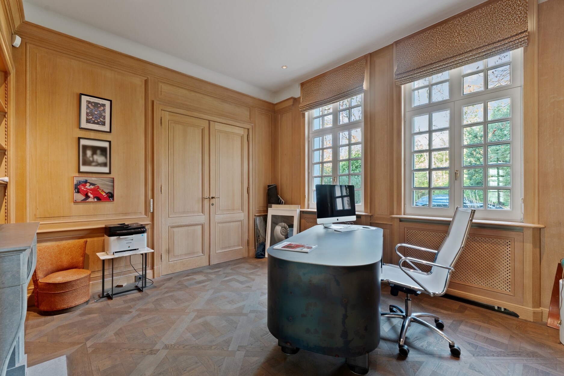 Verder beschikt de gelijkvloerse verdieping over een ruim bureel/bibliotheek, volledig uitgevoerd in maatwerk eikenhout met ingemaakte kasten en open haard — een perfecte rustige werk- of leesruimte.