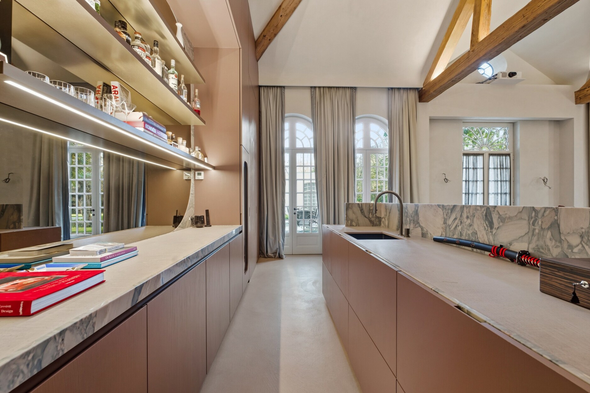De volledig vernieuwde leefkeuken met centrale eetplaats onder een spectaculaire glazen dakkoepel vormt het warme hart van de woning. De keuken is uitgerust met maatwerkkasten, natuurstenen werkbladen, hoogwaardige toestellen en vloerlange gordijnen die uitgeven op het terras. Aansluitend bevindt zich een praktische, ruime bijkeuken.
