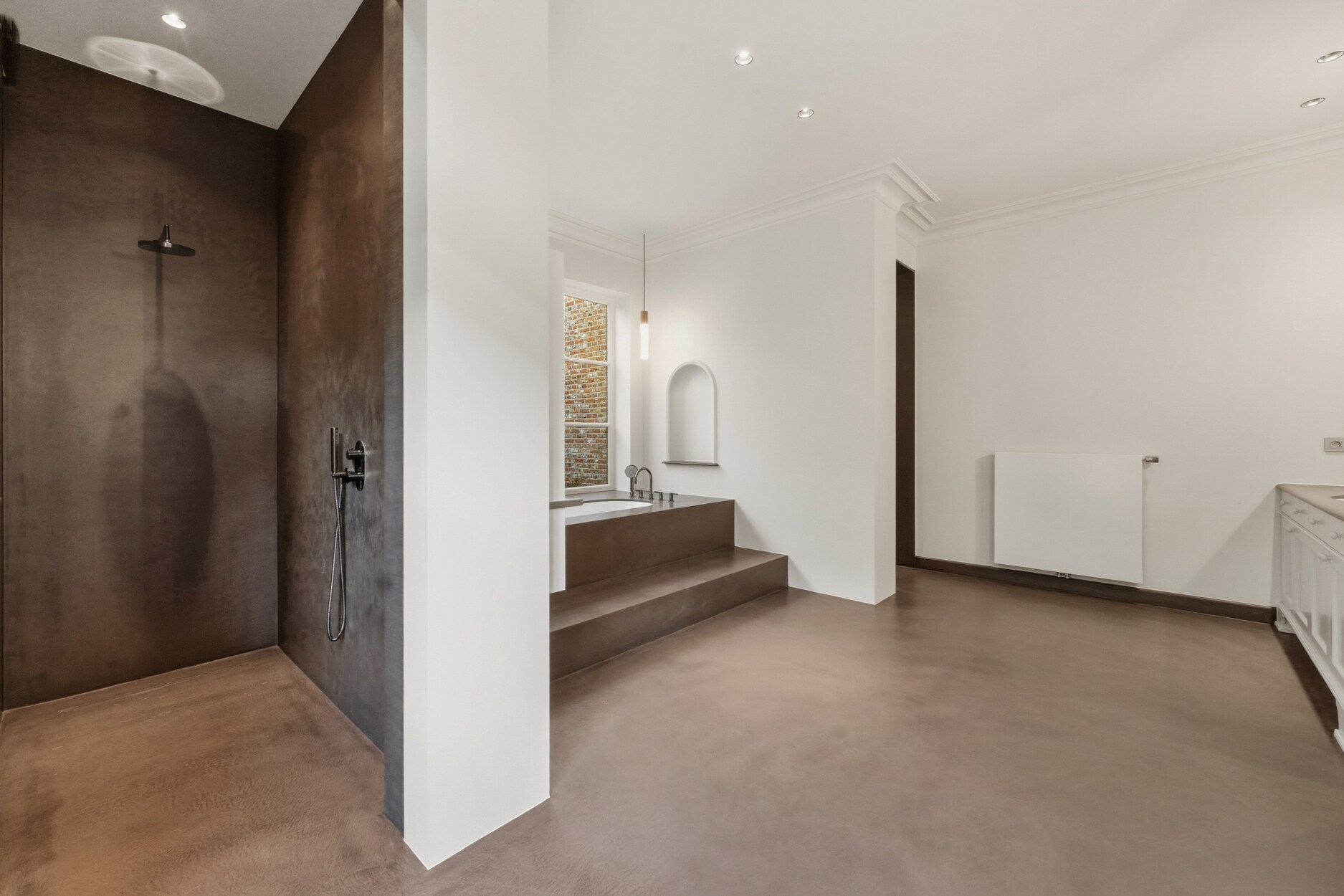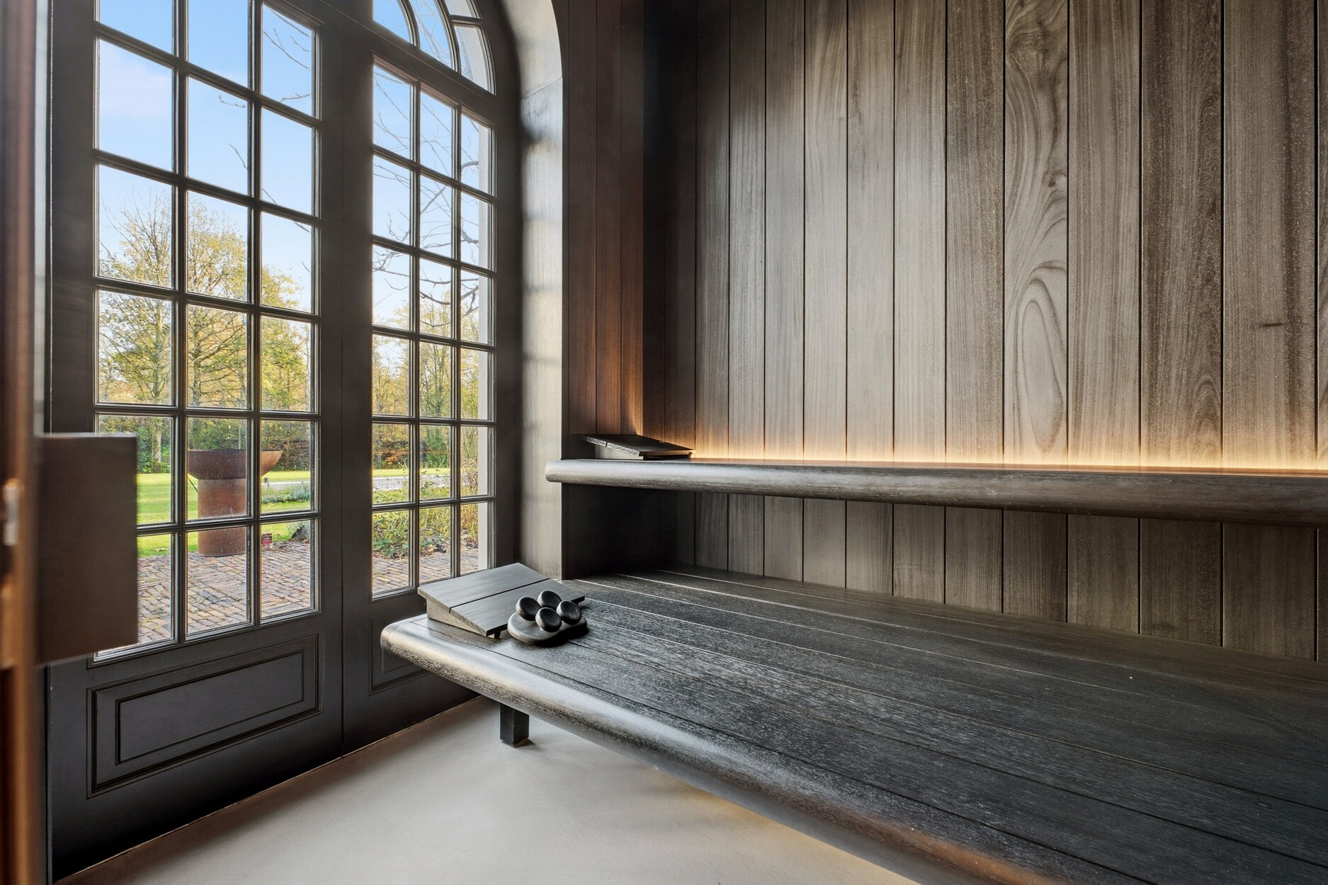 Aansluitend bevindt zich de luxueuze wellness, bestaande uit een authentieke hammam in mozaïek en microtopping, en een stijlvolle sauna in donker thermowood met boogramen die uitkijken op de tuin. Deze ruimte creëert een serene spa-beleving binnen eigen huis.
