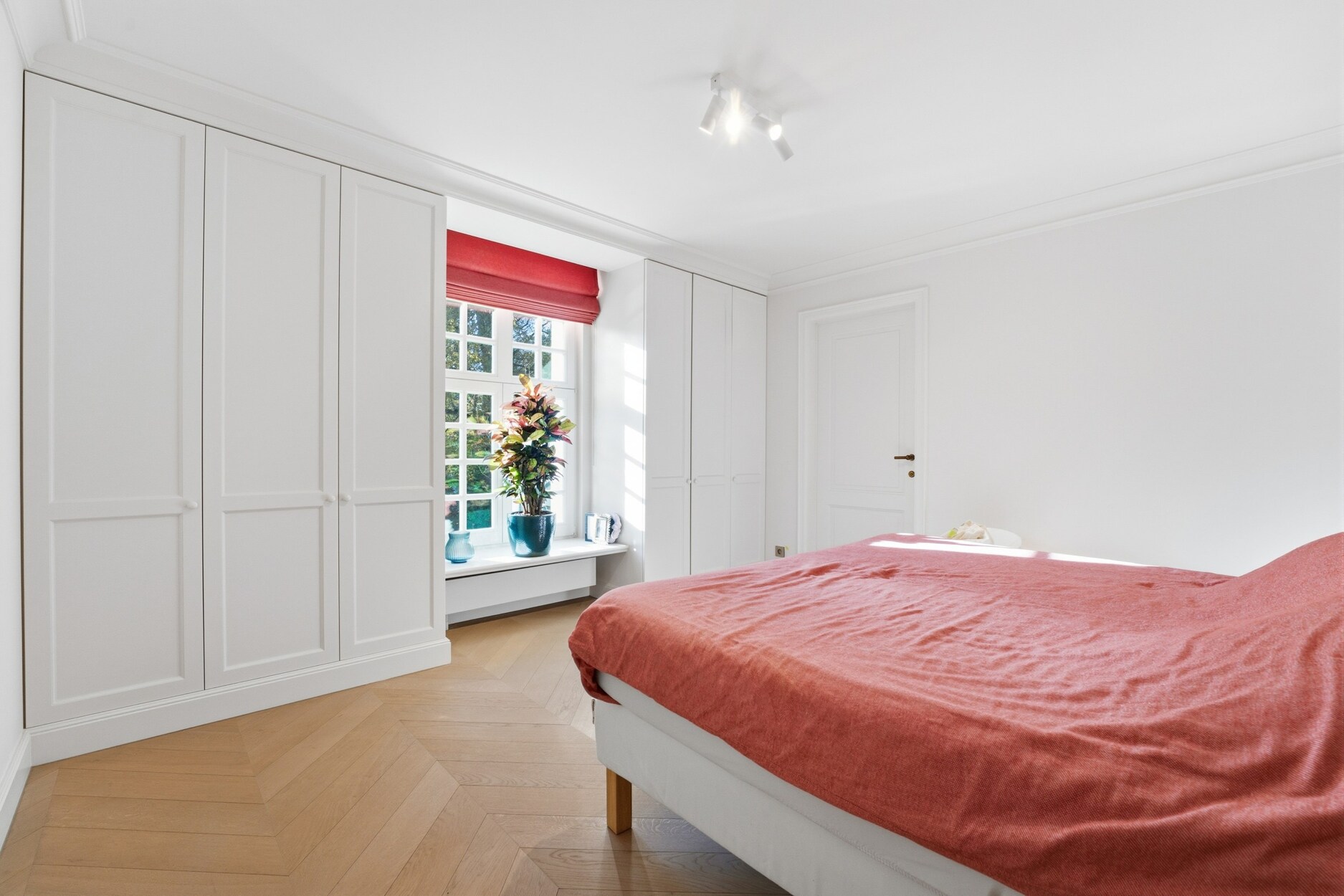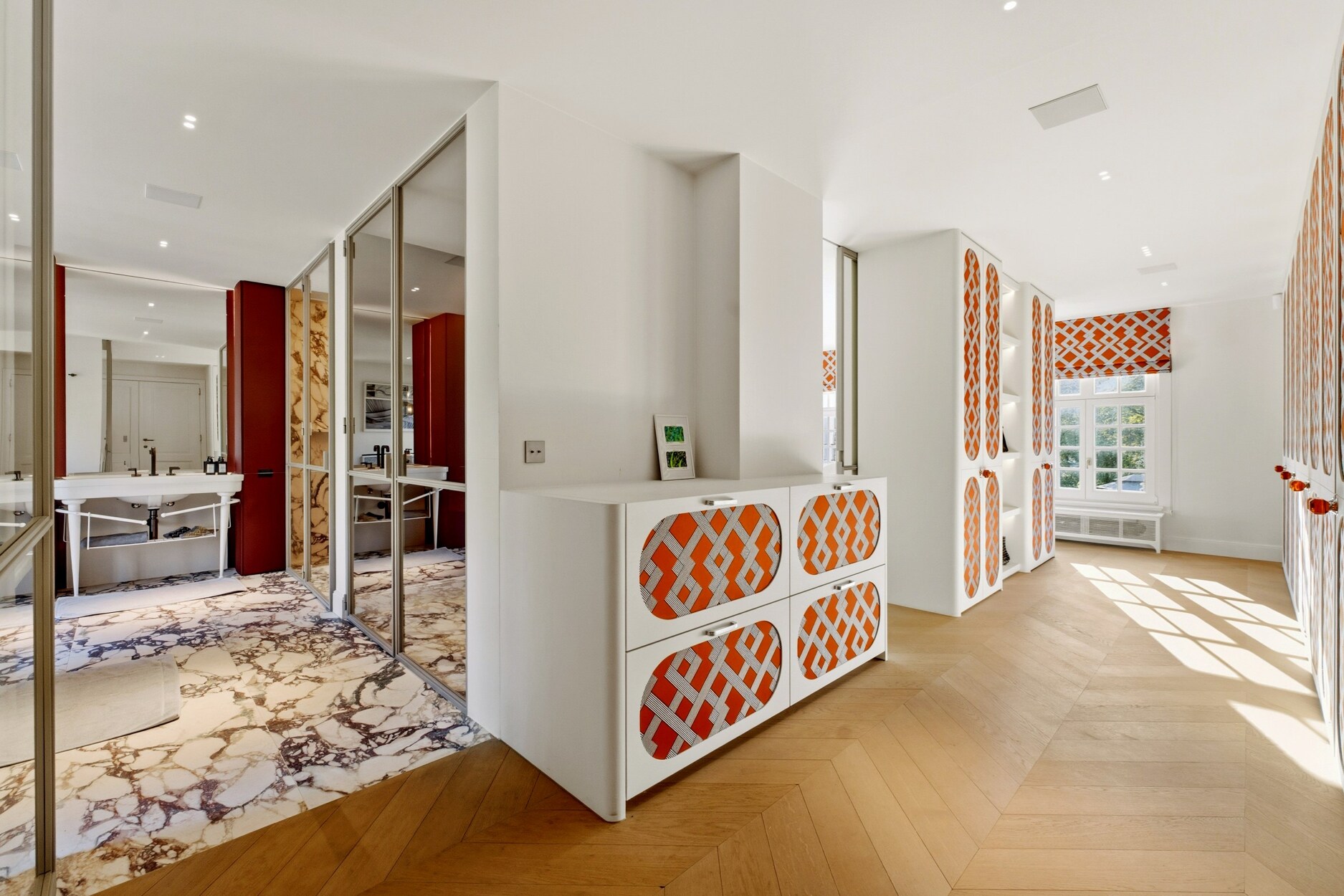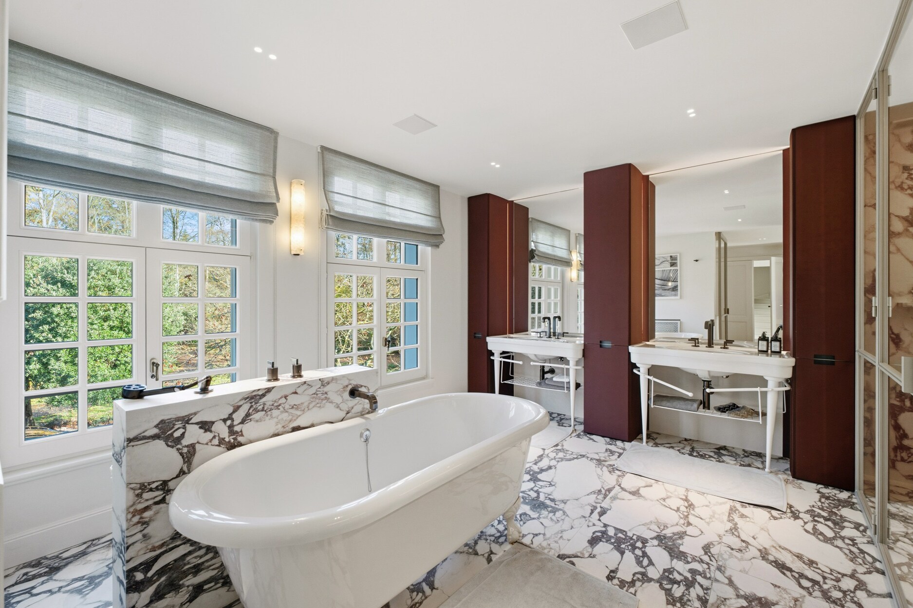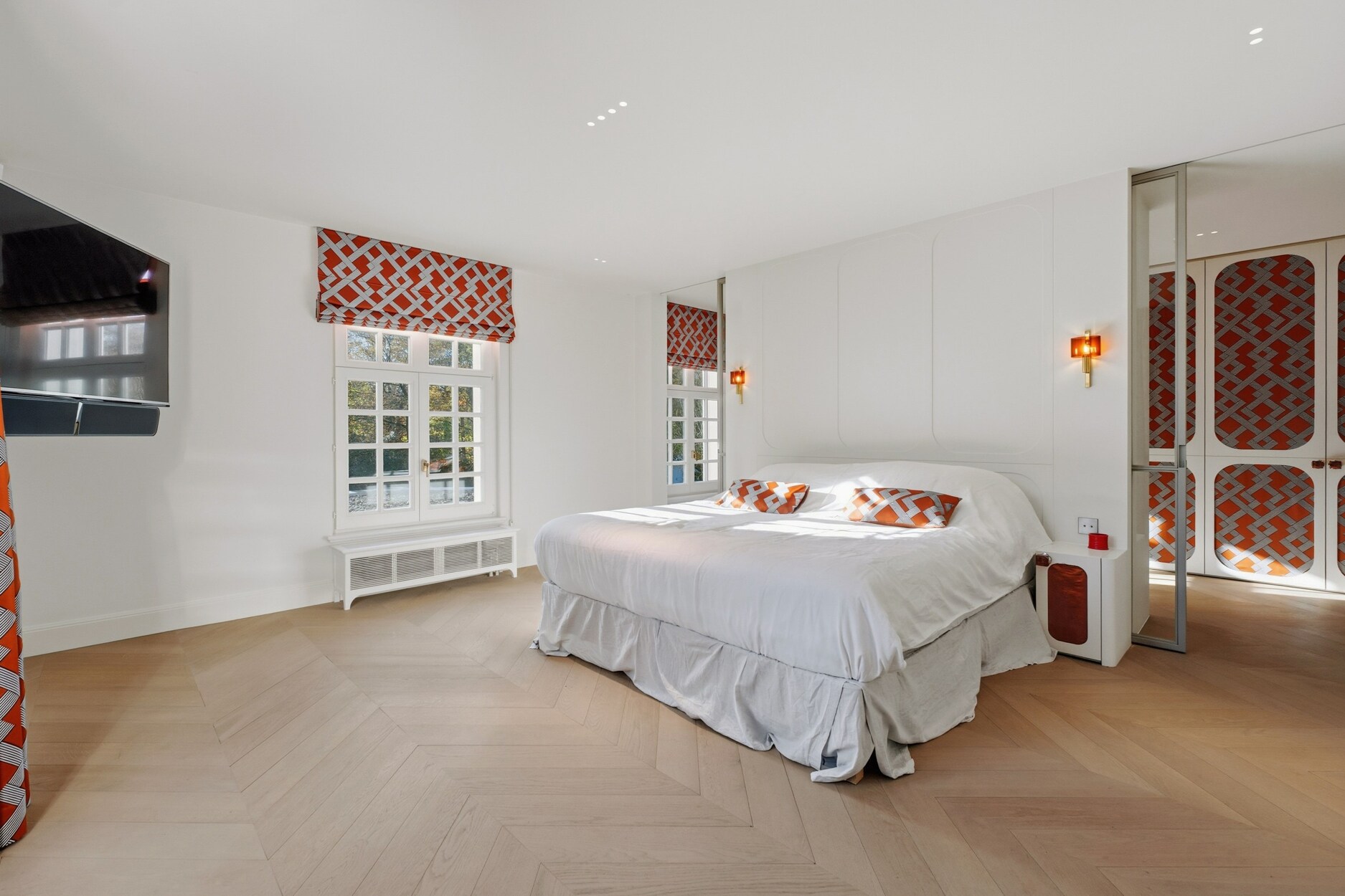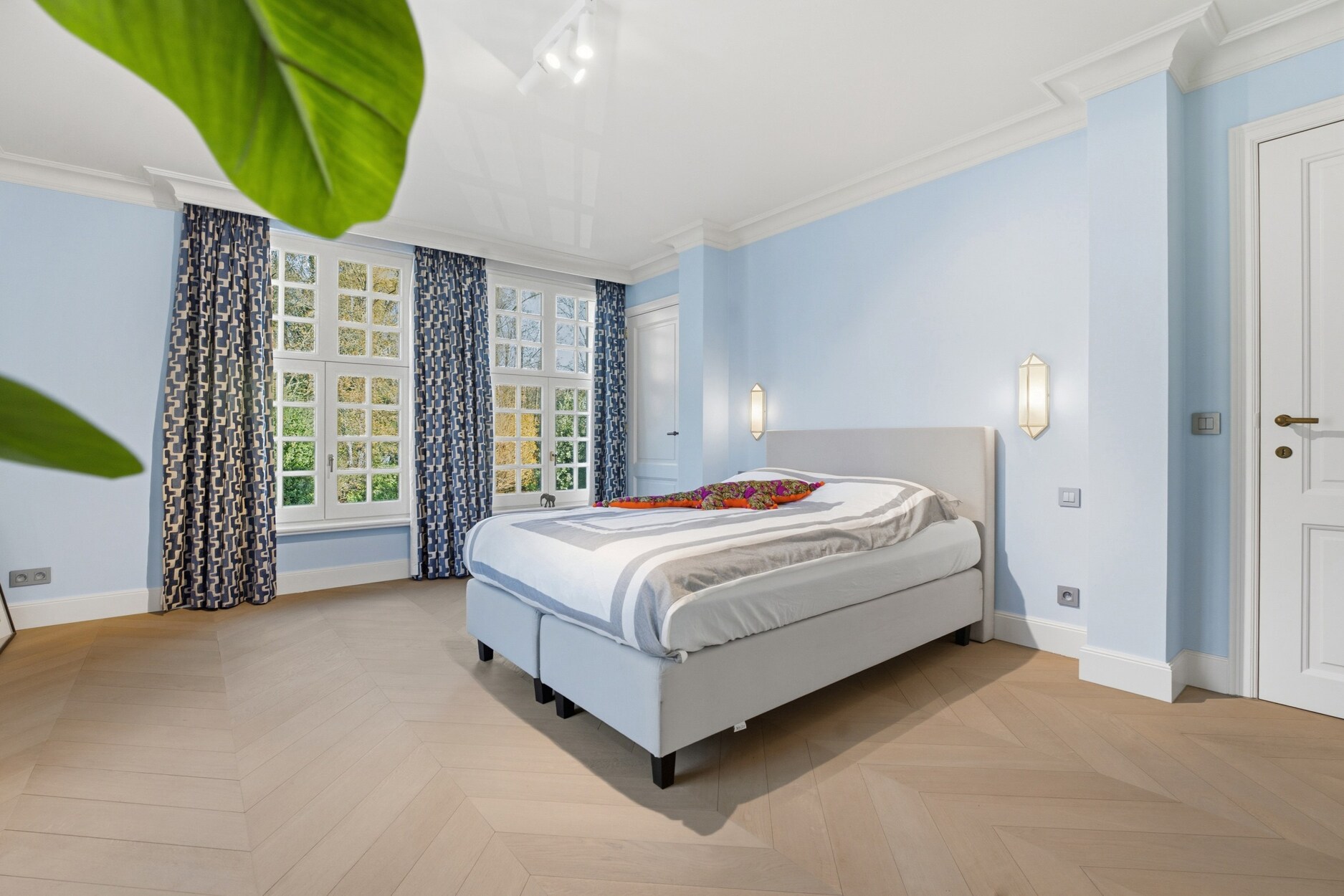 De master suite omvat een ruime slaapkamer met visgraatparket, maatwerkkasten en een indrukwekkende op maat gemaakte dressing met decoratieve grafische panelen. De ensuite badkamer is een absolute eyecatcher, uitgevoerd in rijk marmer en voorzien van een vrijstaand bad, dubbele wastafel, grote spiegels, luxe armaturen en ramen met zicht op het groen.