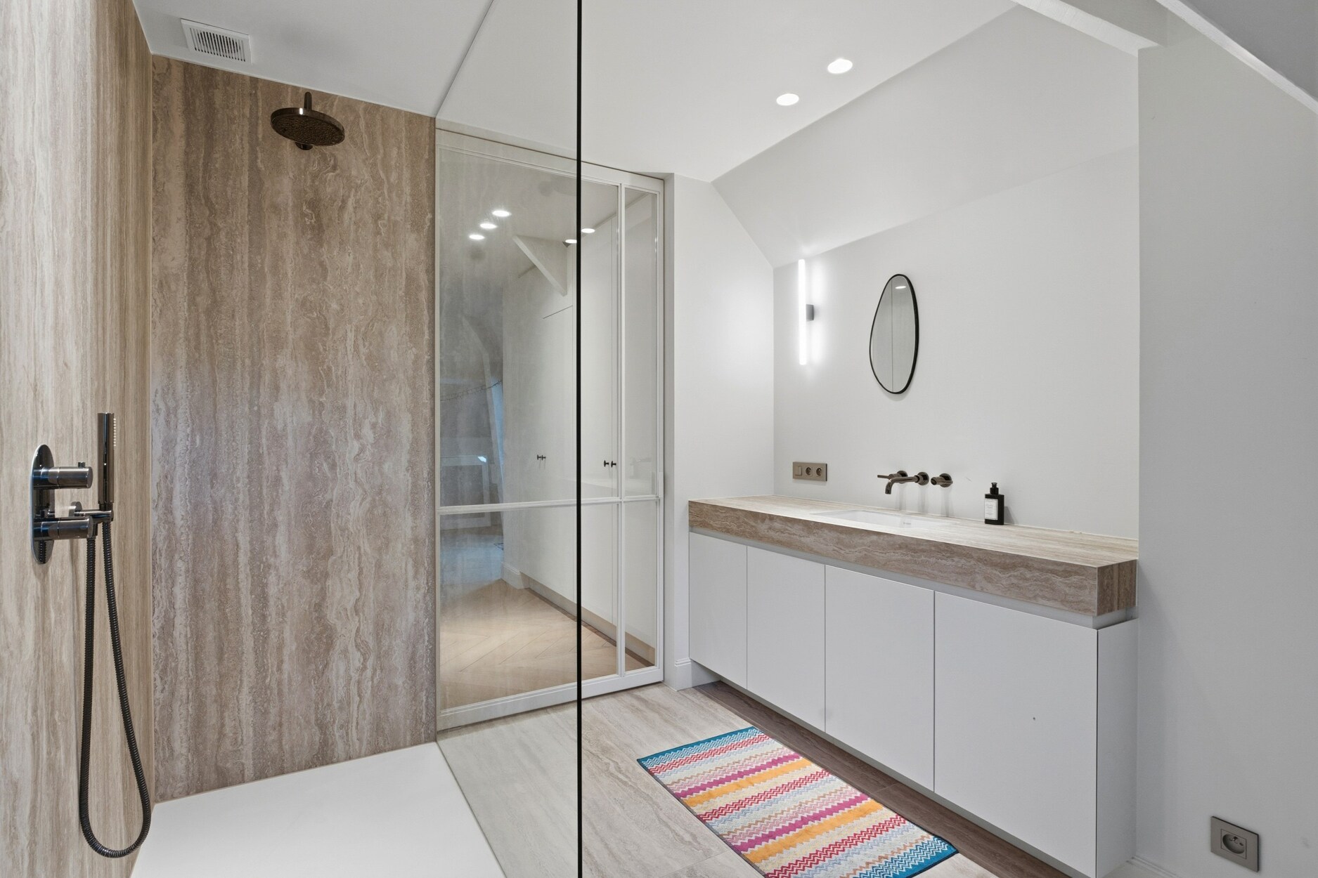 De tweede verdieping werd ingericht als een charmante, volledig autonome suite. Een gezellige TV-hoek met zichtbare houten balken vormt het hart van deze verdieping. Aansluitend bevindt zich een ruime slaapkamer met bureauhoek, een aparte dressing met maatwerkkasten en een moderne badkamer uitgerust met inloopdouche en natuurstenen afwerking. Deze verdieping is ideaal als gastenruimte, tienersuite of private retreat.