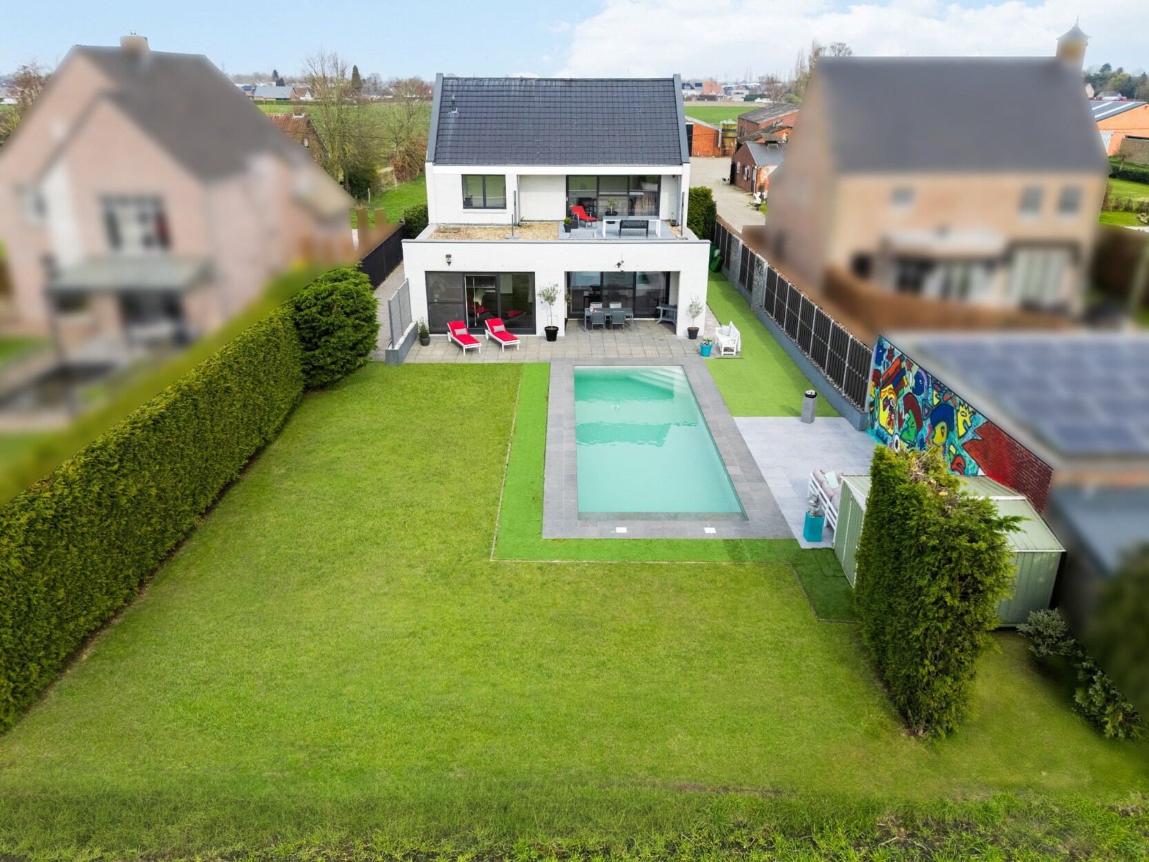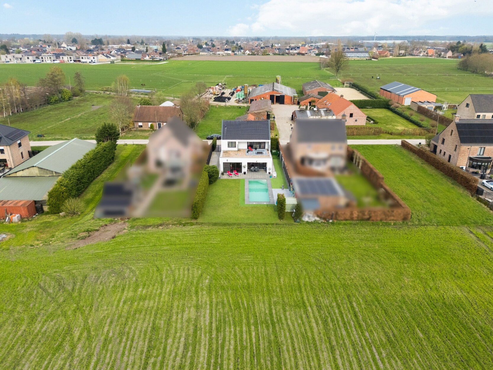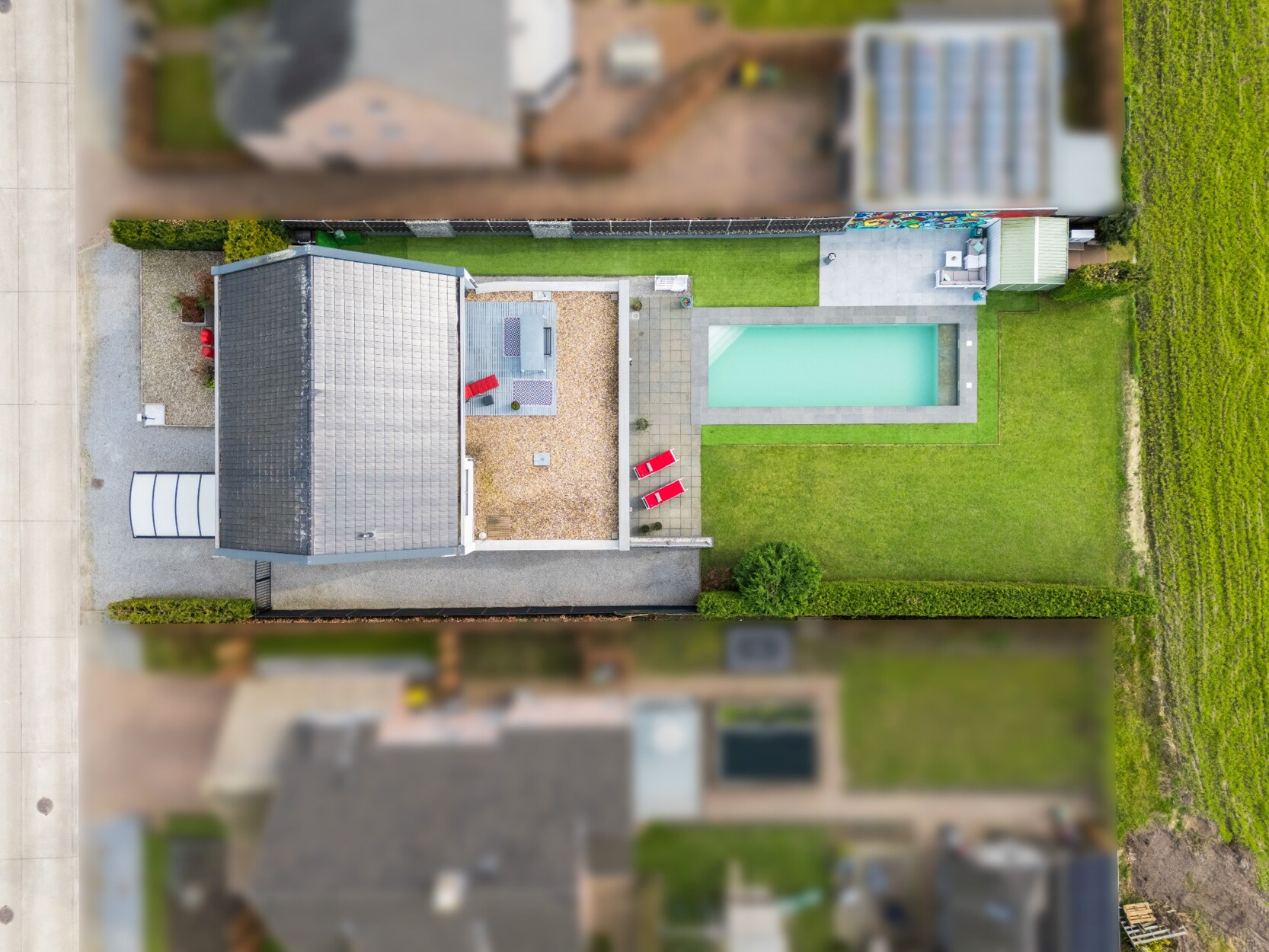 De zuid gerichte tuin biedt een hoge mate van privacy en vormt een ideale omgeving voor wie graag van het buitenleven geniet. Het verwarmde buitenzwembad, uitgerust met een afdekrolluik en zonnecollectoren, biedt een prachtig uitzicht op de achterliggende grasvelden en creëert een bijzonder rustige en aangename sfeer.