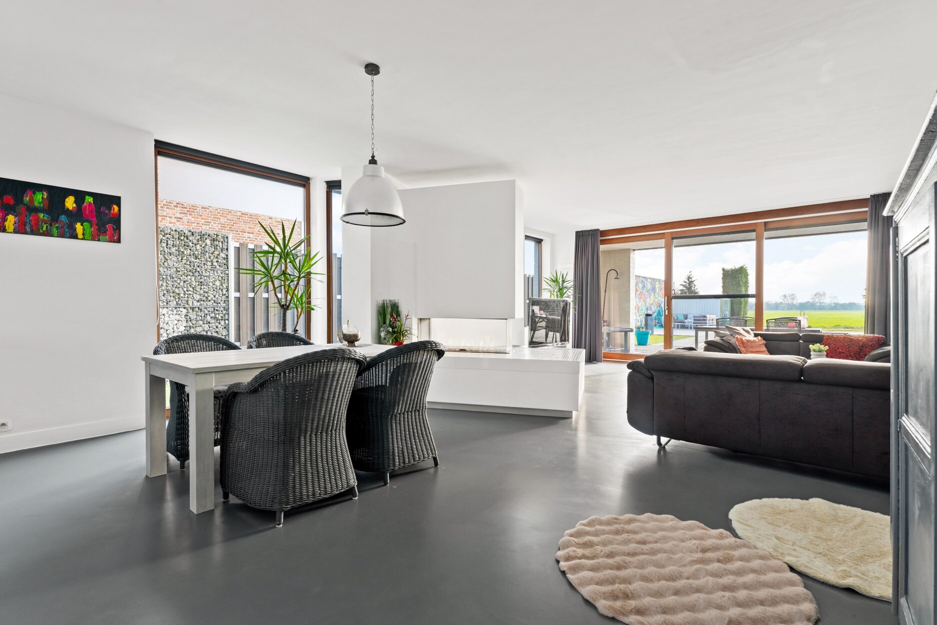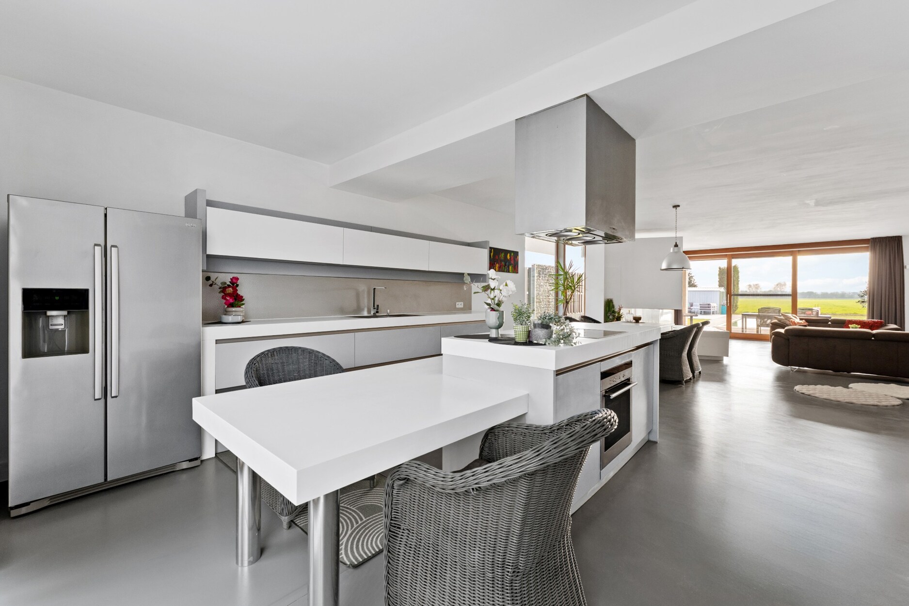 De ruime en lichtrijke leefruimte met open keuken vormt het kloppend hart van de woning. Hier bevindt zich een gezellige zithoek die uitnodigt tot ontspannen momenten. Dankzij de grote raampartijen geniet u van een overvloed aan natuurlijk licht en een prachtig panoramisch uitzicht op de tuin en het aangelegde zwembad.