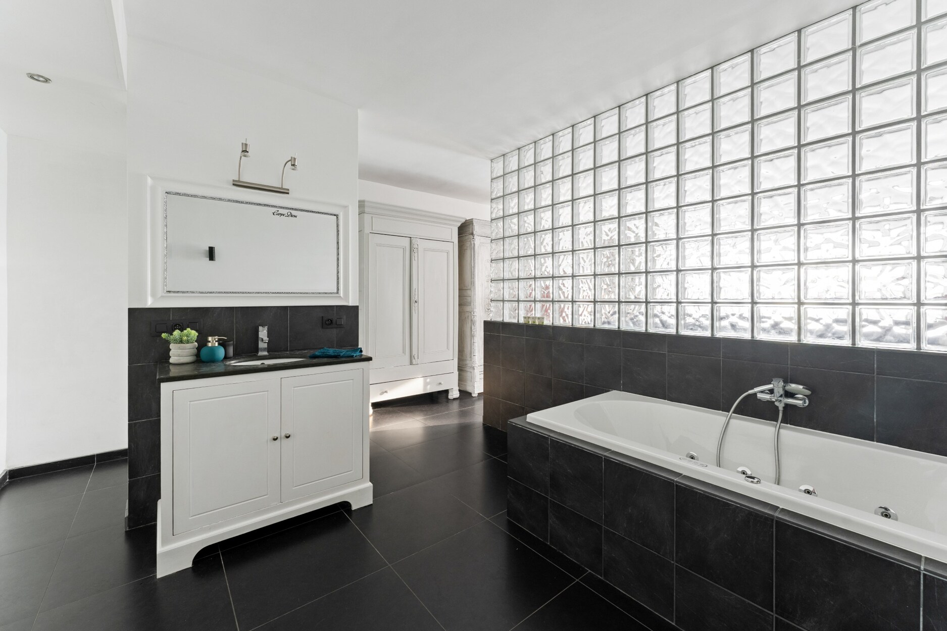 De badkamer beschikt over een dubbele wastafel in meubel, een ligbad en een inloopdouche.
