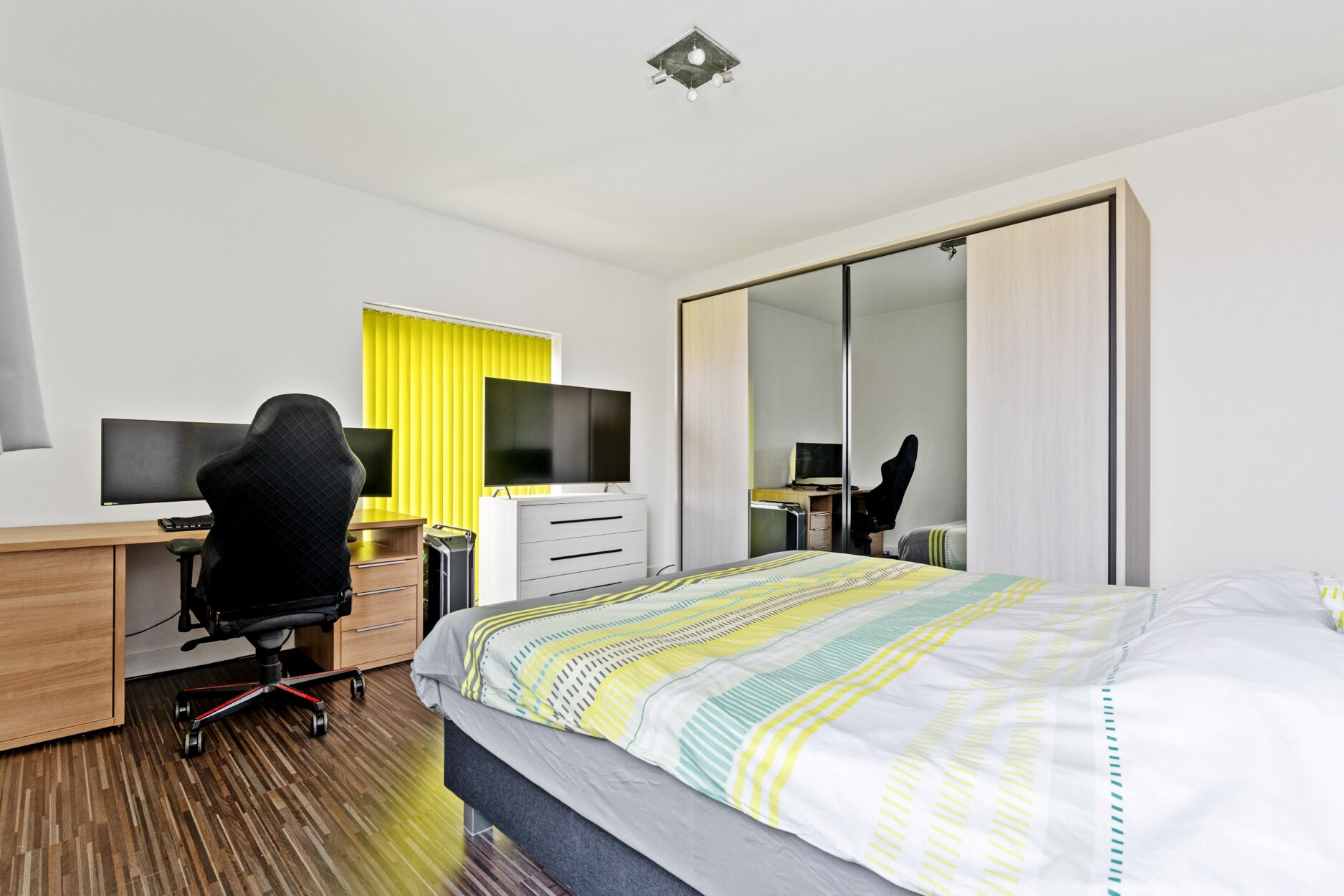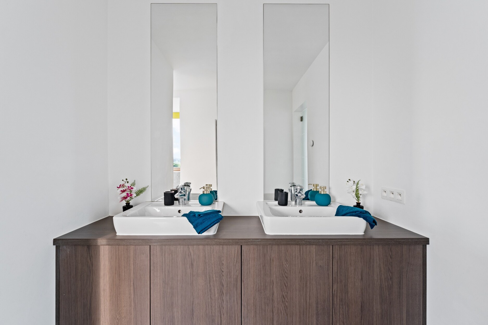 Op het gelijkvloers bevindt zich bovendien een ruime master suite met een comfortabele slaapkamer en een aansluitende badkamer. Deze badkamer is uitgerust met een jacuzzi, een wastafel, een inloopdouche en een toilet. Via de grote glazen schuifpui heeft u bovendien directe toegang tot het terras en het zwembad.