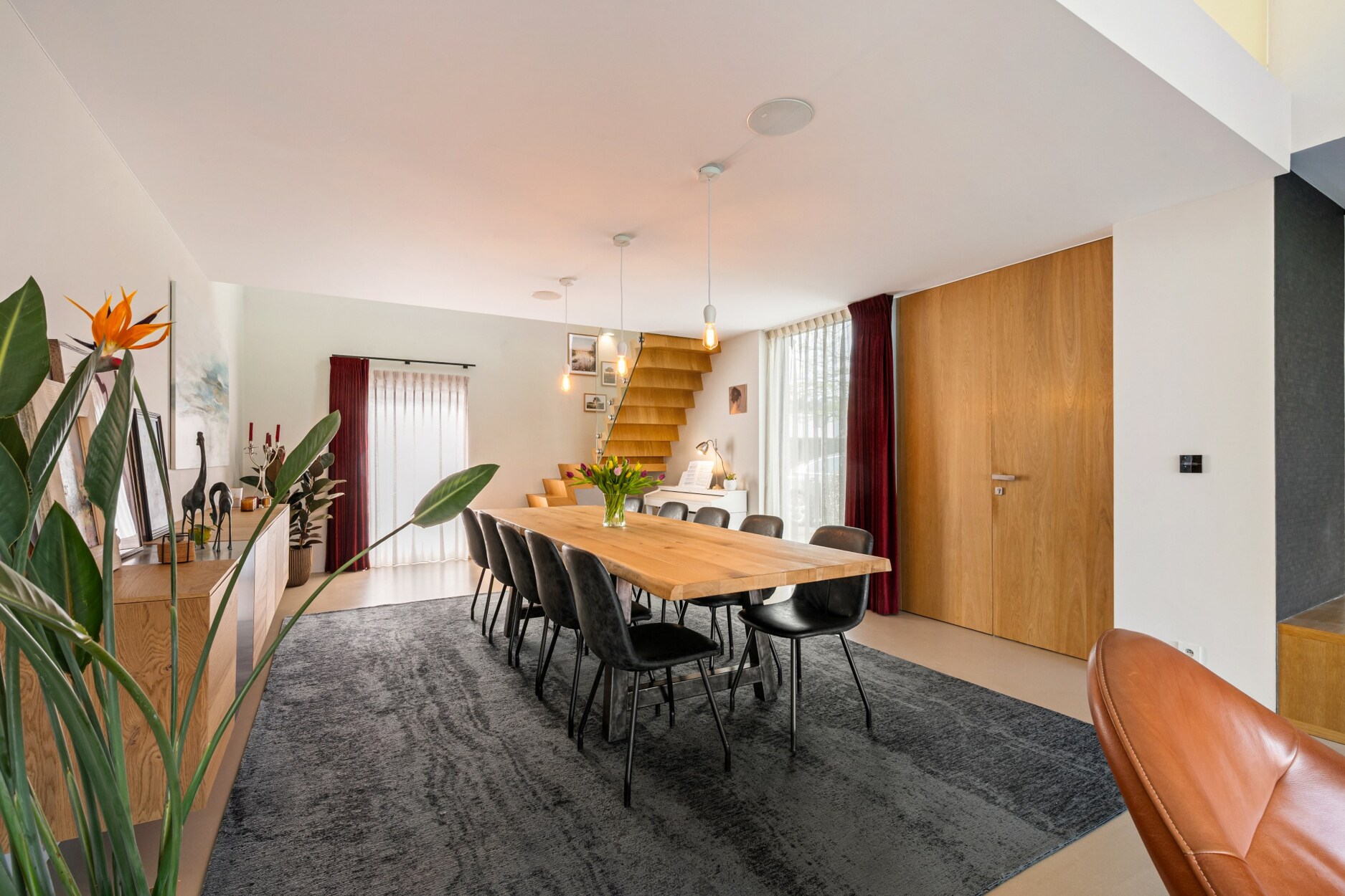 Via de inkomhal met gastentoilet heeft u enerzijds toegang tot de leefruimten en anderzijds tot de praktijkruimten (linkerzijde woning). De leefruimte is zeer ruim opgevat: gezellige zitruimte met gashaard en een eetgedeelte. De grote raampartijen bieden een mooie connectie met de gezellige tuin voorzien van ruim overdekt terras achteraan dewelke veel privacy biedt.