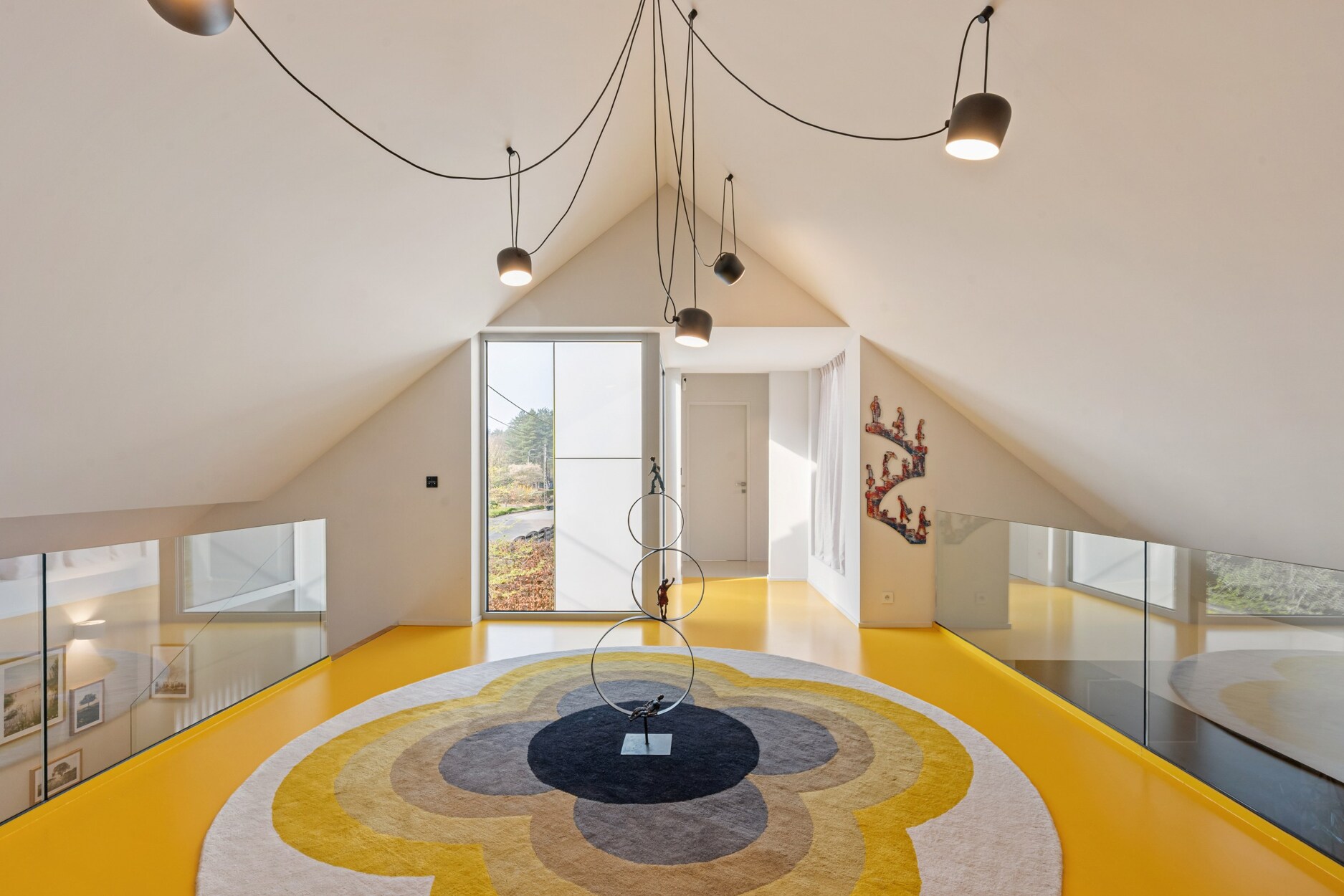 Op de verdieping is er een ruime overloop die momenteel is ingericht als multifunctionele televisieruimte. Verder zijn er 4 ruime slaapkamers, 2 toiletten en badkamer met wastafel en douche. Een van de slaapkamers is momenteel ingericht als fitness, hier is ook de technische ruimte terug te vinden.