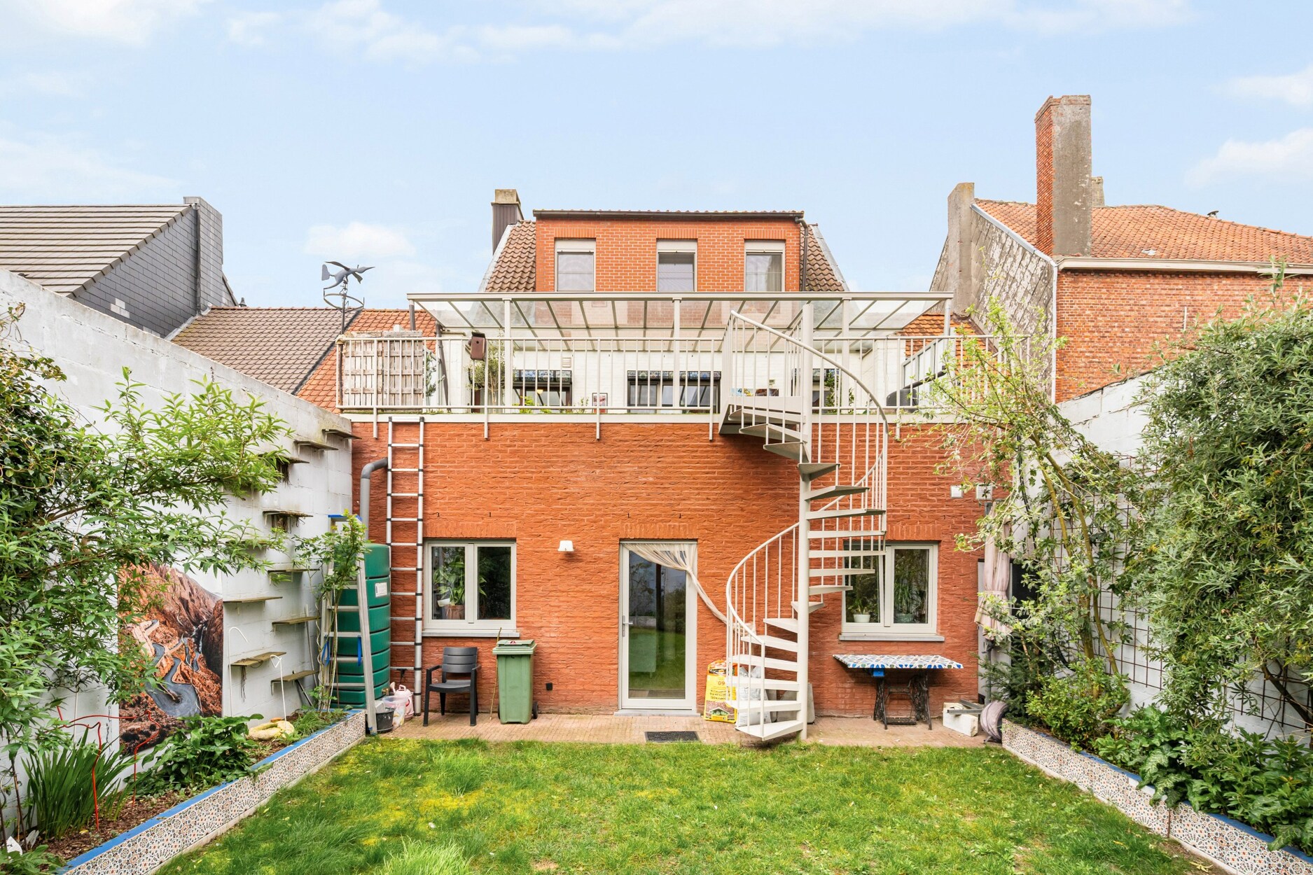 De eerste verdieping brengt ons tot de tweede woonst met een lichtrijke woonkamer, moderne keuken, berging/wasplaats, apart toilet en een zeer ruim overdekt dakterras.