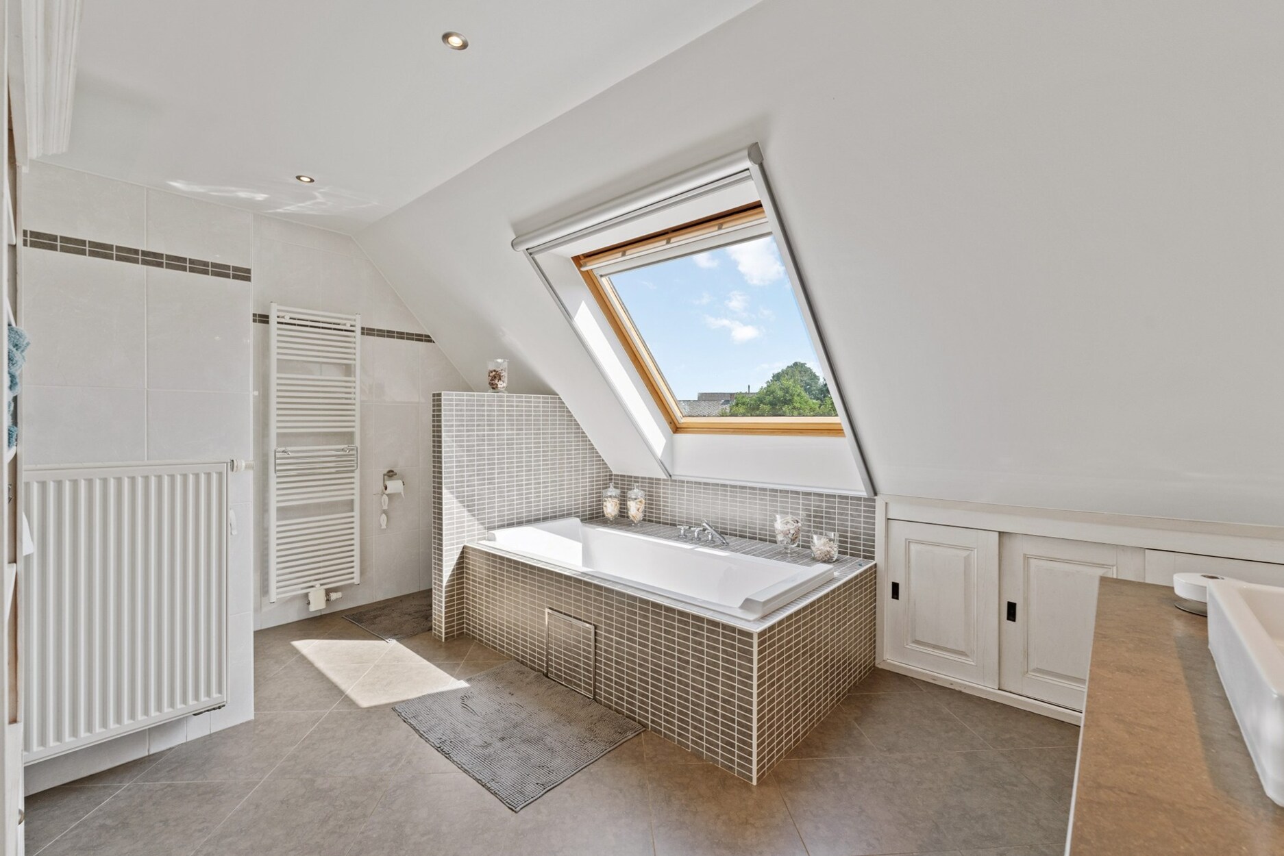 De bovenverdieping is uitgerust met parket en is opgedeeld in een master bedroom met bijhorende dressing en 2 extra slaapkamers. De badkamer is ruim en voorzien van een ligbad, douche, lavabo en toilet. Praktische wasplaats en zeer ruime polyvalente ruimte die toegang geeft tot een extra zolder.