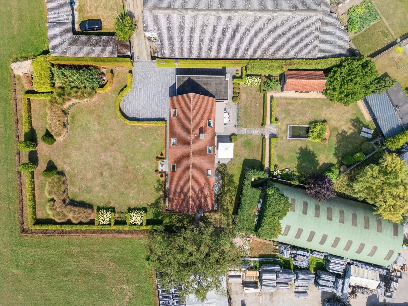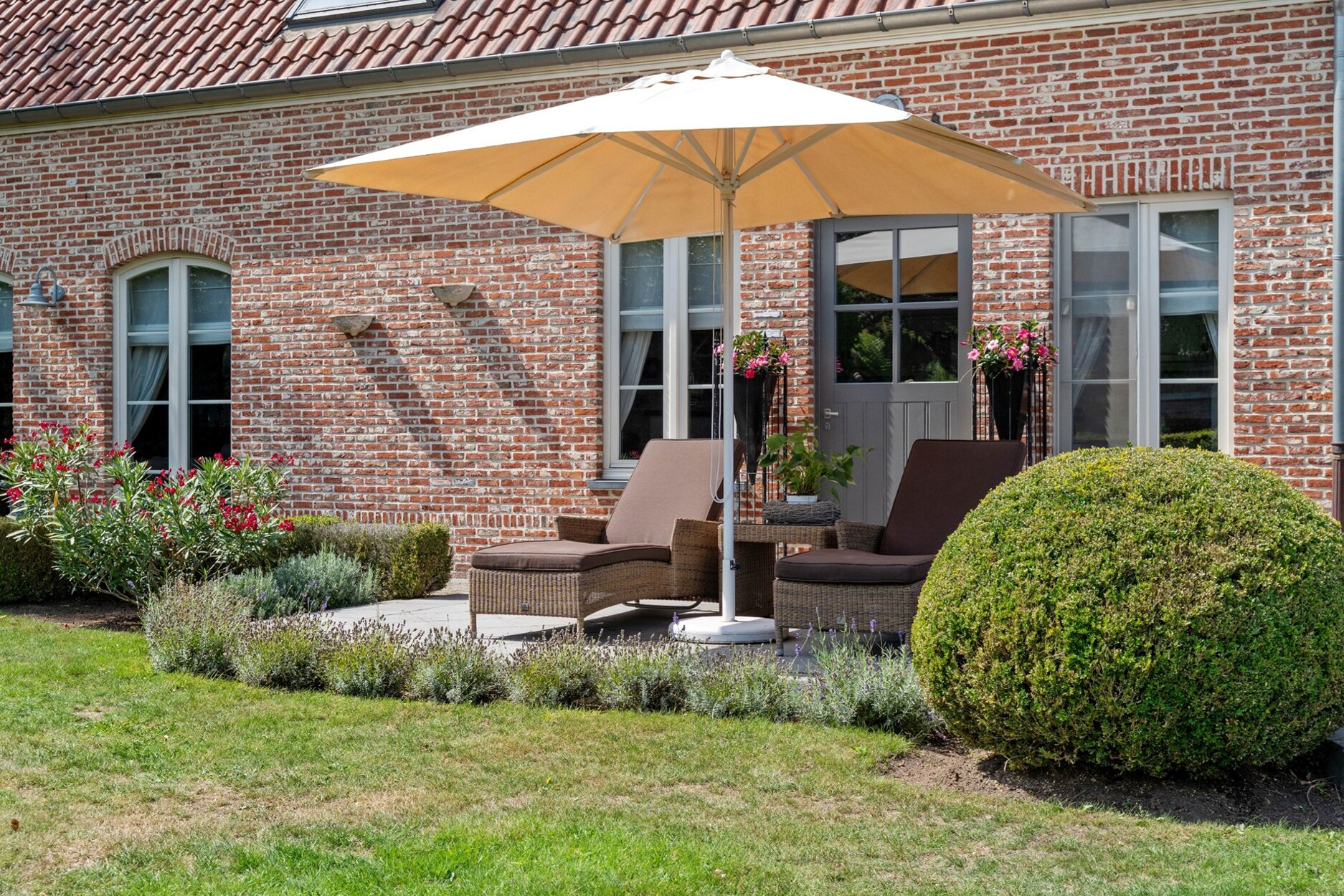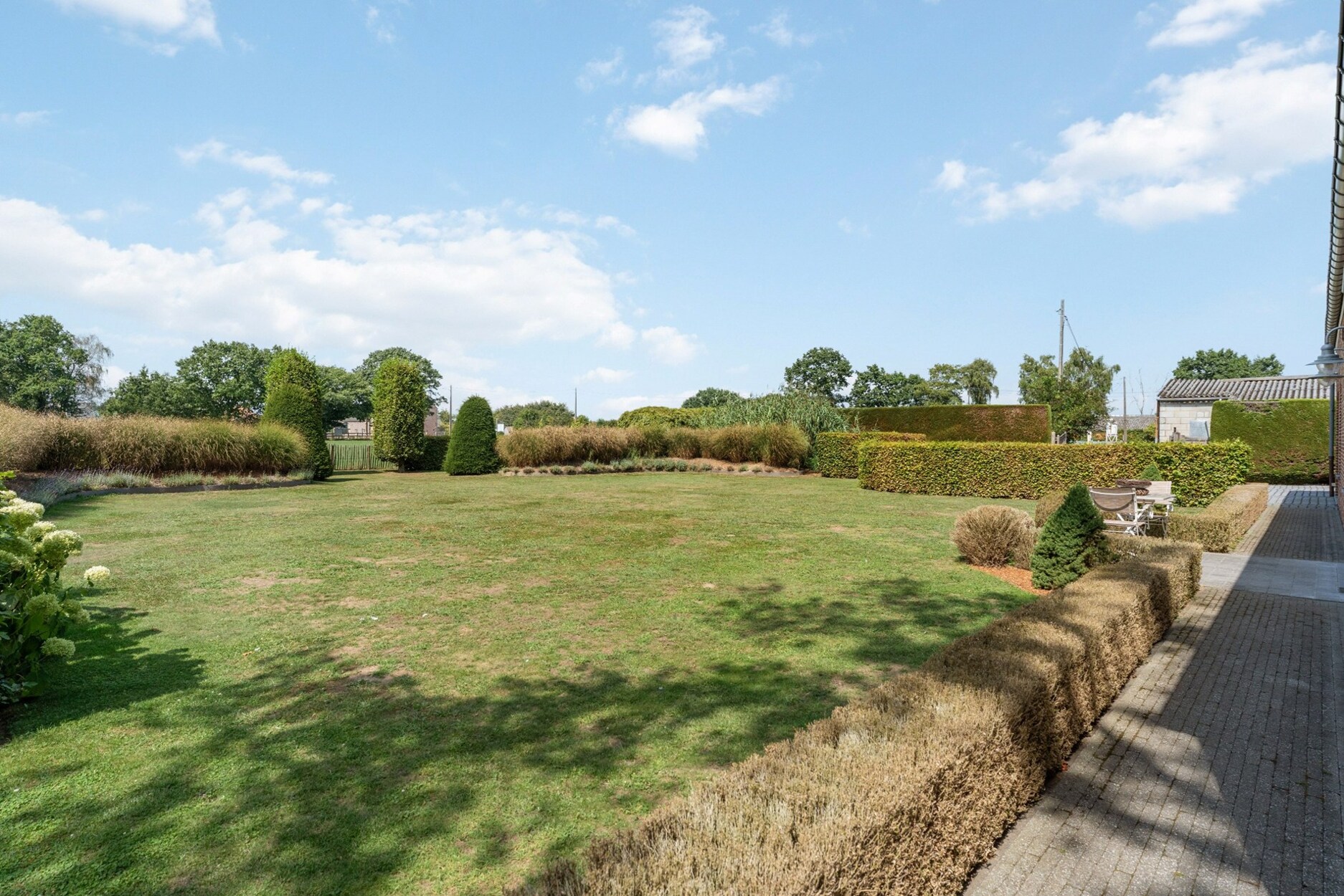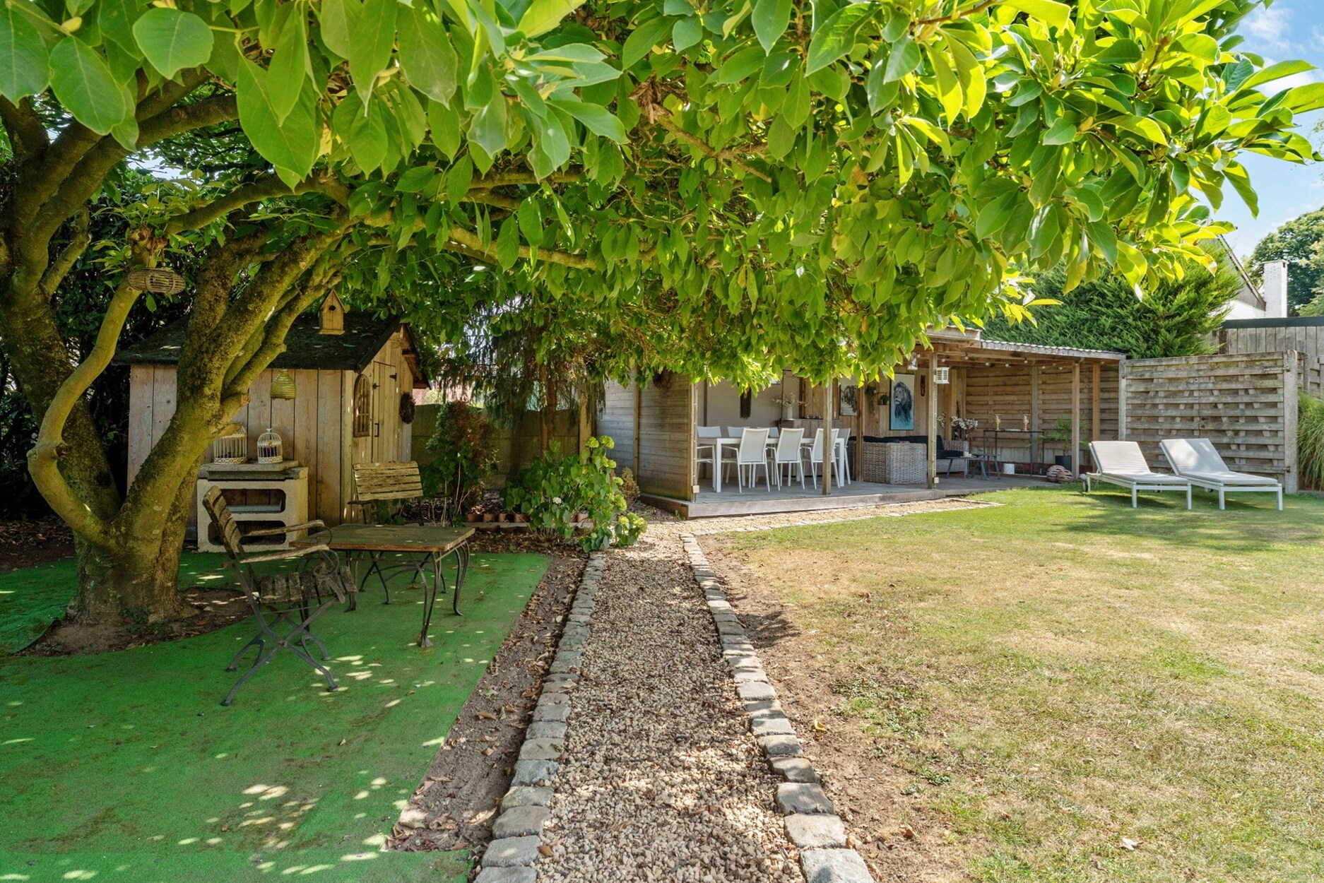 In de tuin is het aangenaam vertoeven door de zuidoost oriëntatie en het weidse uitzicht aan de voorkant van de woning. Voorts bevindt er zich een tuinhuis met overdekt terras en een bijgebouw van +/- 80m² dat dienst kan doen als werkruimte (bespreekbaar om dit al dan niet aan te kopen).