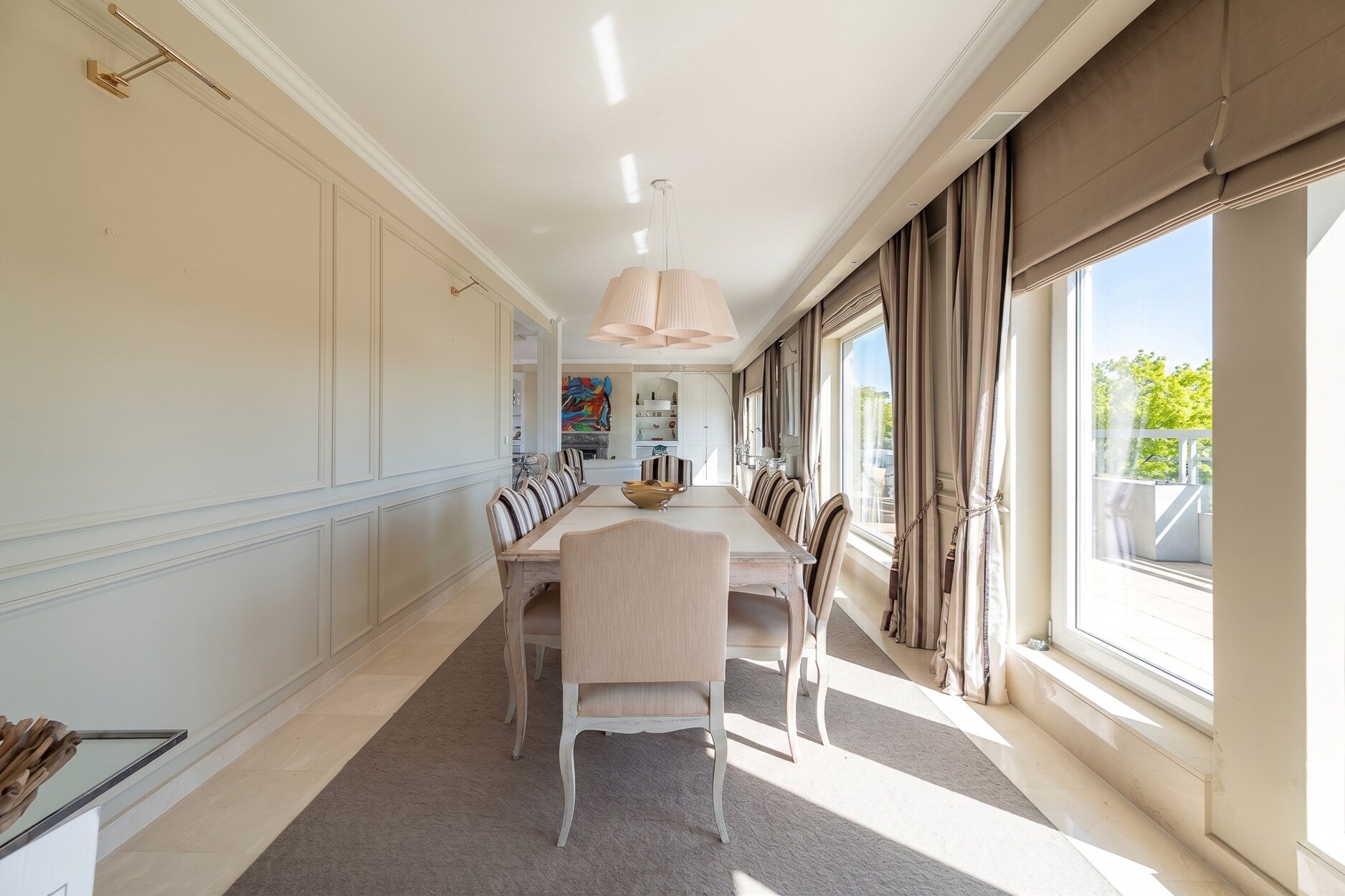 De 7e verdieping bestaat uit een inkomhal met vestiaire en gastentoilet, die leidt naar een lichtrijke leefruimte met aansluitend een doorlopend terras gericht op het noordwesten. Het nachtgedeelte omvat een master suite met dressing en badkamer, drie bijkomende slaapkamers waarvan één met eigen badkamer en toilet, een aparte douchekamer en een dressing met toegang tot een private interne lift naar de bovenverdieping.